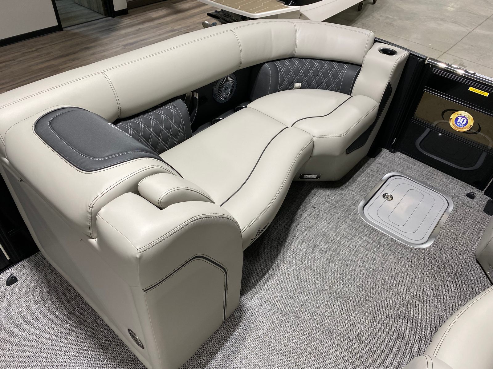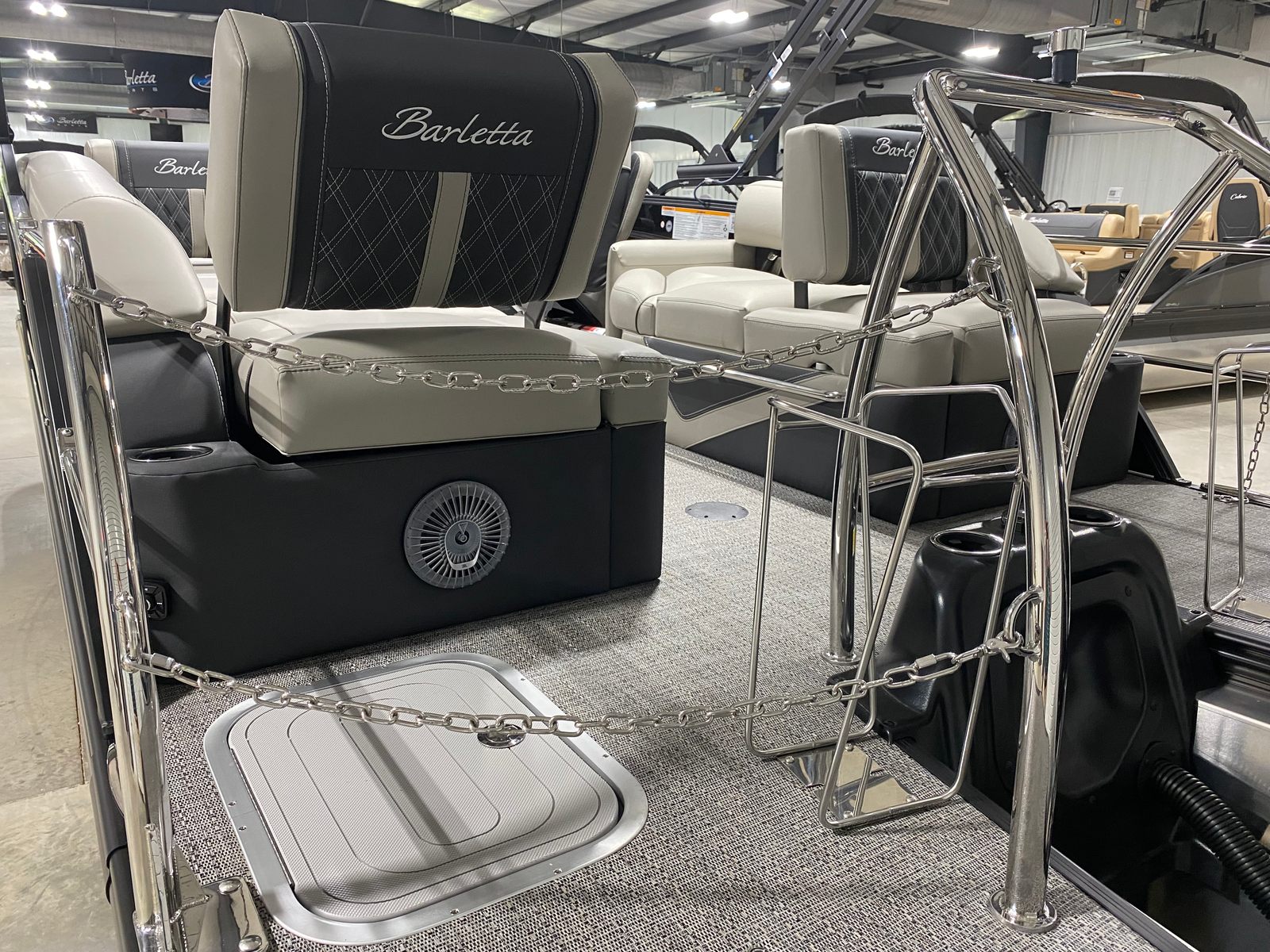 The Barletta Lusso L23M is packed with premium features designed to enhance your boating experience. The striking Black Diamond sweep and accent colors, combined with the Blackout Package Lusso railskin, create a bold and modern aesthetic that turns heads wherever you go. Inside, the Marquesan Gray/Onyx furniture offers both comfort and elegance, perfectly complemented by the Amore Gray flooring for a cohesive and inviting atmosphere.Digital gauges provide clear and accurate information at a glance, while the rigged engine with a stainless steel prop ensures durability and optimal performance. The Lusso L23M also features exterior lighting, including white underdeck and underwater lights, adding a touch of sophistication and safety for evening cruises or dockside gatherings.