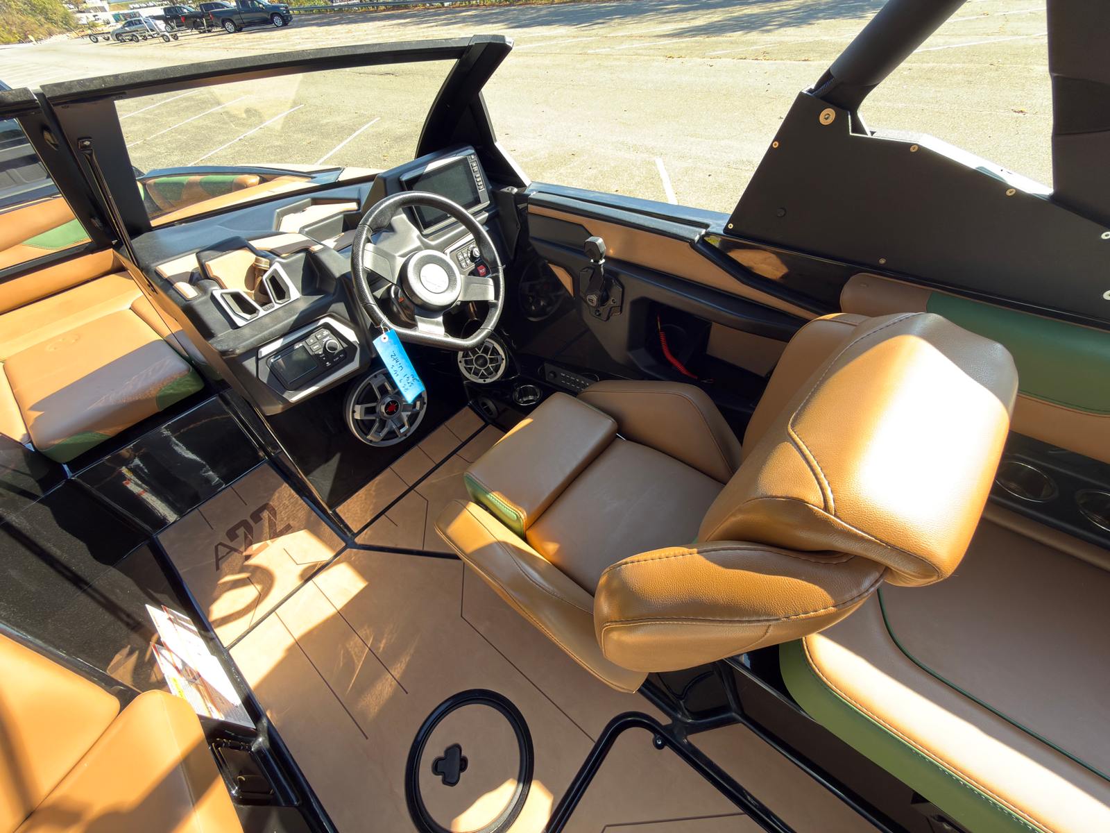 Notable features include: -Malibu M5Di engine (86 hours) -PTM Clamping racks -Extended Bimini -Wake view seating -Plug and play ballast -Cockpit soft grip flooring -Tower speakers -Matching trailer This boat is loaded out and is stunning in its Sumpter Green and Sepia Tan colorway.