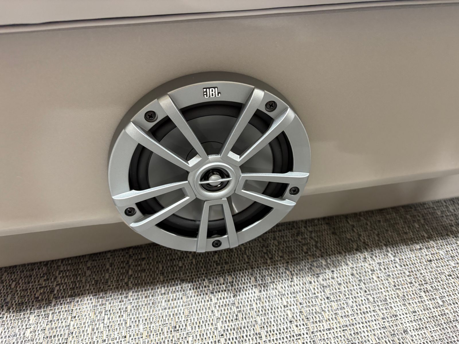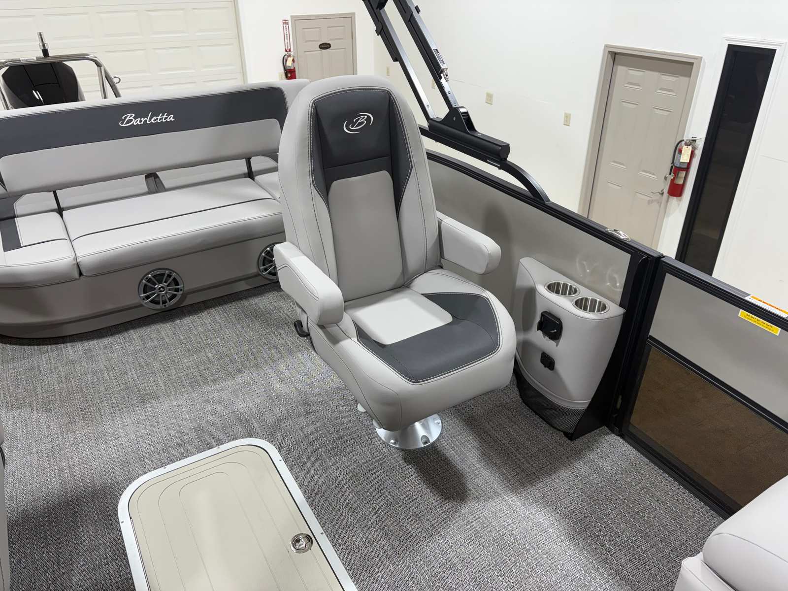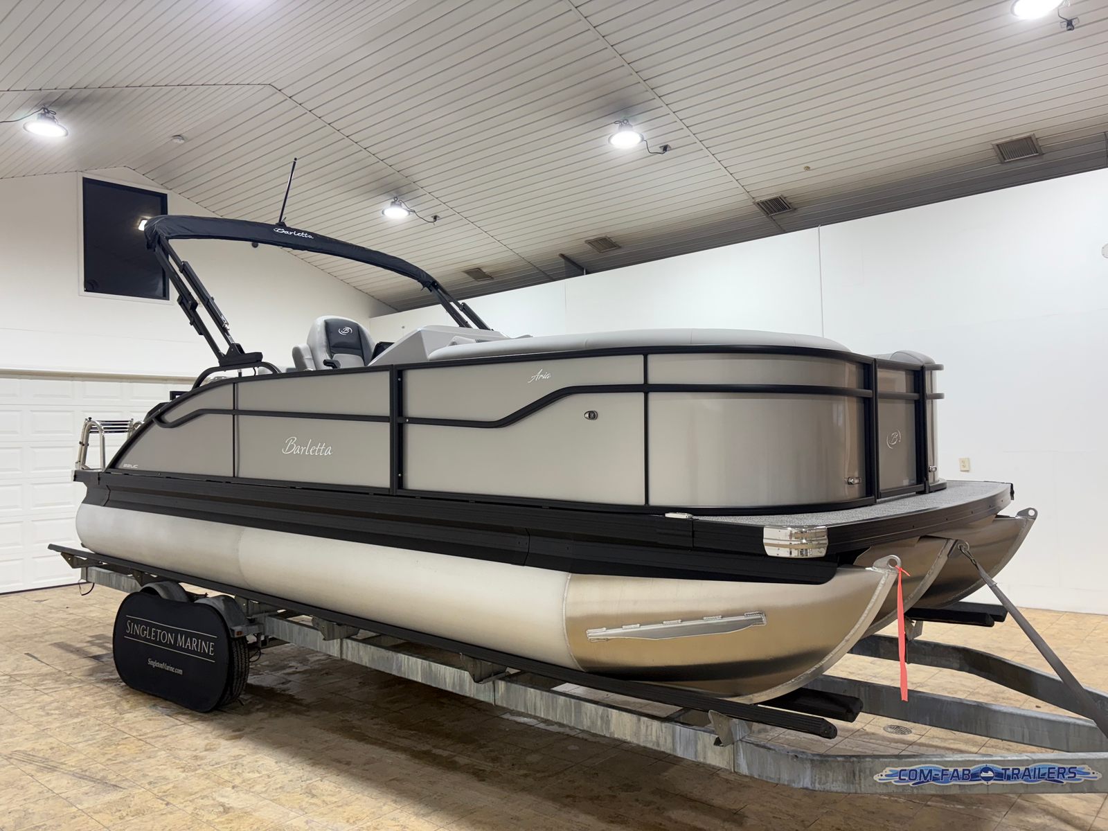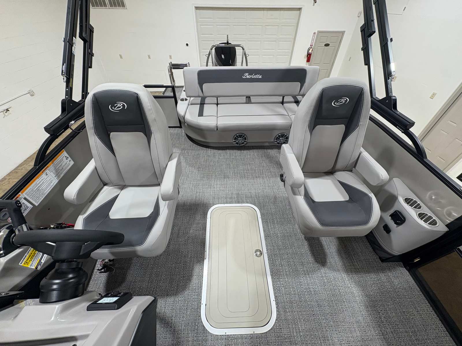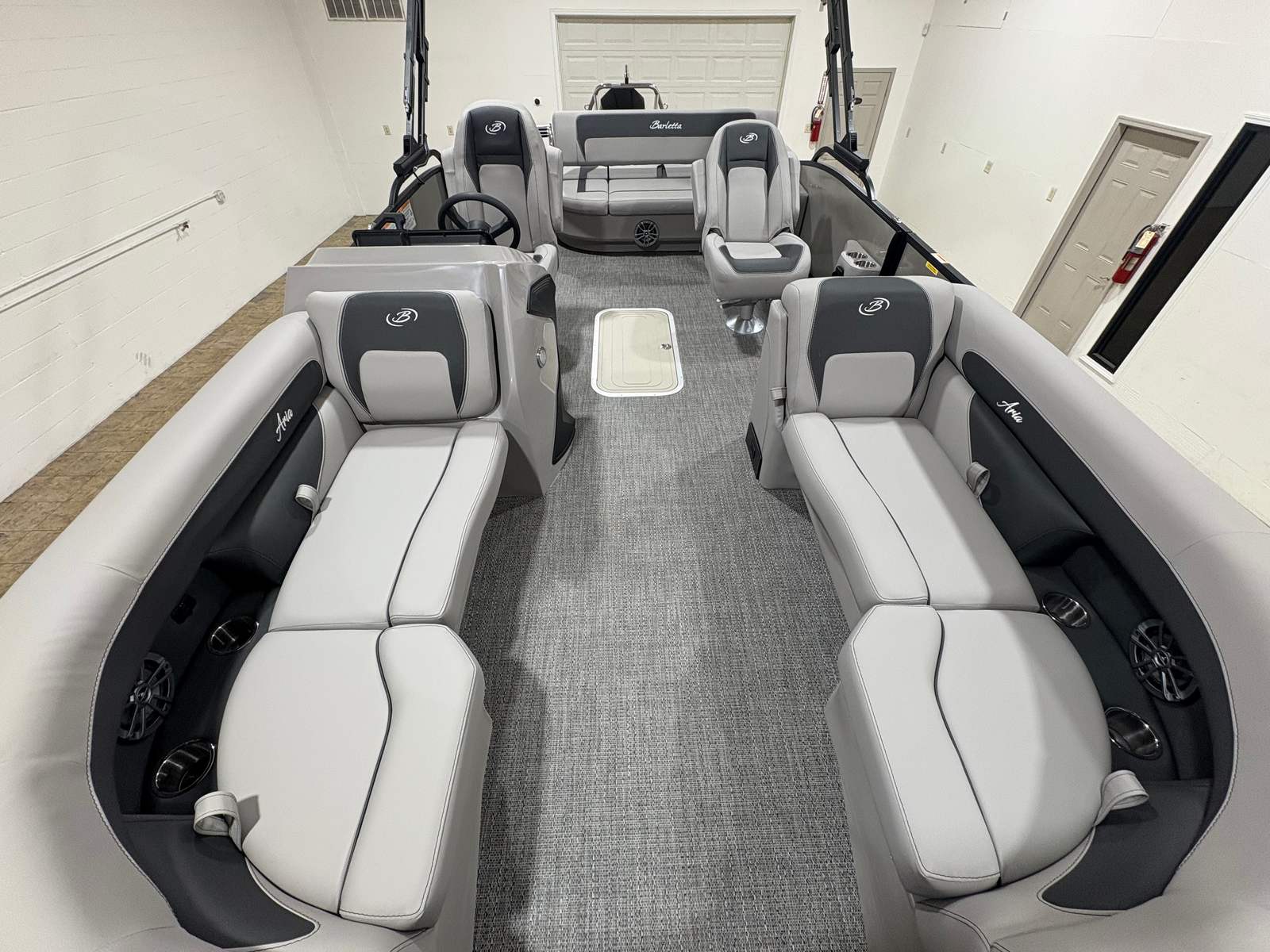 The Barletta Aria A22UC-Platinum is packed with special features that set it apart from other pontoon boats for sale. The Railskin Color Aria in Champagne and the Blackout Package Aria create a striking exterior, complemented by the stainless steel flag pole with an American flag for a touch of patriotic flair. Inside, the Tempest Gray furniture and Amore Gray flooring provide both comfort and style, while the triple toon package enhances stability and ride quality. The in-floor midship storage (available with the triple toon package) offers convenient space for stowing gear, keeping the deck clutter-free and organized. The rigging includes a stainless steel prop for superior performance and longevity, ensuring that every outing is smooth and enjoyable.