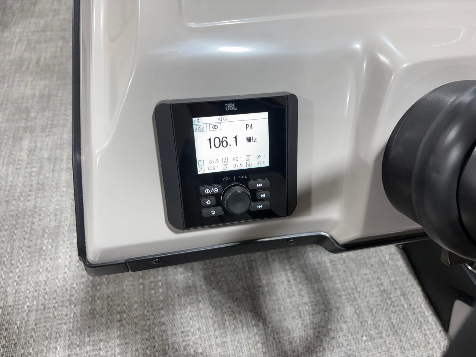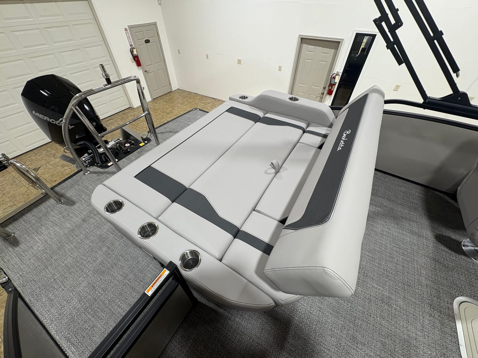 The Barletta Aria A22UC-Platinum is as practical as it is luxurious. Its manageable length makes docking and maneuvering a breeze, whether you’re at a busy marina or a quiet lakeside dock. The fuel-efficient Mercury 200L FourStroke engine helps keep operating costs low, so you can spend more time on the water and less time at the pump. The in-floor midship storage is perfect for stowing life jackets, fishing gear, or picnic supplies, keeping everything you need within easy reach. The sturdy stainless steel flag pole adds a touch of elegance and pride, while the blackout package enhances the boat’s sleek profile and protects against the elements.