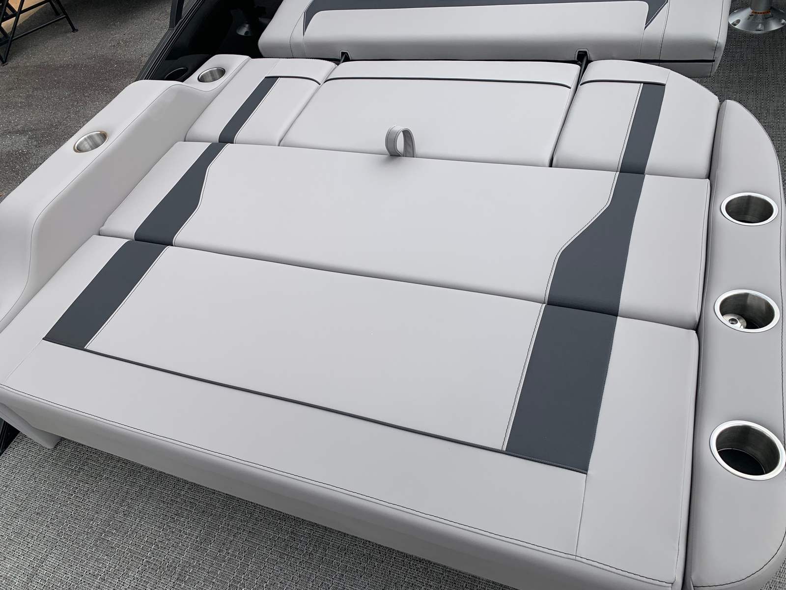Step aboard the Barletta Aria A22UC-Platinum and discover a world of thoughtful features and high-end amenities. The flooring is finished in elegant Amore Gray, providing both durability and a contemporary look that complements the overall aesthetic. The Tempest Gray furniture offers plush seating and ergonomic support, ensuring that every passenger enjoys maximum comfort during long days on the water.The Blackout Package Aria railskin package adds a touch of sophistication and modern flair to the exterior, while the stainless steel flag pole with an American flag proudly displays your love for boating and country. The helm is equipped with a Simrad 7" G07 XSE, offering advanced navigation and control at your fingertips, so you can explore new waters with confidence.One of the standout features of this pontoon is the Triple Toon Package Aria, which enhances stability, buoyancy, and overall performance. This package also enables the inclusion of in-floor midship storage, providing ample space for all your gear, water toys, and essentials. With everything neatly stowed away, you can enjoy a clutter-free deck and make the most of your time on the water.