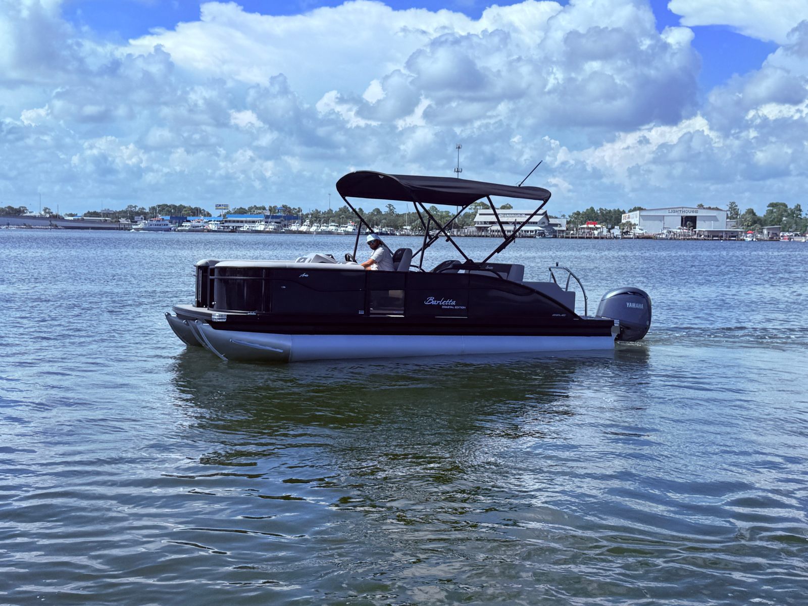 The 2026 Barletta Aria A22UC-Platinum stands out as a premier choice among pontoon boats, offering a harmonious balance of style and functionality. Measuring just over 21 feet in length, this new pontoon provides ample space for family and friends while maintaining a manageable size for easy handling and docking. The Aria A22UC-Platinum’s modern aesthetic is accentuated by the striking Black Diamond Railskin color, giving it a sophisticated and commanding presence on the water. As a new model, it comes equipped with the latest advancements in marine technology, ensuring a top-tier boating experience for years to come.