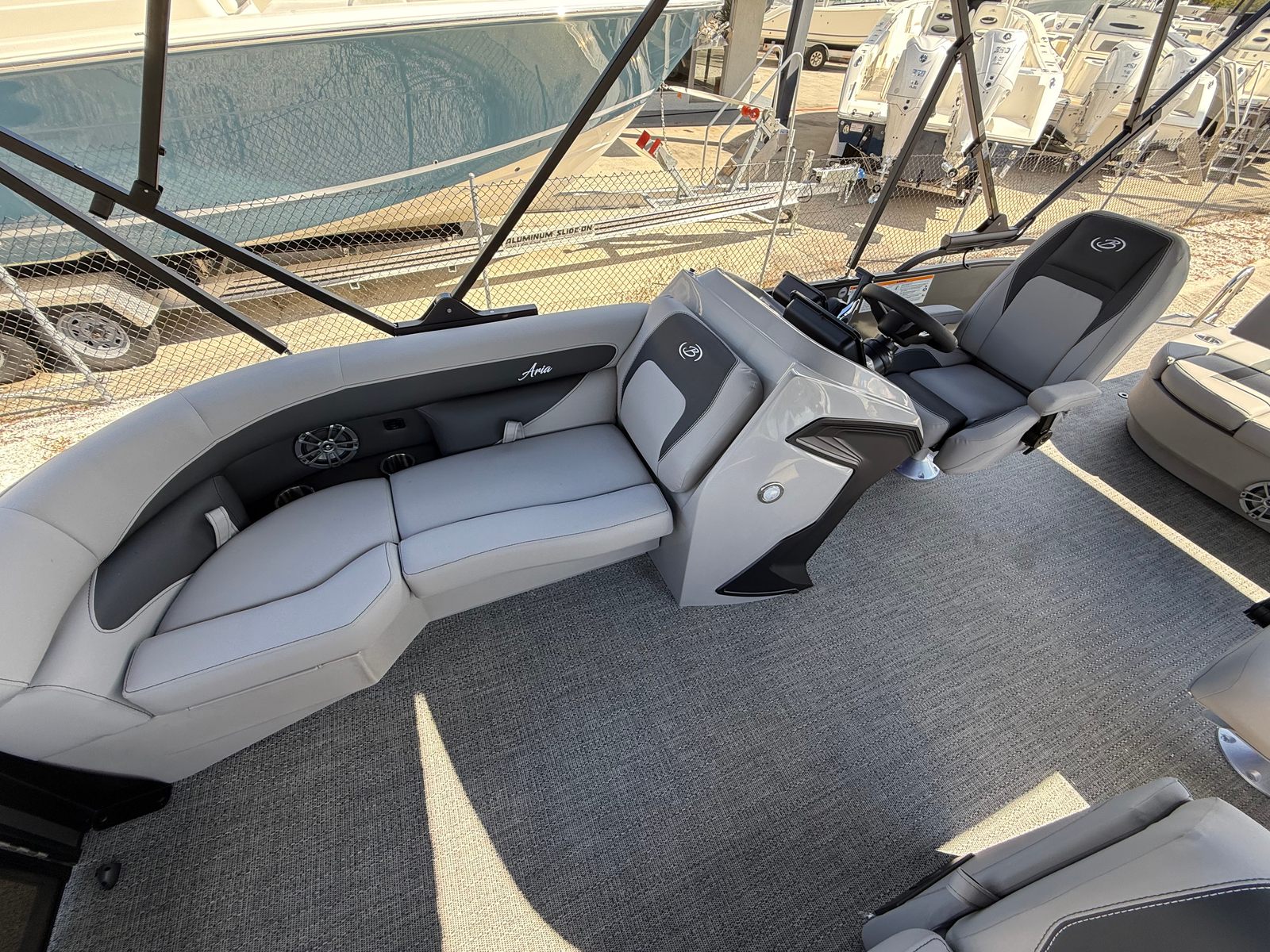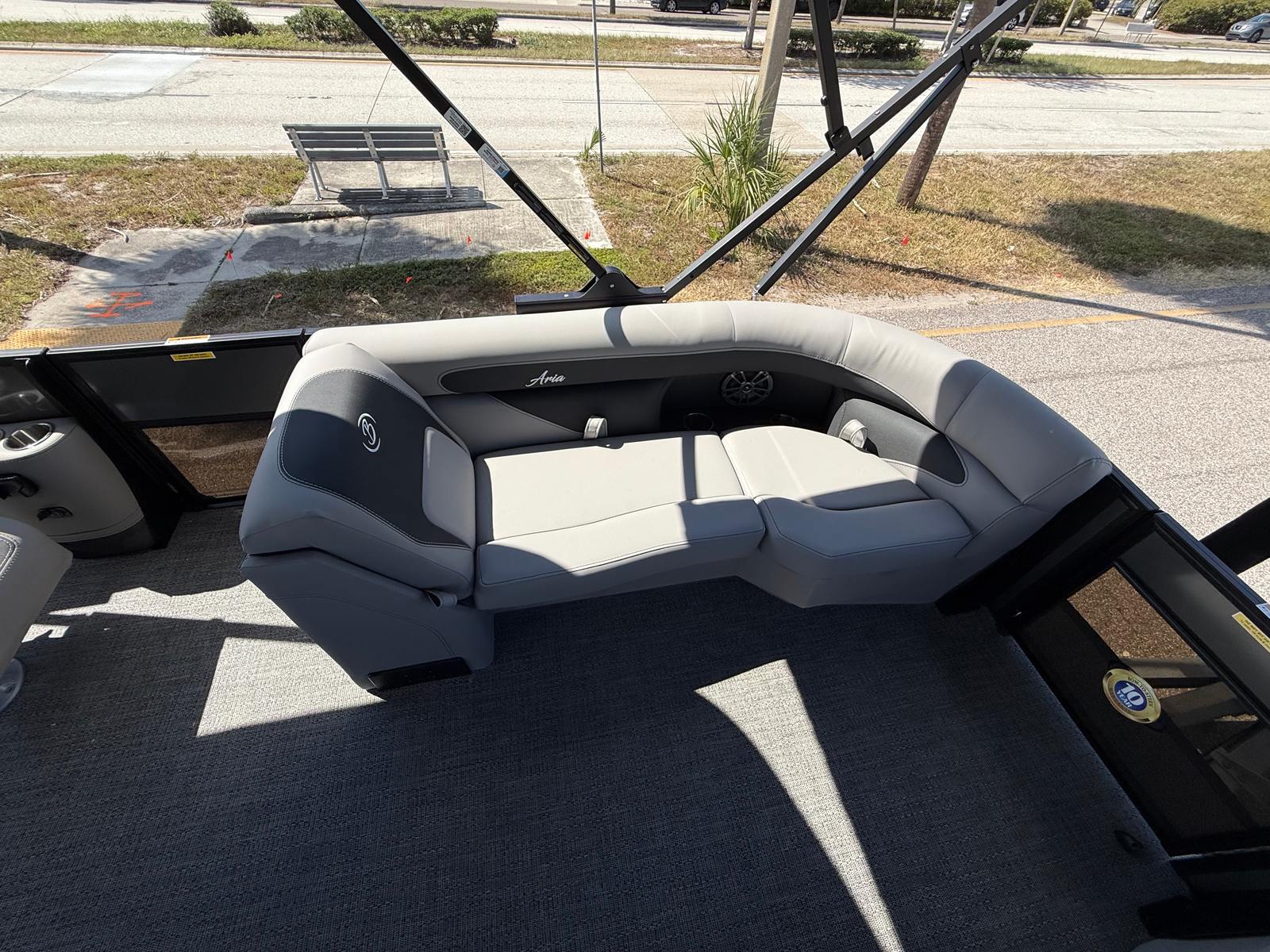 The Barletta Aria A22UC-Platinum is packed with premium features designed to enhance your boating experience. The Railskin Color Aria in Gray Moonstone and Railskin Accent Aria in Black Diamond create a visually stunning exterior, while the Blackout Package Aria adds a touch of modern sophistication. Inside, the Tempest Gray furniture offers plush seating and ample space for relaxation, complemented by the Amore Gray flooring that is both stylish and easy to maintain. The Coastal Edition Aria ensures this pontoon is ready for a variety of environments, from freshwater lakes to coastal waters. The Triple Toon Package Aria provides added stability and buoyancy, making every ride smooth and comfortable, even with a full crew on board.