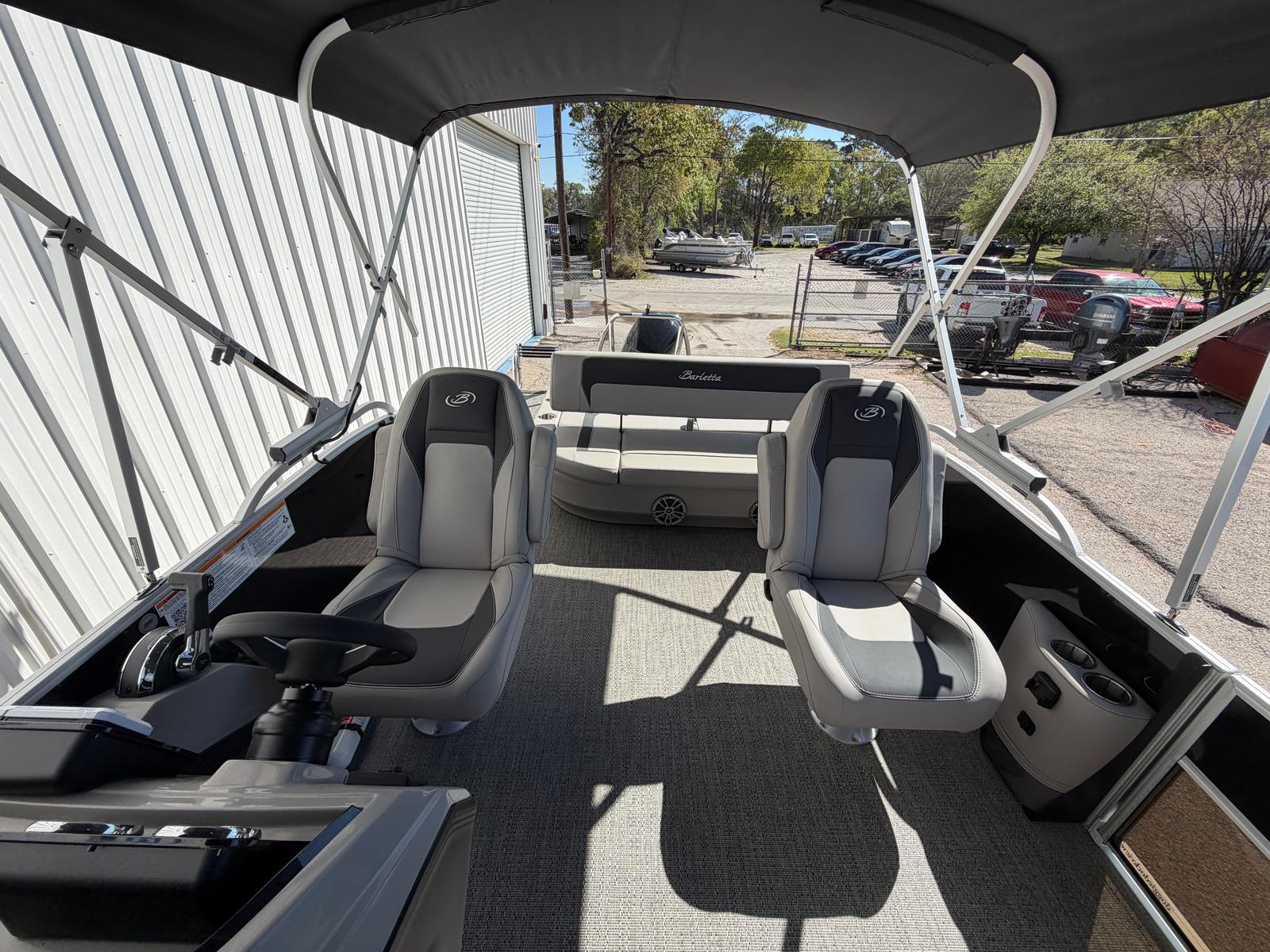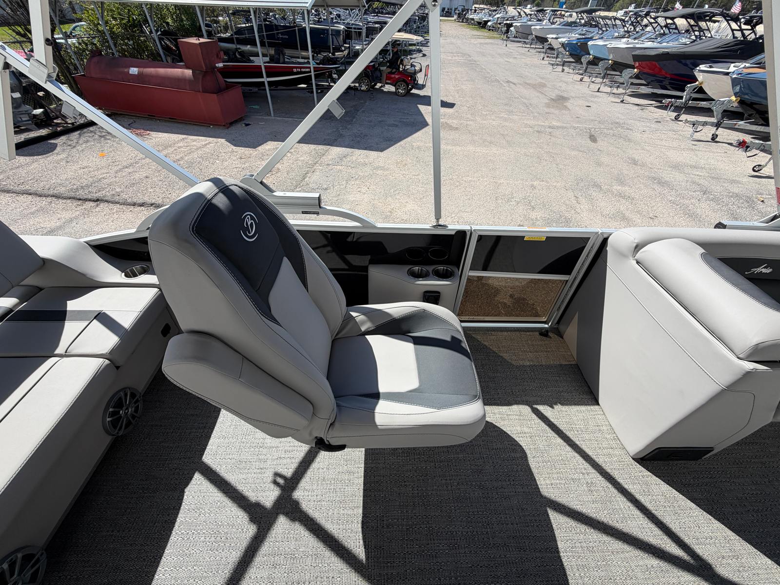 The 2026 Barletta Aria A22UC stands out as a sophisticated and spacious pontoon, measuring just over 21 feet in length. Its sleek profile and contemporary lines are accentuated by the Railskin Color Aria in Black Diamond, giving the boat a bold and elegant presence on the water. The Tempest Gray furniture and Amore Gray flooring create a modern, inviting atmosphere, making every trip feel like a getaway. As a new pontoon boat, the Aria A22UC offers the latest in comfort, safety, and technology, ensuring you enjoy peace of mind and pride of ownership from day one.