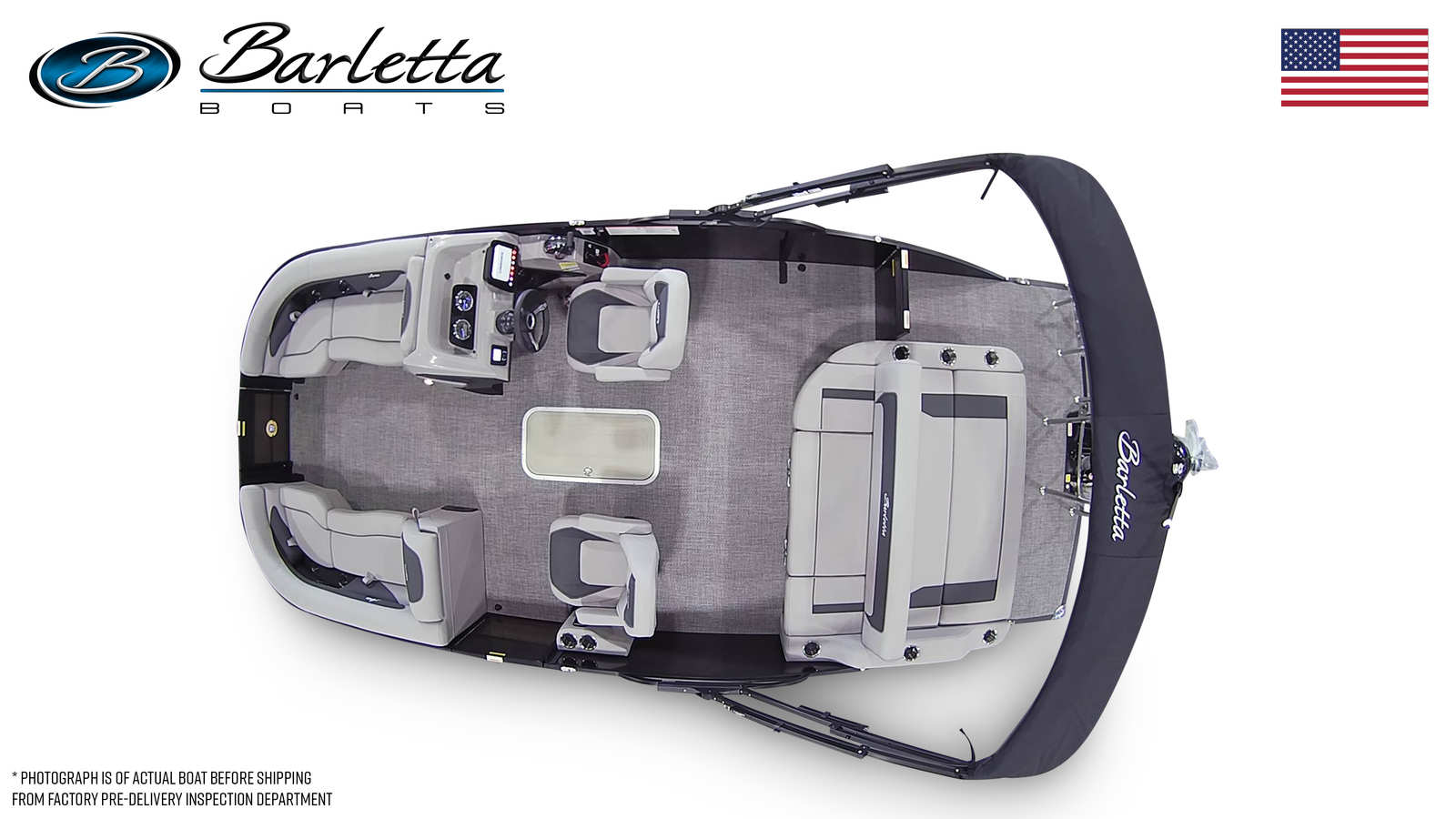 The Barletta Aria A22UC is packed with special features that elevate your boating experience. The Railskin Color Aria in Black Diamond gives the exterior a sophisticated and modern look, while the Blackout Package Aria adds a touch of elegance and exclusivity. The Triple Toon Package Aria enhances stability and performance, making this pontoon ideal for a variety of water activities. Inside, you’ll find Amore Gray flooring and Tempest Gray furniture, creating a comfortable and inviting atmosphere for passengers. The in-floor midship storage (available with the Triple Toon configuration) provides convenient space for stowing gear, keeping the deck clutter-free and organized.The helm is equipped with the Eagle 5 GPS, offering advanced navigation capabilities to help you explore new waters with ease. On the exterior, the stainless steel flag pole with an American flag adds a patriotic flair, making your boat stand out at any marina or dock. Every detail has been thoughtfully designed to enhance both aesthetics and functionality, ensuring that your time on the water is as enjoyable as possible.