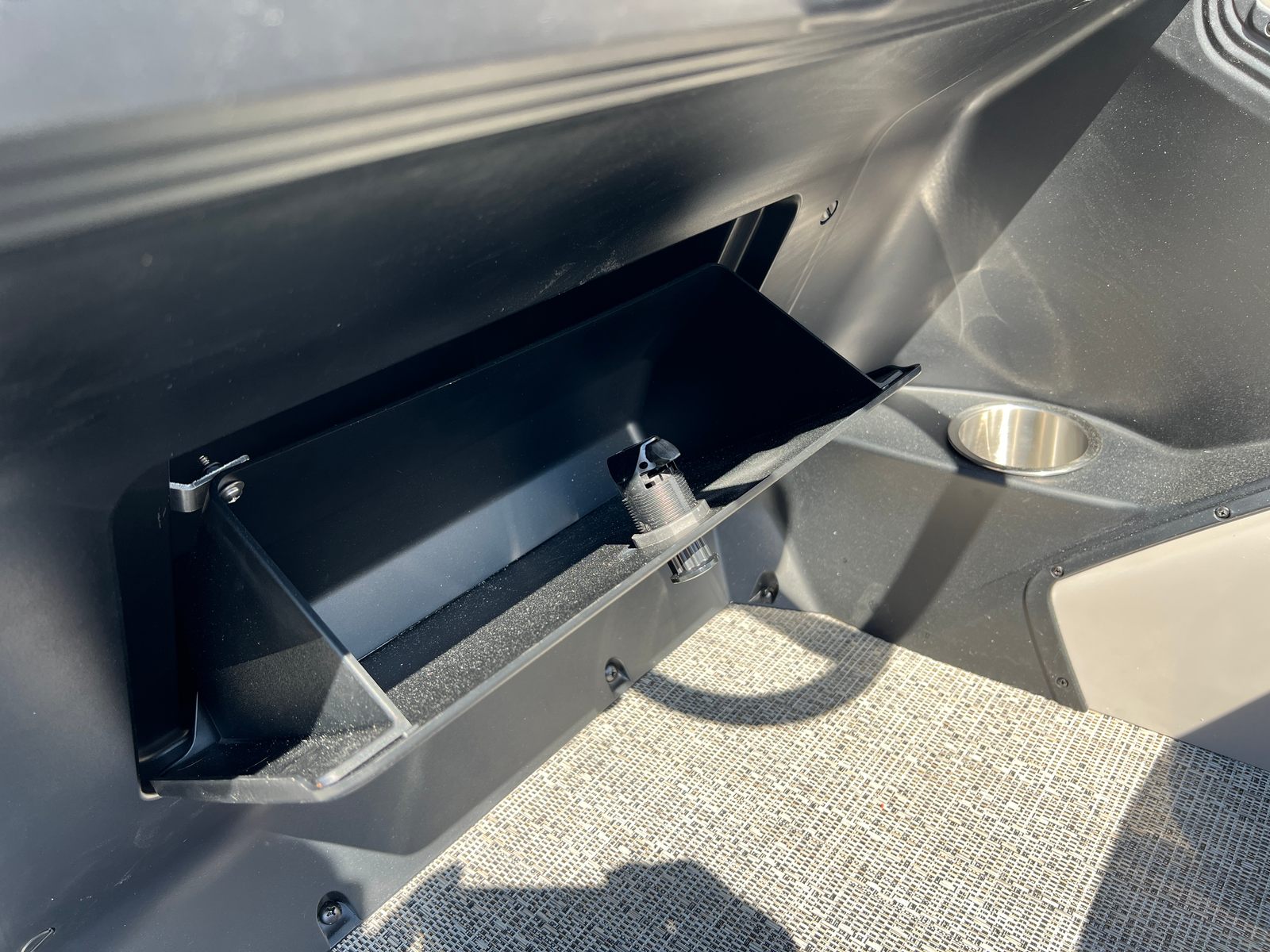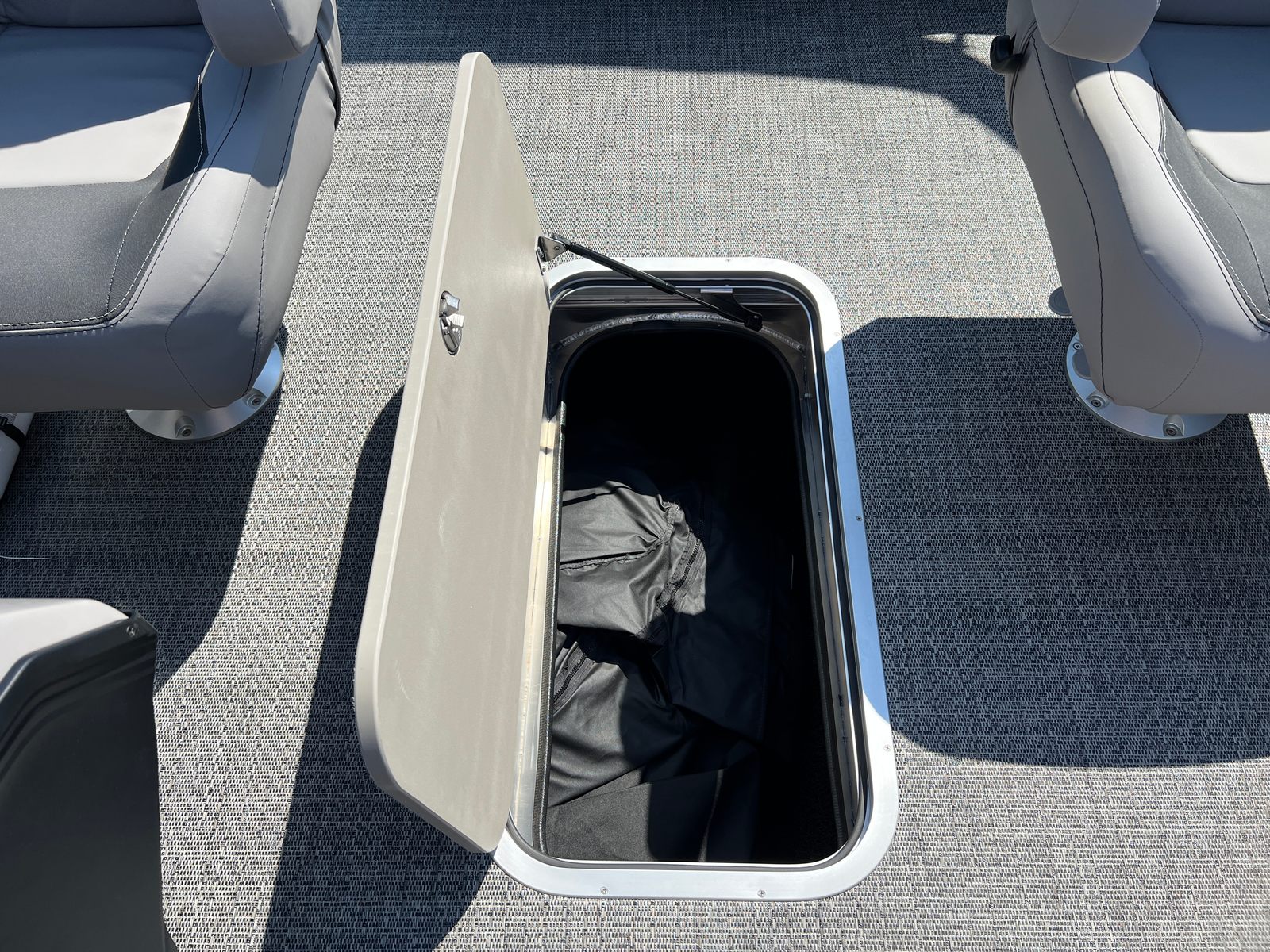The 2026 Barletta Aria A22UC is loaded with features that set it apart from other pontoon boats for sale. The Railskin Color Aria in Matte Black, complemented by the Blackout Package Aria, gives this pontoon a striking and contemporary appearance that is sure to turn heads at the dock. The Tempest Gray furniture provides a sophisticated and inviting atmosphere, while the Amore Gray flooring is both stylish and easy to maintain. The in-floor midship storage offers a convenient solution for stowing away gear, water toys, and personal items, keeping the deck clutter-free and organized. A stainless steel flag pole with an American flag adds a patriotic touch, perfect for celebrating holidays or simply showing your pride on the water.