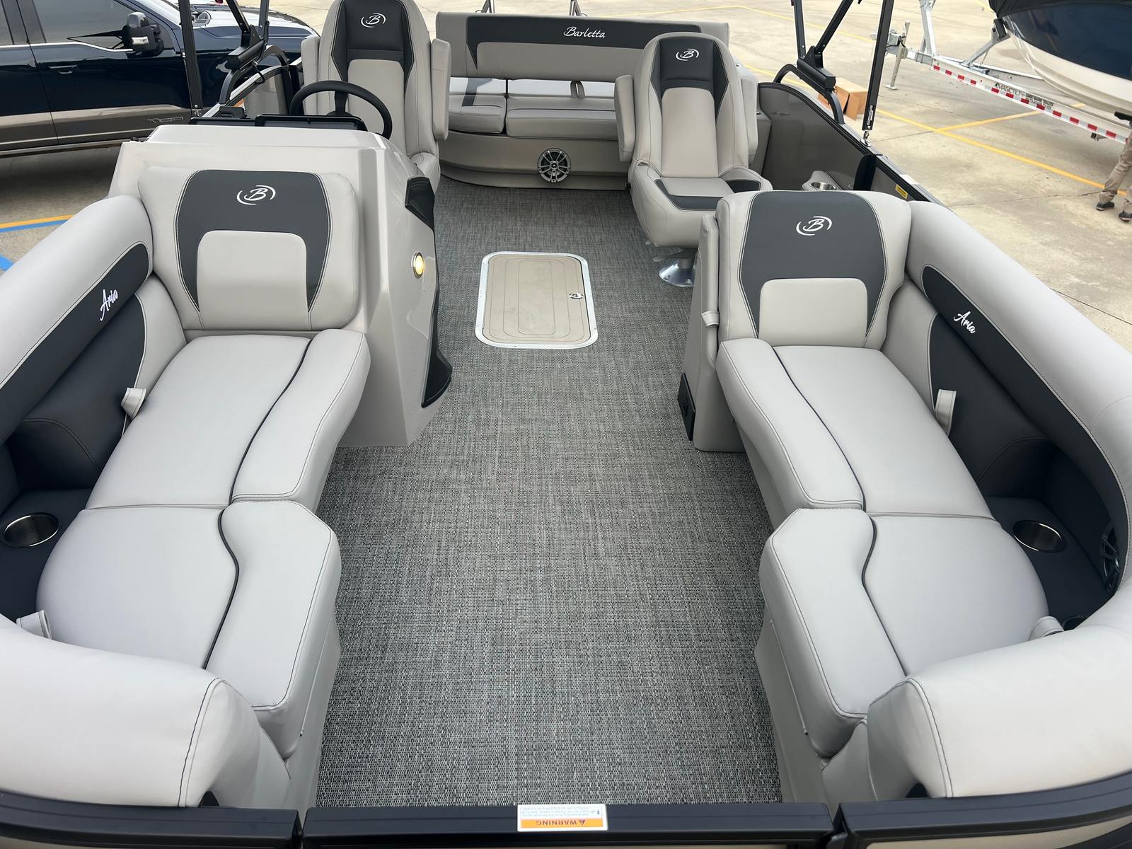 The 2026 Barletta Aria A22UC is packed with features designed to maximize comfort, convenience, and style. The Railskin Color Aria in Champagne, complemented by the Blackout Package Aria, creates a sophisticated exterior that is both eye-catching and timeless. Inside, the Tempest Gray furniture provides plush seating and a modern aesthetic, while the Amore Gray flooring offers durability and easy maintenance.The Triple Toon Package Aria adds an extra pontoon for enhanced stability and performance, making this pontoon boat ideal for a variety of activities. The onboard battery charger ensures your electronics and accessories are always ready for use, while the stainless steel flag pole with an American flag adds a patriotic touch to your boating adventures. Every detail of the Aria A22UC is thoughtfully designed to enhance your time on the water.