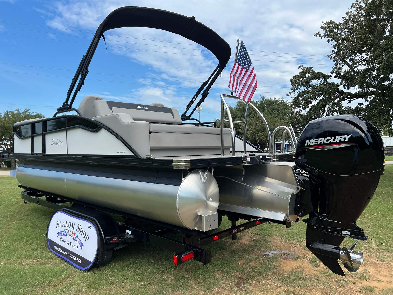 The Barletta Aria A22UC is as practical as it is stylish, offering features that make ownership easy and enjoyable. The spacious deck and smart layout provide ample storage for gear, snacks, and essentials, keeping your space organized and clutter-free. The efficient Mercury engine helps maximize fuel economy, so you can spend more time on the water and less time refueling. Docking is a breeze thanks to the responsive handling and maneuverability provided by the Triple Toon Package Aria, making it simple to navigate marinas and tight spaces.Maintenance is straightforward with high-quality materials and durable finishes throughout, ensuring your pontoon boat stays looking great season after season. The stainless steel flag pole with an American flag adds a unique touch to your vessel, making it easy to spot and adding a sense of pride to your boating experience.