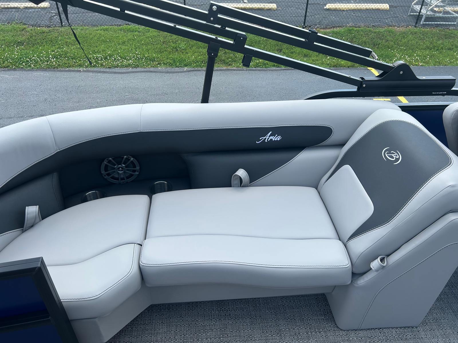 The Barletta Aria A24QC is loaded with features that set it apart from other pontoon boats for sale. The striking Bohemian Blue railskin color, complemented by the Blackout Package Aria, gives this pontoon a sleek and modern appearance that is sure to turn heads at the dock. Inside, the Tempest Gray furniture provides a sophisticated and inviting atmosphere, while the Amore Gray flooring is both stylish and easy to maintain.One of the standout features of this model is the in-floor midship storage, offering convenient space for stowing gear, water toys, and personal items. The stainless steel flag pole with an American flag adds a patriotic touch, perfect for holiday outings and special occasions. The rig engine with a stainless steel prop ensures optimal performance and longevity, while the Mercury pre-rig with power assist makes operation smooth and intuitive.