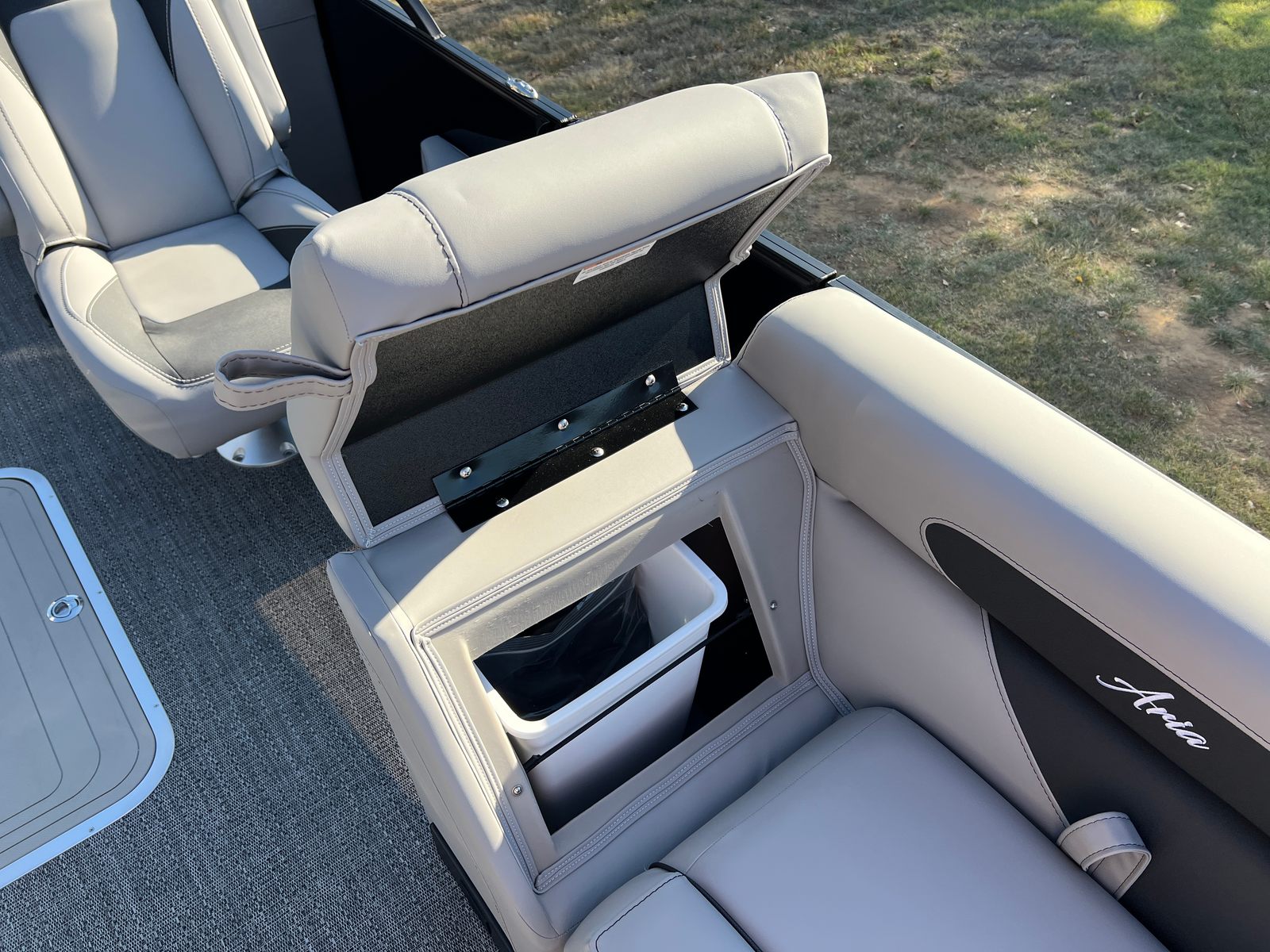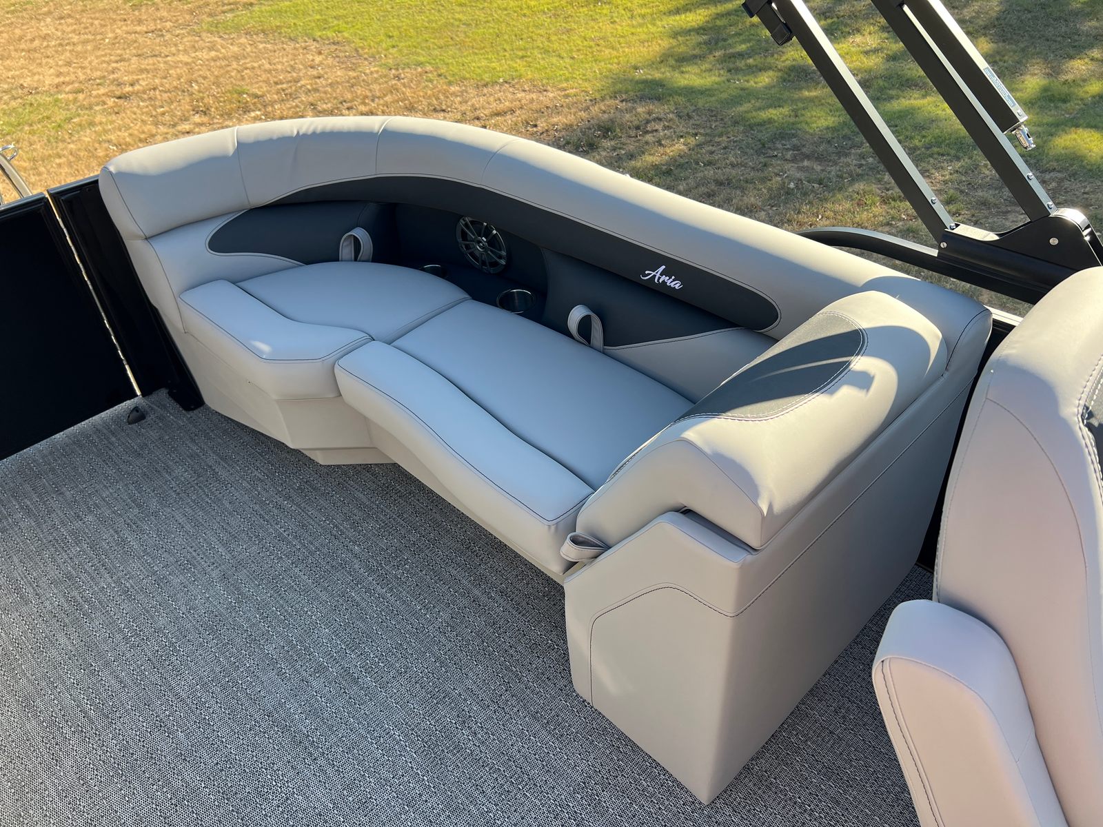 The Barletta Aria A24QC is loaded with premium features that set it apart from other pontoon boats for sale. The Railskin Color Aria in Black Diamond, combined with the Blackout Package Aria, gives the boat a bold and contemporary look. The furniture is finished in Tempest Gray, offering both comfort and elegance, while the Amore Gray flooring adds a touch of sophistication and is easy to maintain. The in-floor midship storage provides ample space for all your gear, keeping the deck clutter-free and organized. A stainless steel flag pole with an American flag adds a patriotic flair, making your boat stand out on the water.