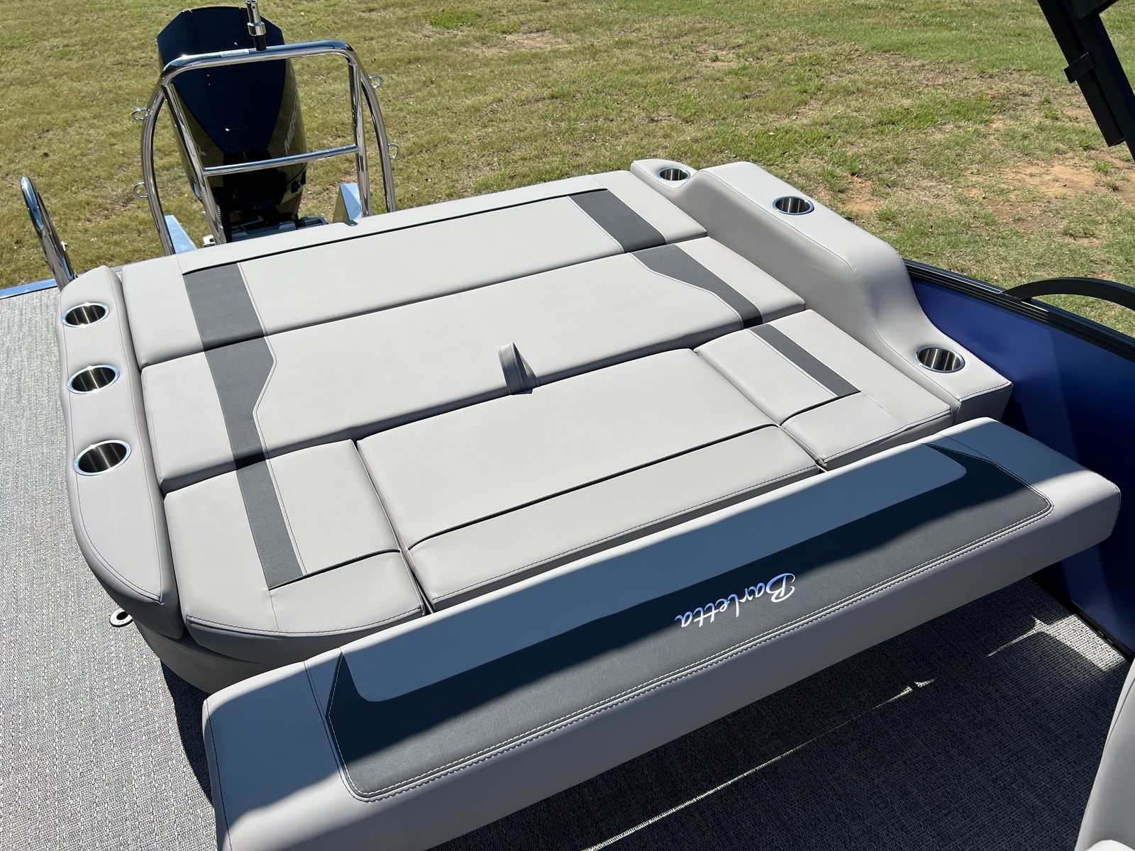 The Barletta Aria A24UC is a 2026 model, measuring just over 23 feet in length. This spacious pontoon boat offers ample room for family, friends, and all your favorite activities. Its sleek profile and modern lines are accentuated by the Pacific Matte Blue Railskin color, complemented by the Black Diamond accent and the striking Blackout Package Aria. The combination of Tempest Gray furniture and Amore Gray flooring creates a sophisticated and inviting atmosphere, making every outing feel like a luxury escape. Whether you’re cruising, entertaining, or simply relaxing, this Barletta boat for sale delivers a premium experience from bow to stern.