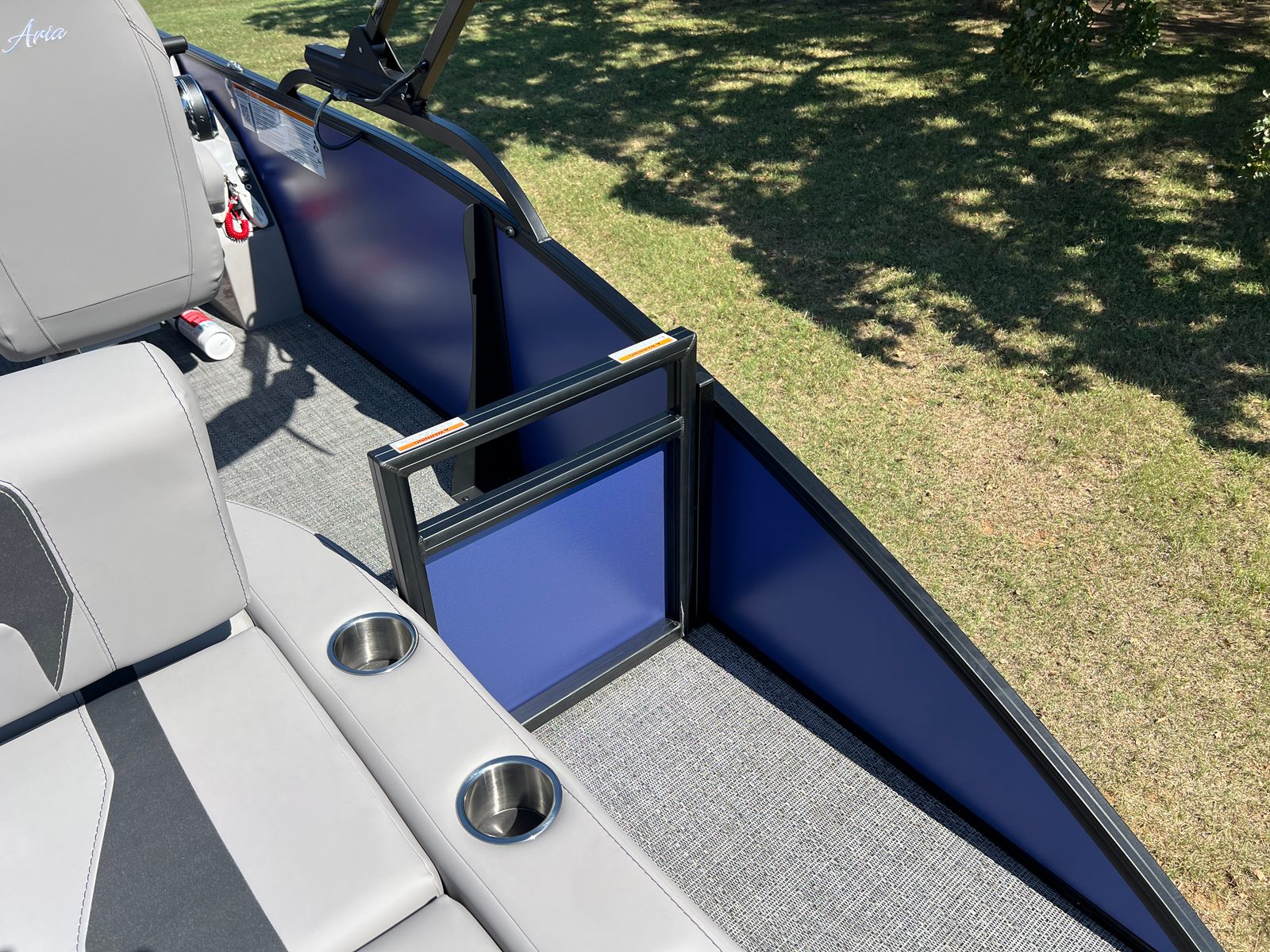 The Barletta Aria A24UC is packed with special features designed to elevate your boating experience. The Pacific Matte Blue Railskin color and Black Diamond accent give the exterior a bold, contemporary look, while the Blackout Package Aria adds a touch of sophistication. Inside, the Tempest Gray furniture provides plush seating and ample lounging space, perfectly complemented by the Amore Gray flooring for a cohesive and stylish interior. The Triple Toon Package Aria ensures enhanced stability and performance, making every ride smooth and enjoyable. The Mercury 200L FourStroke engine is pre-rigged with mechanical power assist, and the rigging includes a stainless steel prop for optimal efficiency. Adding a patriotic touch, the stainless steel flag pole with an American flag is a standout feature that celebrates your love for boating and the open water.