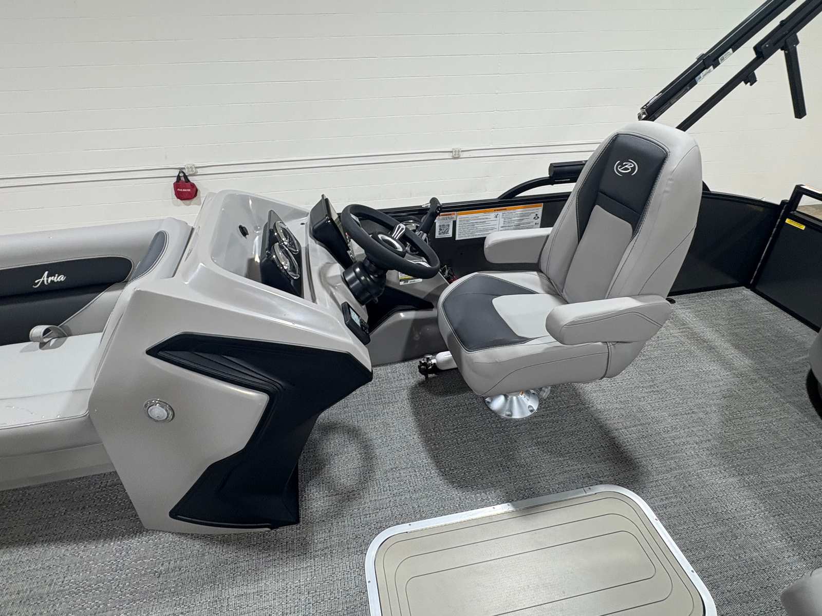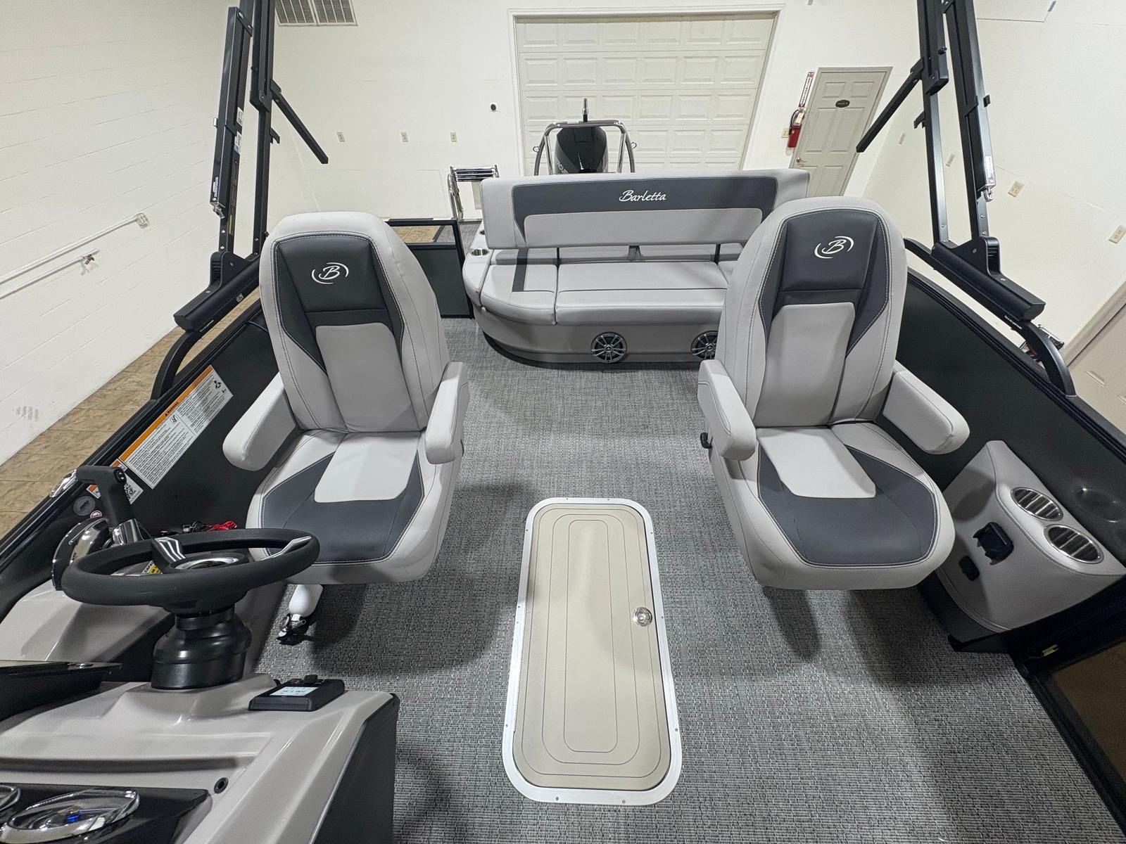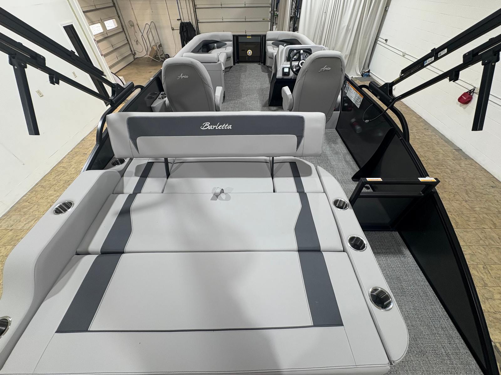 The Barletta Aria A24UC is packed with special features that elevate your boating experience. The Railskin Color Aria in Gray Moonstone and the Blackout Package Aria create a striking exterior that turns heads at every dock. The furniture, finished in Tempest Gray, offers plush seating and a sophisticated look, while the Amore Gray flooring provides both comfort and durability underfoot. The Triple Toon Package Aria enhances stability and ride quality, making this pontoon boat ideal for larger groups and choppy waters.Inside, you’ll find in-floor midship storage (available with the Triple Toon configuration), offering convenient space for gear, water toys, and personal items. The exterior is adorned with a stainless steel flag pole and an American flag, adding a touch of patriotic flair and elegance. Every detail, from the premium materials to the thoughtful layout, is designed to maximize comfort and usability.