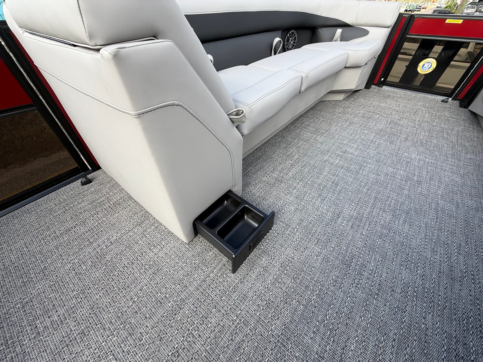 The Barletta Aria A24UC is packed with special features that set it apart from other pontoon boats for sale. The Railskin Color Aria in Red Garnet and Railskin Accent Aria in Gray Moonstone create a striking visual impression, while the Blackout Package Aria adds a touch of sophistication and modern flair. The Tempest Gray furniture offers plush seating, ensuring comfort for you and your guests throughout the day. The flooring, finished in Amore Gray, is both stylish and practical, providing a durable surface that’s easy to maintain. The Coastal Edition Aria brings enhanced corrosion resistance and durability, making this pontoon ideal for both freshwater and saltwater environments. The Triple Toon Package Aria delivers superior stability, buoyancy, and handling, elevating your boating experience to new heights.