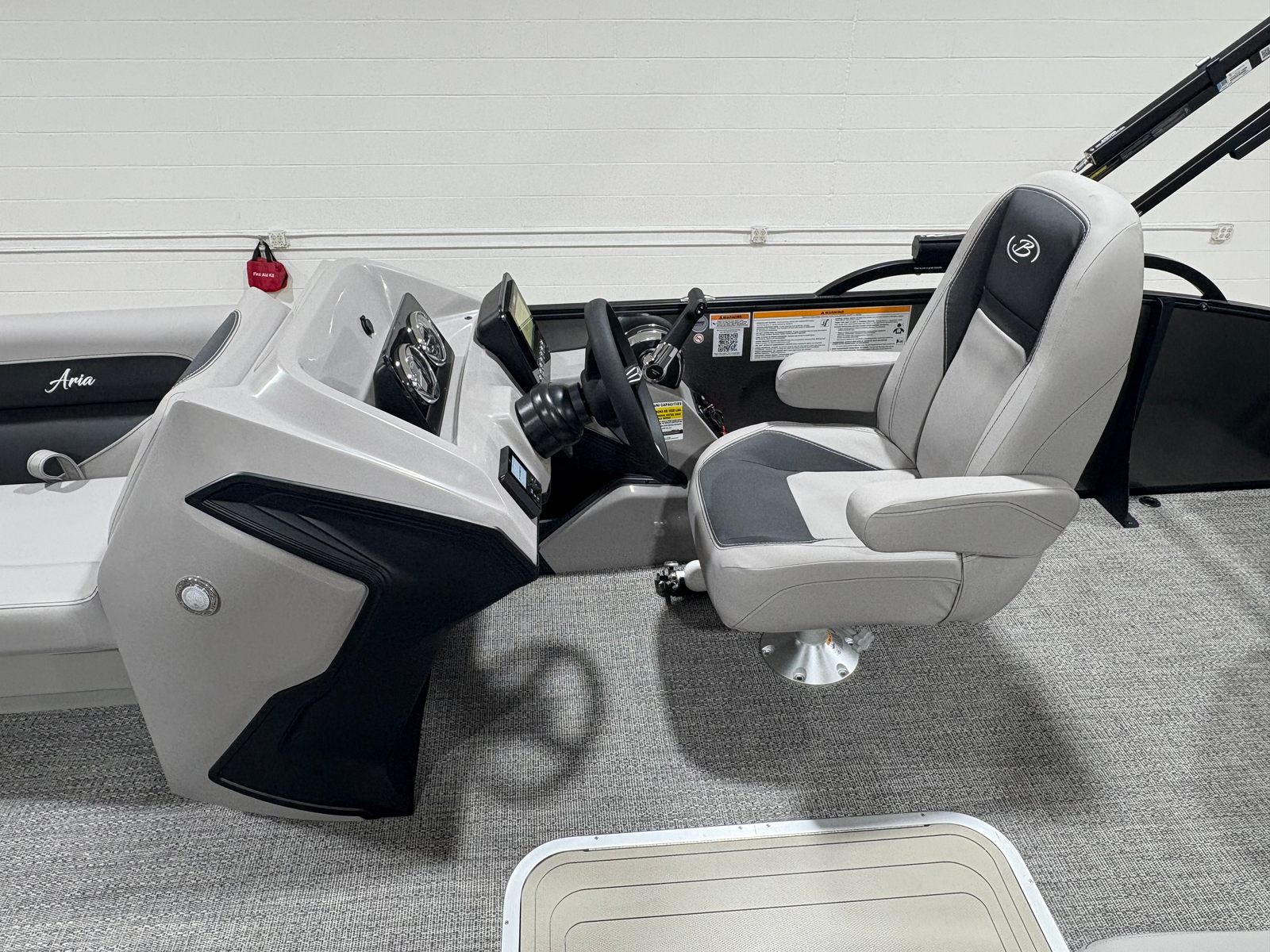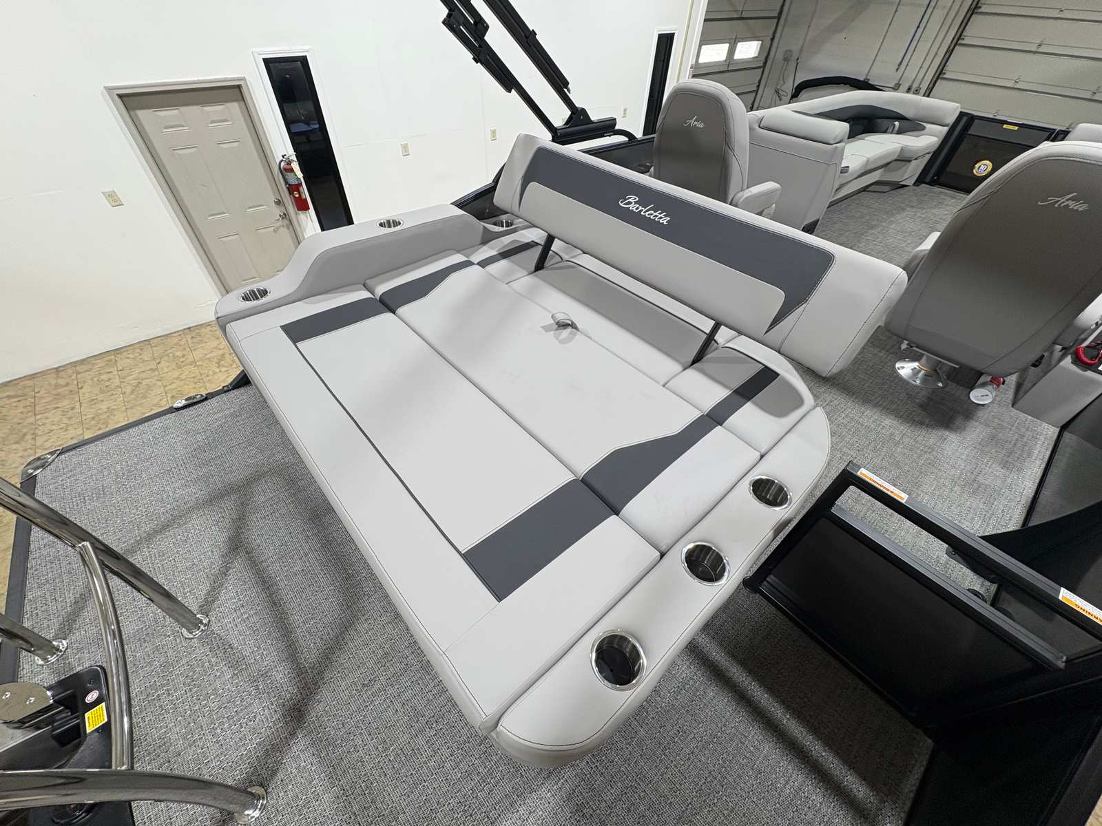 The 2026 Barletta Aria A24UC is loaded with features that enhance both its functionality and aesthetic appeal. The Railskin Color Aria in Gray Moonstone, paired with the Blackout Package Aria, creates a striking exterior that is both modern and timeless. Inside, the Tempest Gray furniture offers plush seating and a luxurious feel, while the Amore Gray flooring is both stylish and easy to maintain. The Triple Toon Package Aria provides added buoyancy and stability, making this pontoon perfect for larger groups or those who want extra peace of mind on the water.For those who value convenience and practicality, the in-floor midship storage (available with the Triple Toon Package) offers ample space to stow away gear, water toys, or picnic supplies, keeping the deck clutter-free and organized. The stainless steel flag pole with an American flag adds a patriotic touch and a sense of pride to your boating experience. The rigging includes a stainless steel prop, ensuring long-lasting performance and minimal maintenance.