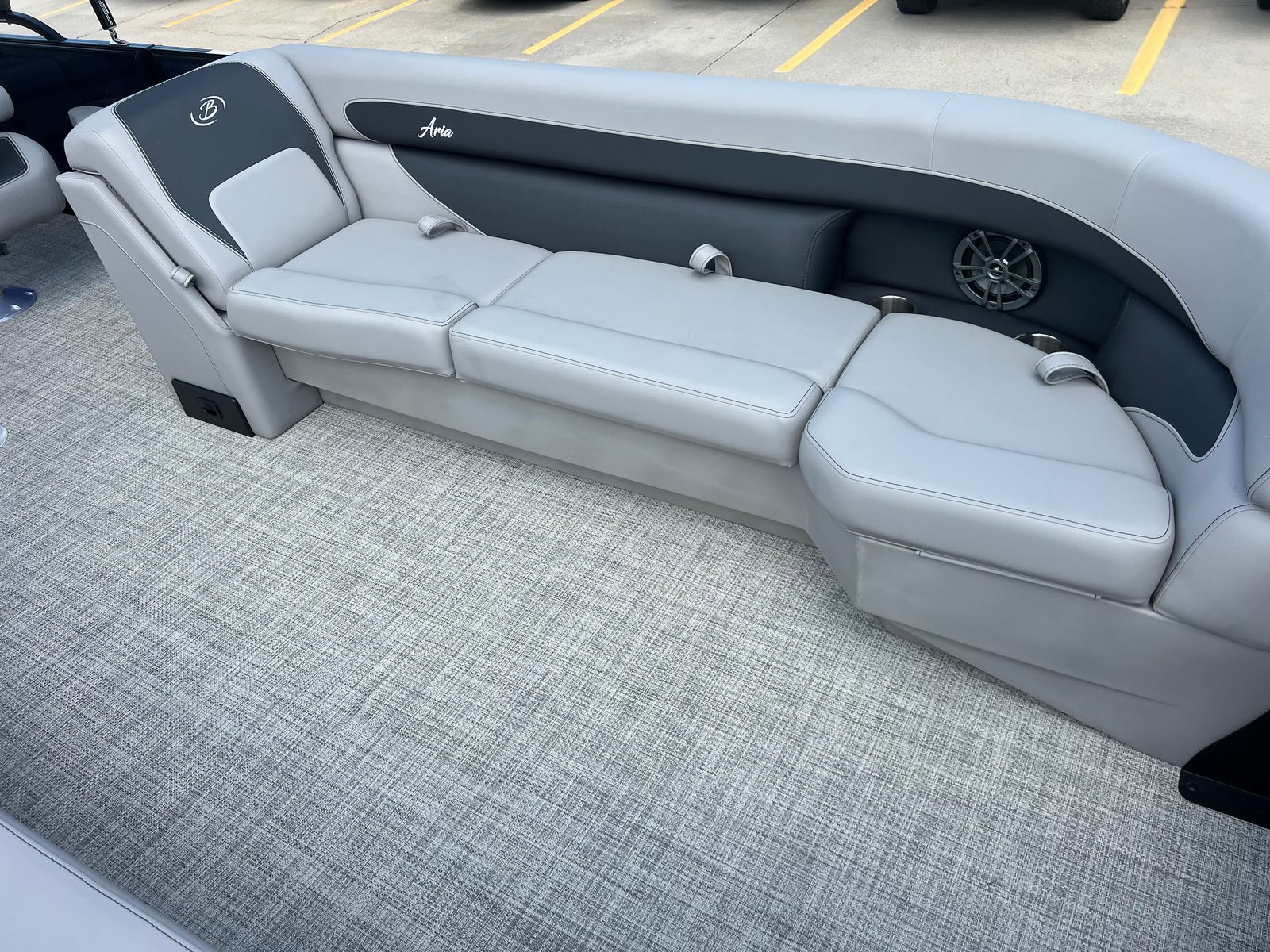The 2026 Barletta Aria A24UC is packed with premium features designed to maximize your comfort and enjoyment on the water. The Blue Sapphire Railskin color, paired with the Aria Blackout Package, gives the boat a bold and contemporary appearance that is sure to turn heads at the marina. The Tempest Gray furniture offers plush seating for you and your guests, while the Alpine Gray flooring provides a stylish and easy-to-clean surface underfoot.For those who value convenience and organization, the in-floor midship storage is a game-changer, offering ample space to stow away gear, water toys, and personal items. The clipped playpen cover with poles ensures your pontoon stays protected from the elements when not in use, preserving its beauty and value for years to come. The rigged engine with a stainless steel prop guarantees reliable performance and longevity, so you can focus on enjoying your time on the water.