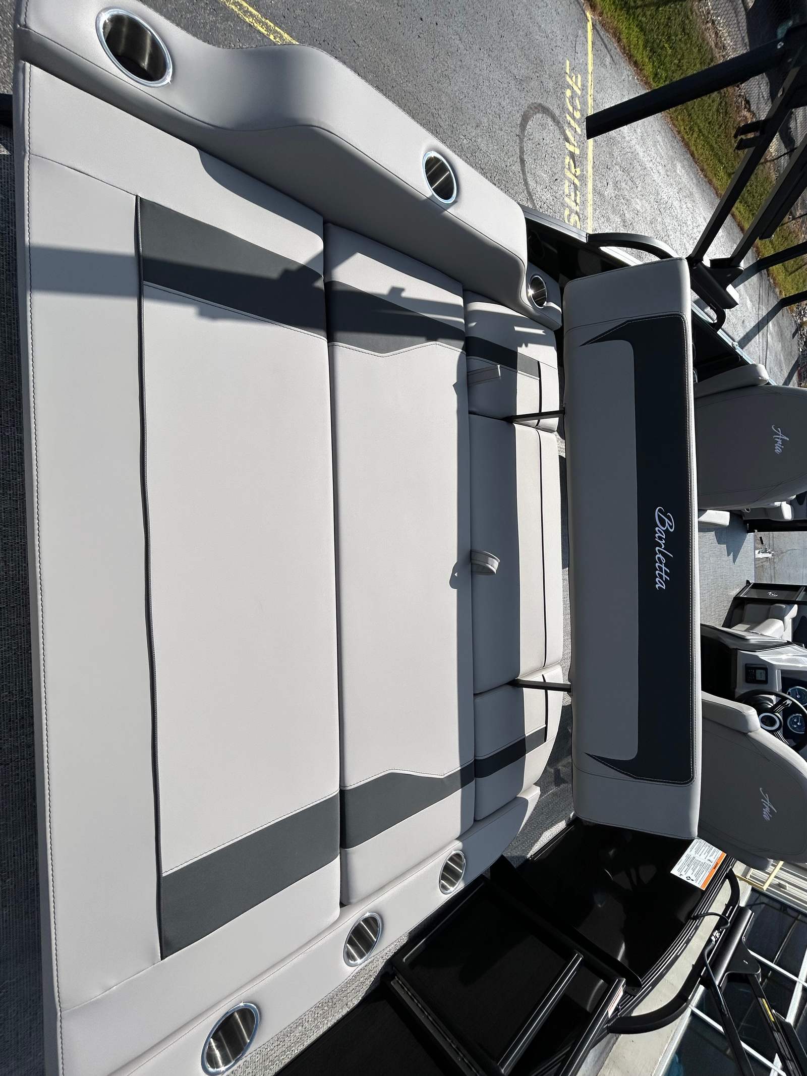 The 2026 Barletta Aria A24UC is loaded with features that set it apart from other pontoon boats for sale. The exterior showcases a stainless steel flag pole adorned with an American flag, adding a touch of patriotic flair to your boating experience. The Black Diamond railskin color, complemented by the Gray Moonstone accent and Blackout Package Aria, creates a striking visual appeal. Inside, the Tempest Gray furniture offers plush comfort and a modern look, while the Amore Gray flooring provides a stylish and easy-to-clean surface underfoot. The Triple Toon Package Aria enhances stability and performance, ensuring a smooth and enjoyable ride even in choppier waters.