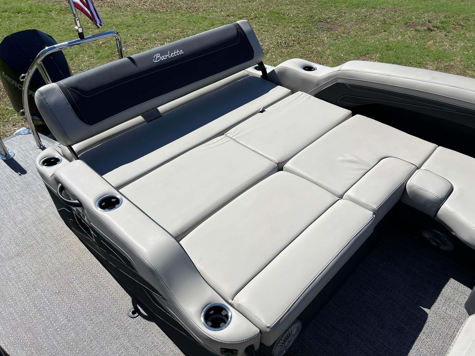 The Barletta Cabrio C22U is packed with special features that elevate its appeal and functionality. The Railskin Color in Black Diamond, complemented by the Gray Moonstone accent, gives the boat a sophisticated and contemporary look. The Blackout Package Cabrio adds a touch of exclusivity, ensuring your pontoon stands out wherever you go. Inside, the Marquesan Gray furniture with Onyx accents creates a comfortable and stylish environment, while the Amore Gray flooring is both attractive and easy to maintain.One of the standout features is the Triple Toon Package with midship storage, providing enhanced stability and extra space for gear, water toys, or personal belongings. The Sport Bimini canvas, installed in place of the standard bimini, offers superior sun protection and adds a sporty flair to the boat’s profile. Every detail, from the rigged engine with stainless steel prop to the thoughtfully designed interior, reflects Barletta’s dedication to quality and user satisfaction.