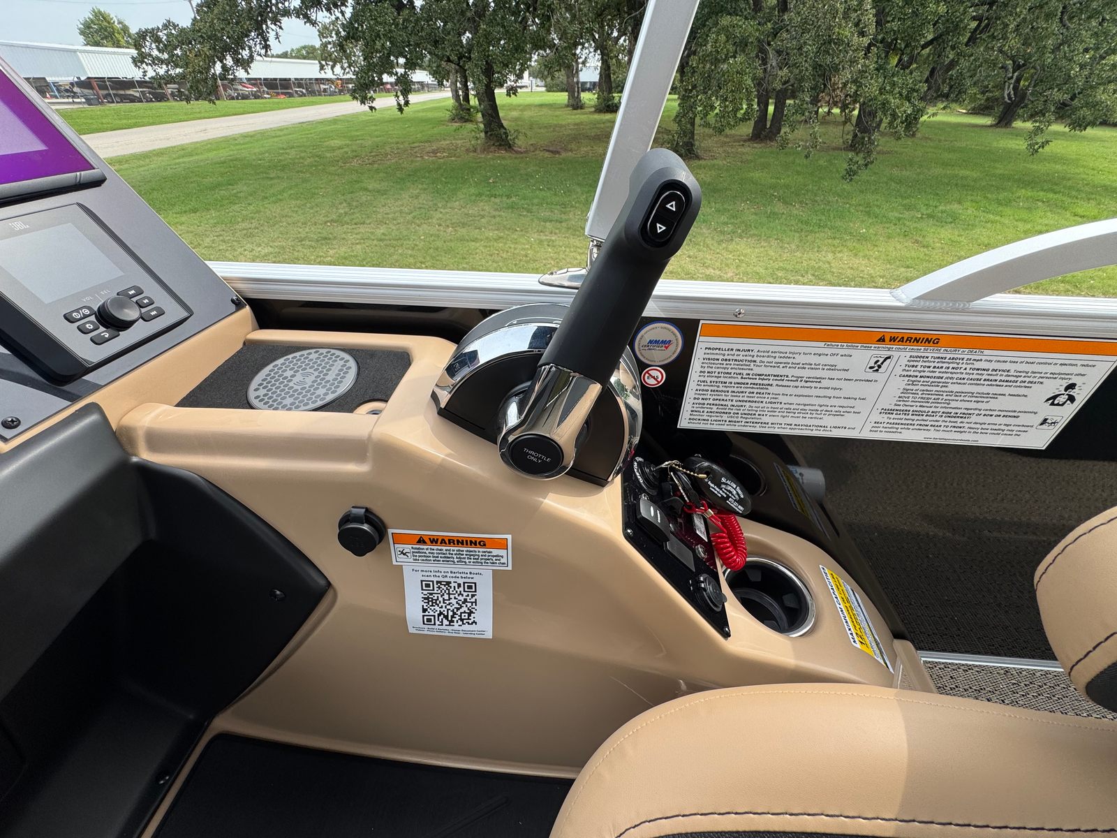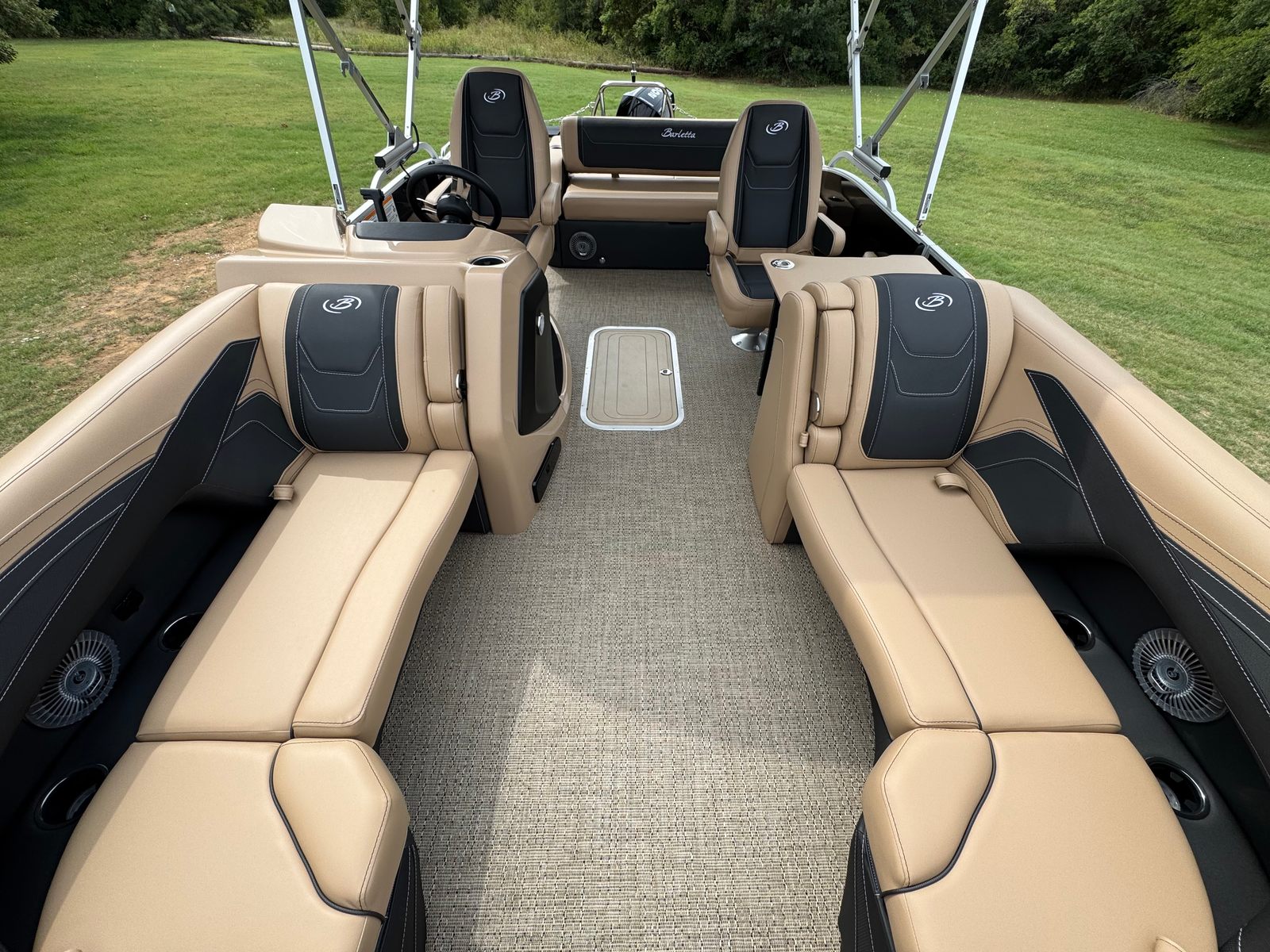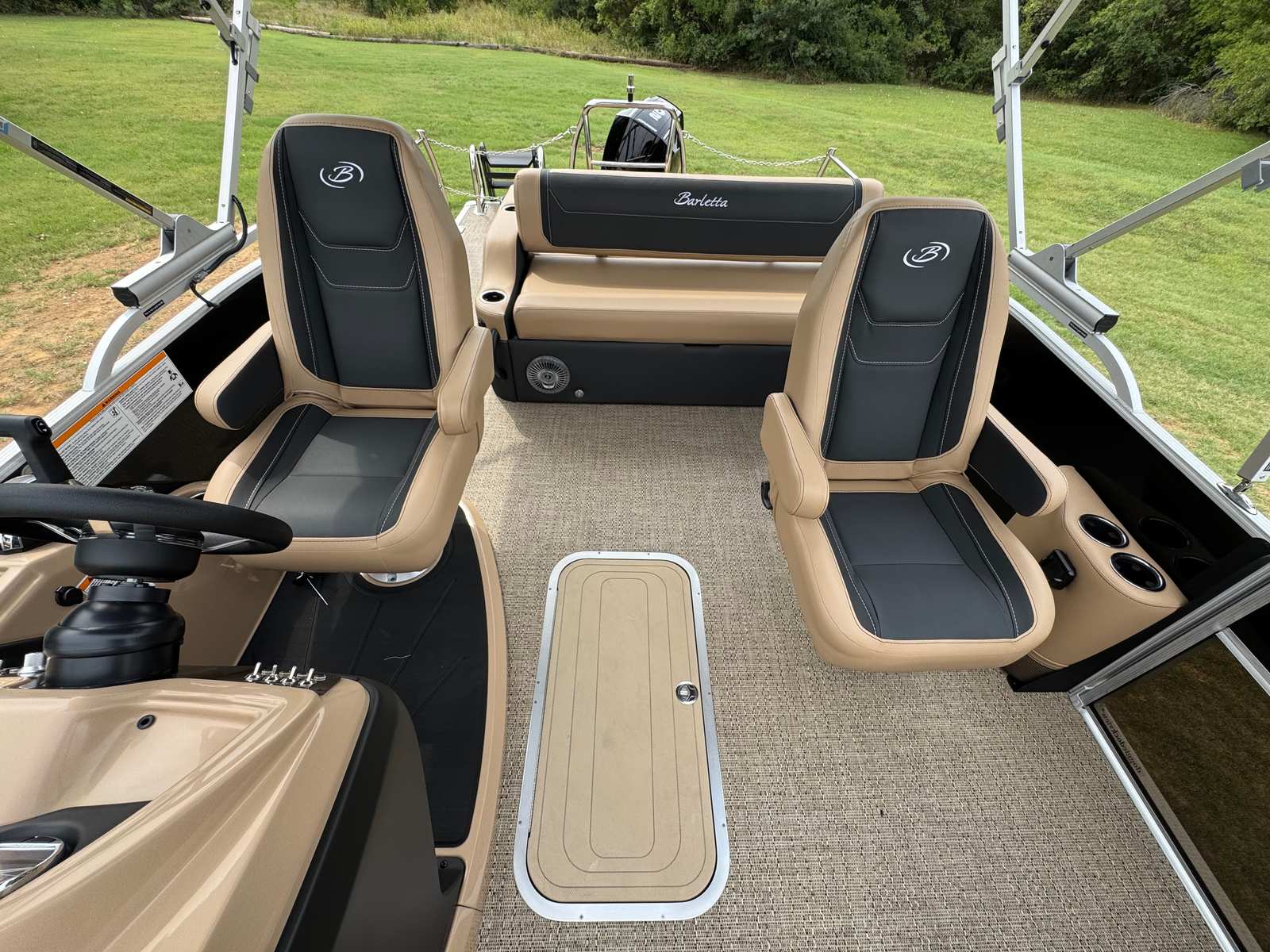 The Barletta Cabrio C22UC is packed with features that set it apart from other pontoon boats for sale. The striking Black Diamond Railskin not only adds a touch of elegance but also offers durability against the elements. Inside, the Carmella Tan furniture with Onyx detailing provides plush seating and a refined look, perfect for lounging or socializing. The Amore Tan flooring is both stylish and practical, designed to withstand heavy foot traffic while remaining easy to clean.The Triple Toon Package with midship storage is a game-changer, offering enhanced buoyancy and stability for a smoother ride. This feature also provides convenient storage solutions, keeping your gear organized and accessible. The Mercury 200L FourStroke engine is paired with a mechanical pre-rig and power assist, ensuring effortless control and precision. The rigging includes a stainless steel prop for added reliability and performance.Additional highlights include the Metal Jacket Protectant, which safeguards the pontoon’s exterior from wear and tear, extending its lifespan and maintaining its pristine appearance. The stainless steel flag pole with an American flag adds a patriotic touch, while the stainless steel safety stanchions with chains enhance onboard safety for all passengers.