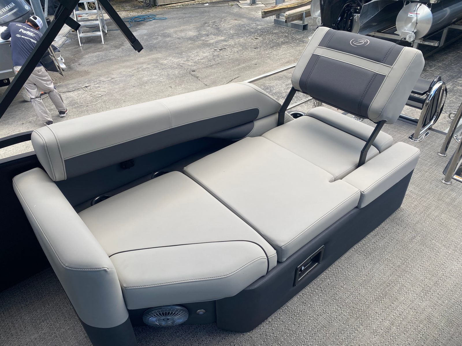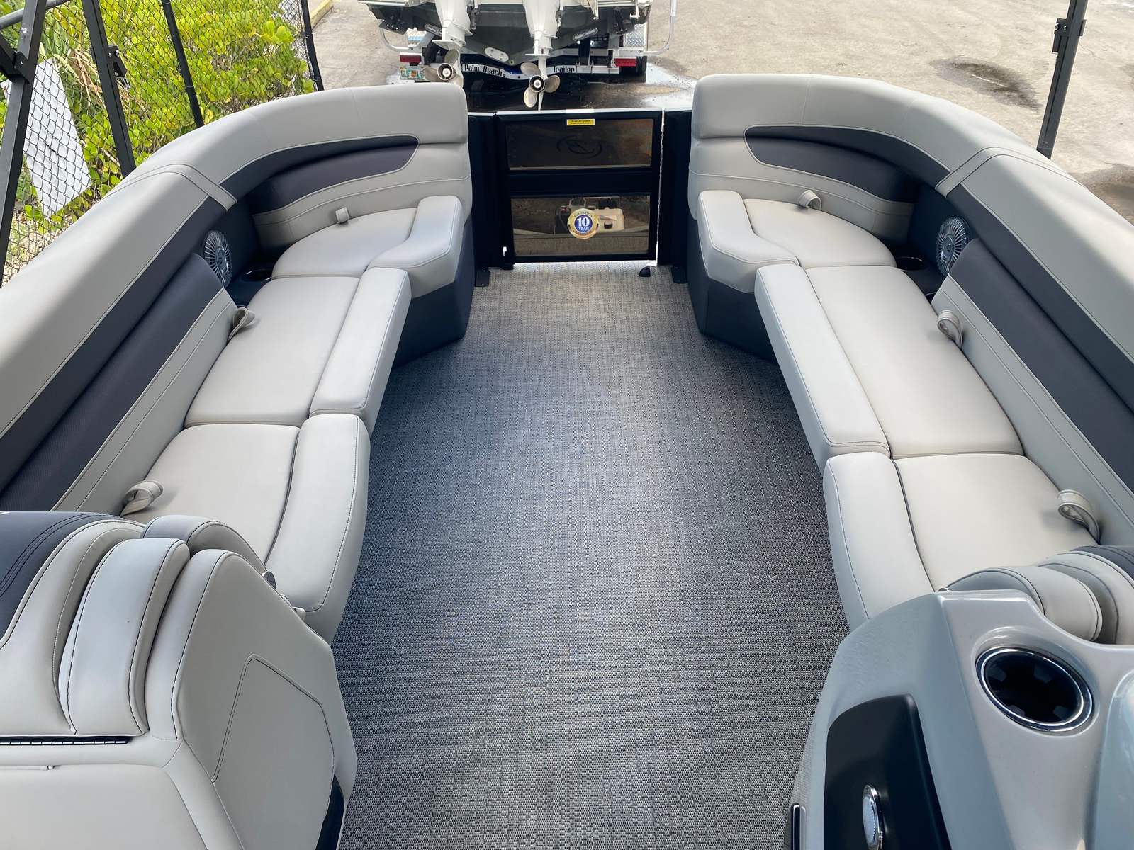 The Cabrio C24M is loaded with special features that set it apart from other pontoon boats for sale. The Meridian Flip Table, complete with a pedestal and base, offers versatile space for dining, games, or simply relaxing with friends. The Interior RGB Lighting Package Cabrio lets you set the mood with customizable lighting, perfect for evening cruises or lively gatherings. The Coastal Edition Cabrio ensures enhanced durability and performance in saltwater environments, while the Railskin Blackout Package Cabrio adds a bold, modern aesthetic to the exterior.Double Bimini tops provide generous shade on sunny days, and the exterior lighting – including white underdeck and underwater lights – creates a striking visual effect after sunset. The Marquesan Gray furniture with Charcoal accents is both stylish and comfortable, while the Amore Gray flooring is designed for durability and easy cleaning. Every detail of the Cabrio C24M is thoughtfully engineered to maximize comfort, convenience, and enjoyment on the water.