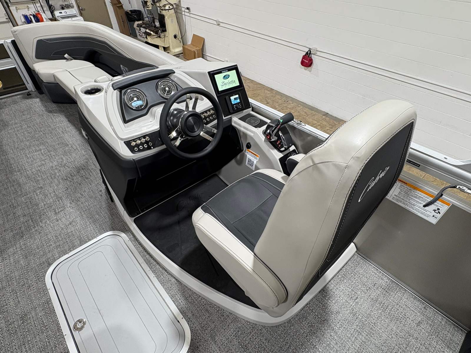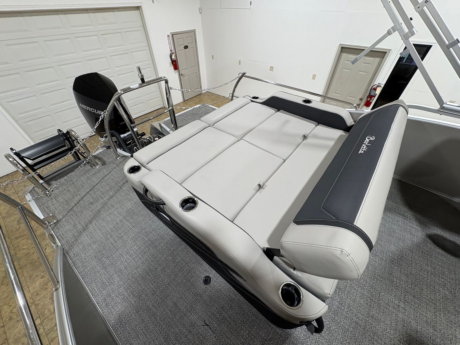 Step aboard the Barletta Cabrio C24UC and discover a world of premium features designed to elevate your time on the water. The Railskin Color in Gray Moonstone, accented with Champagne, gives the exterior a sophisticated and contemporary look. Inside, the Marquesan Gray furniture with Onyx accents offers plush seating and a refined ambiance, complemented by Amore Gray flooring that’s both stylish and easy to maintain.The Triple Toon Package with midship storage is a standout feature, providing enhanced stability, improved handling, and ample space for storing gear, water toys, or picnic essentials. The Mercury Digital DTS Pre-Rig and Vessel Link system ensure that your engine is ready for peak performance, while hydraulic and power assist steering make every journey smooth and effortless. Digital gauges keep you informed and in control, and the rigged engine with a stainless steel prop delivers reliable power and efficiency.On the exterior, you’ll find thoughtful touches like a stainless steel flag pole with an American flag, adding a patriotic flair, and stainless steel safety stanchions with chains for added security and peace of mind. Every detail of this pontoon boat has been carefully considered to maximize comfort, safety, and enjoyment.