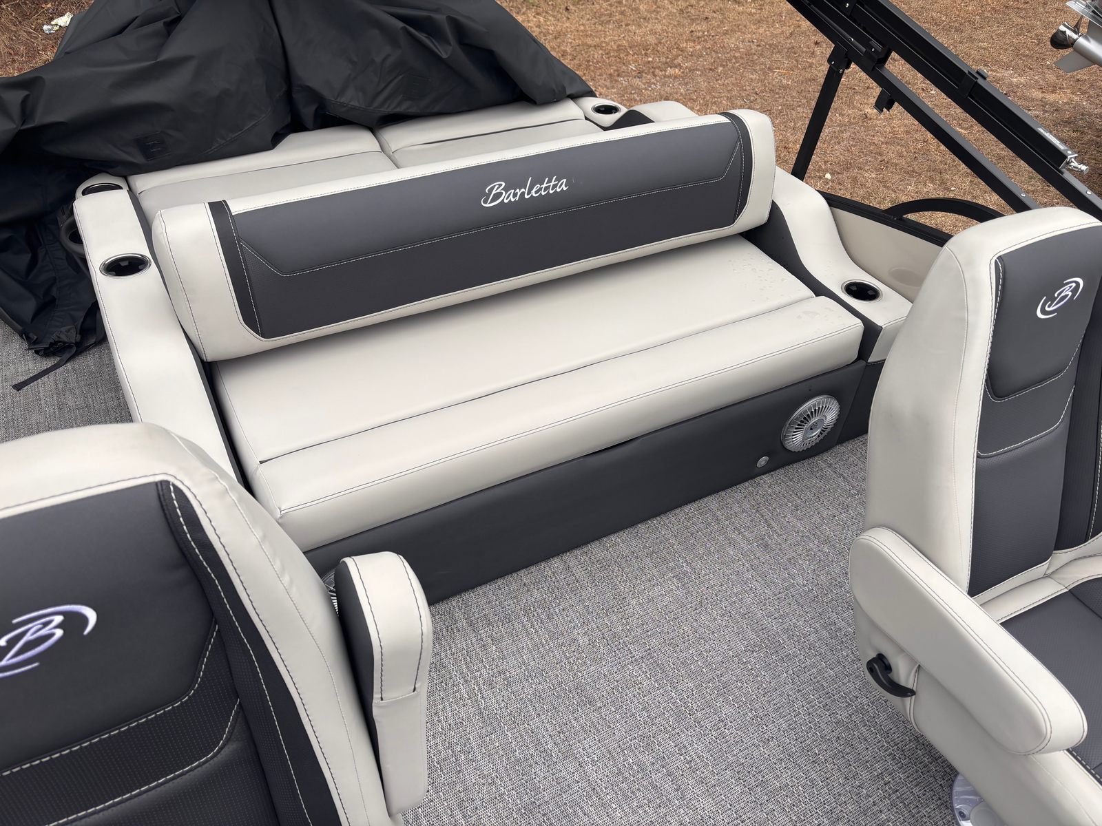 The 2026 Barletta Cabrio C24UC is loaded with features that elevate your boating experience. The triple toon package with midship storage offers enhanced stability and ample space for gear, making it easy to bring along everything you need for a day on the water. The railskin color in Gray Moonstone, accented by Champagne, gives the boat a modern and elegant look, while the Blackout Package Cabrio adds a touch of sophistication with its sleek, dark finishes. Inside, the Marquesan Gray with Onyx furniture provides plush, comfortable seating for all your guests, complemented by the stylish Amore Gray flooring that is both durable and easy to maintain.The exterior is adorned with a stainless steel flag pole and an American flag, adding a patriotic flair and making your boat stand out at any marina or dock. The rigging includes a stainless steel prop, ensuring optimal performance and longevity. Every detail of the Cabrio C24UC has been thoughtfully designed to enhance your time on the water, from the spacious layout to the premium materials and finishes.