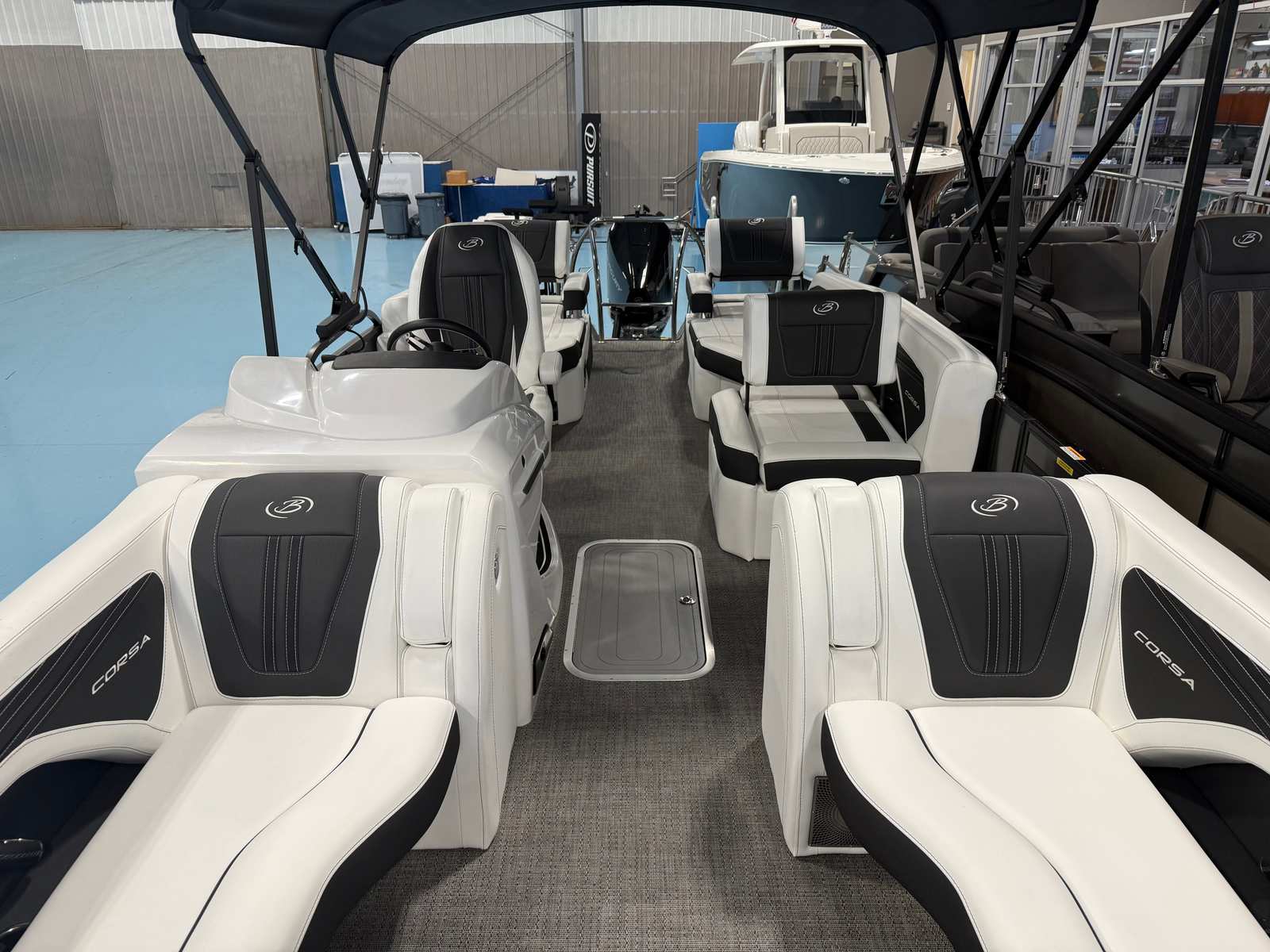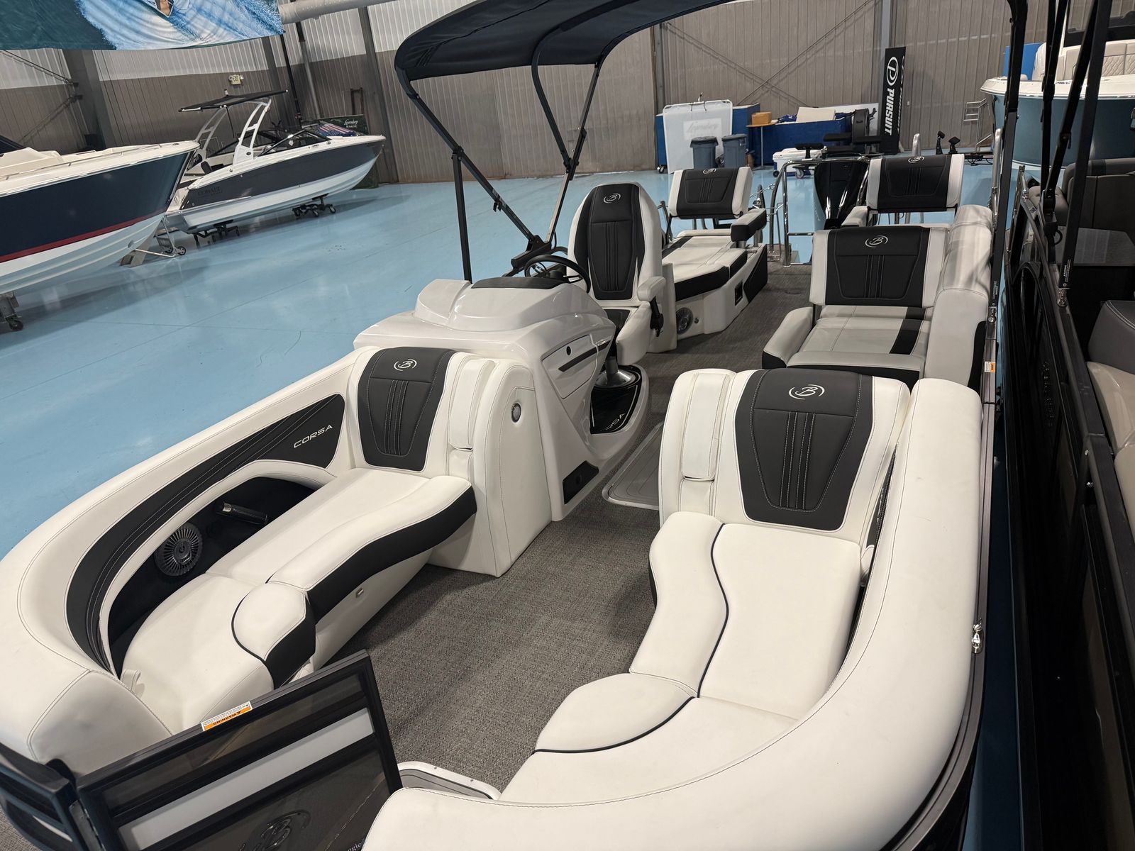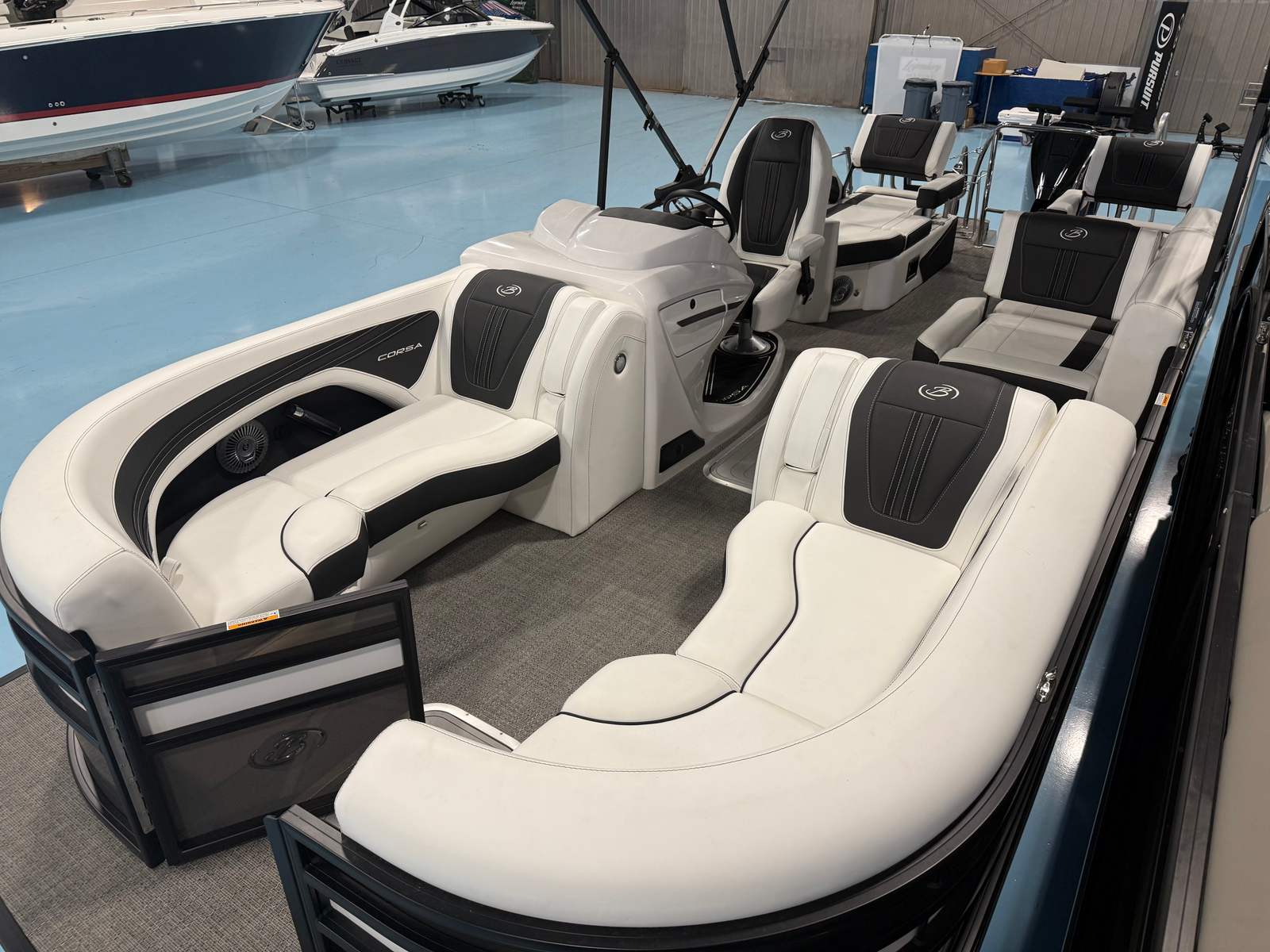 Step aboard the Corsa 23M and experience a world of comfort and convenience. The soft touch Brilliant White furniture, accented with Carbon, creates a sophisticated and inviting atmosphere for you and your guests. The Amore Gray flooring is both stylish and practical, offering durability and easy maintenance for worry-free enjoyment. The boat is equipped with a table, pedestal, and base, complete with Yeti-ready cupholders, making it easy to entertain and relax with your favorite refreshments close at hand.The rigging is designed to make the boat water-ready, featuring a stainless steel prop for optimal performance and longevity. The Mercury Digital DTS Pre-Rig ensures that the engine and controls are perfectly matched, providing a seamless boating experience. With the Coastal Edition Corsa package, you can expect enhanced durability and style, making this pontoon ideal for a variety of environments.