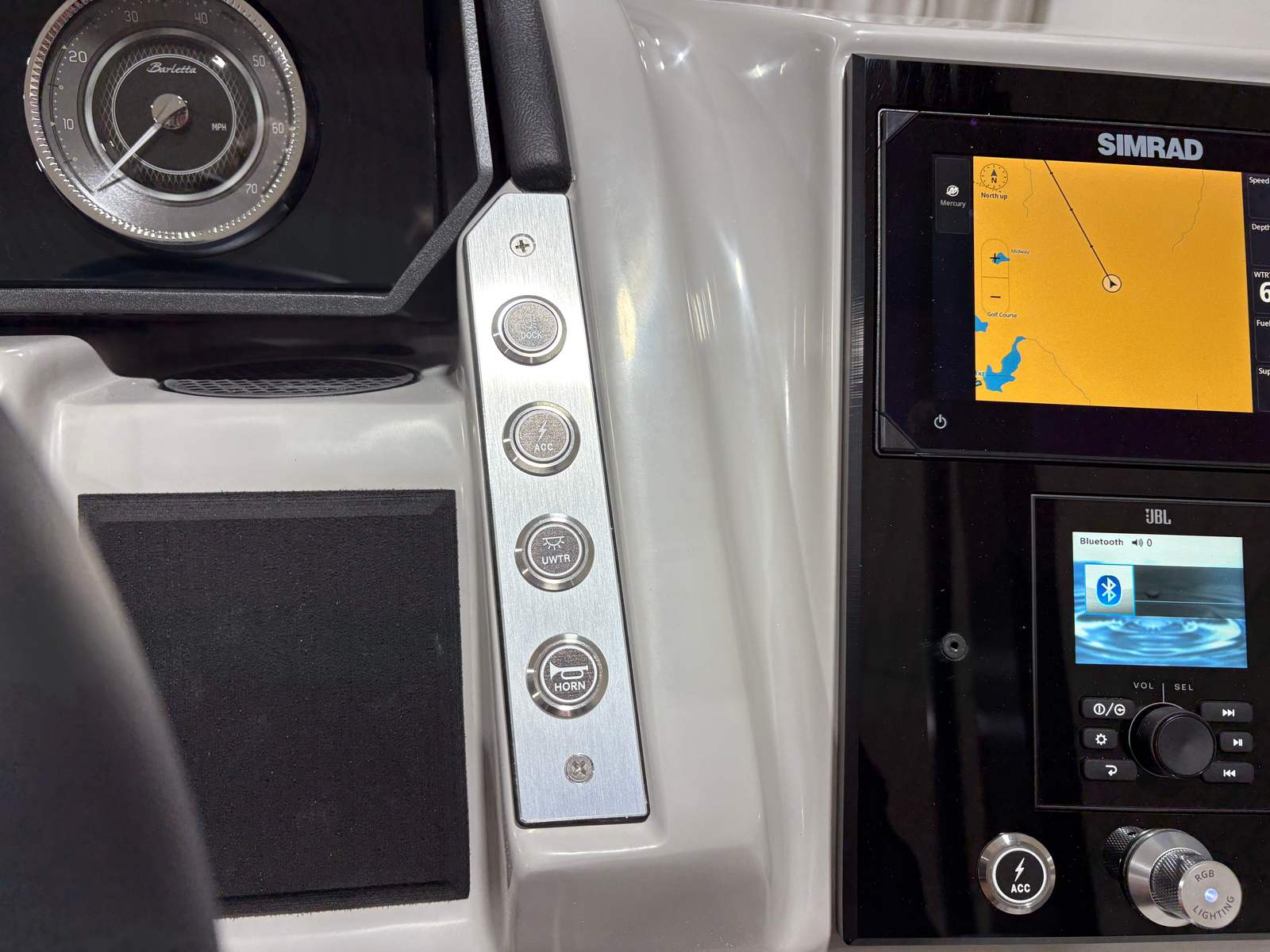 The 2026 Barletta Corsa 25U is loaded with premium features that set it apart from other pontoon boats for sale. The exterior boasts a sophisticated Railskin color in Champagne, complemented by a Gray Moonstone accent and the striking Blackout Package Corsa, giving the boat a modern and upscale appearance. The stainless steel flag pole with an American flag adds a touch of patriotic flair and elegance to your on-water adventures.Step aboard and you will be greeted by Soft Touch Marquesan Gray furniture with Carbon accents, offering plush comfort and a contemporary aesthetic. The Amore Gray flooring is both stylish and practical, providing a durable and easy-to-clean surface that stands up to the demands of active boating. The digital gauges keep you informed of all essential metrics, while the sport bimini (installed in place of the standard bimini) offers enhanced sun protection and a sporty look.