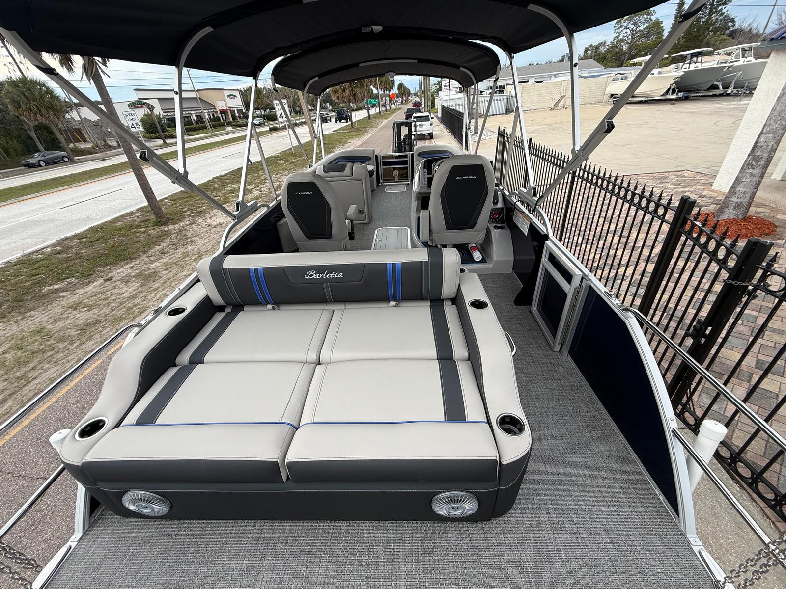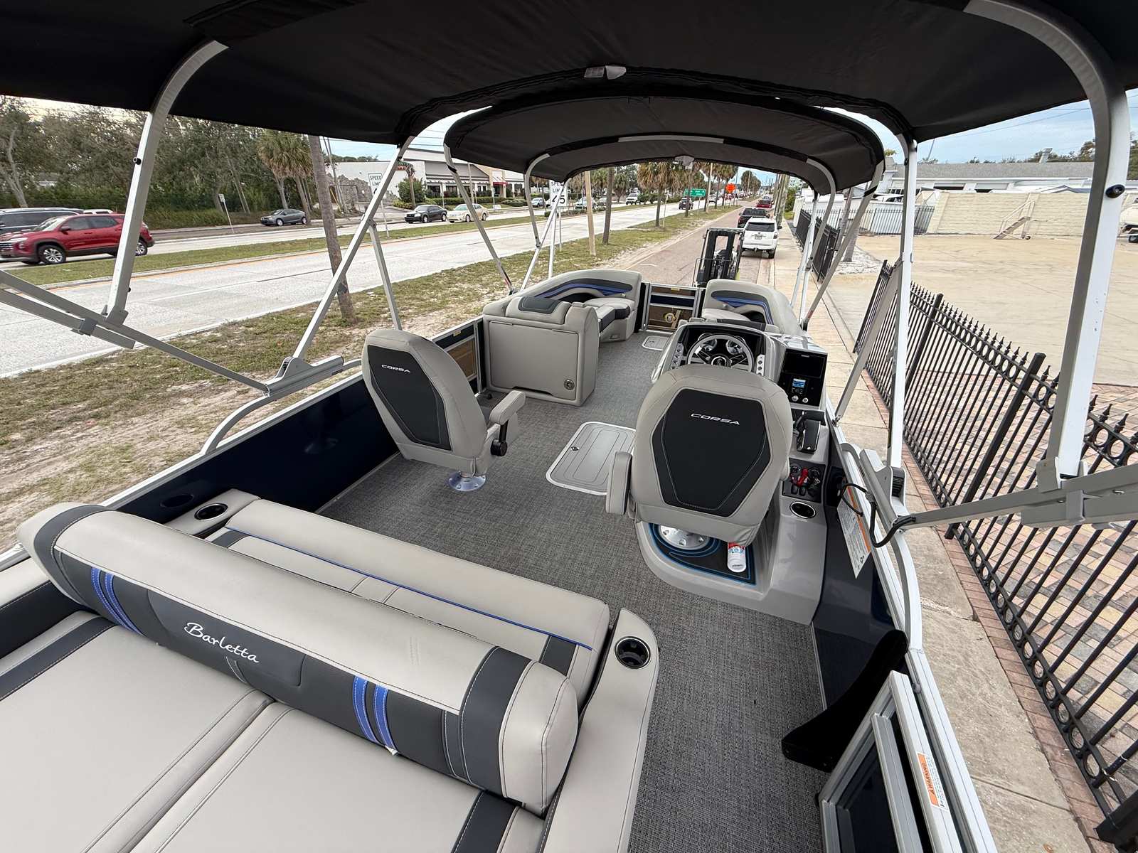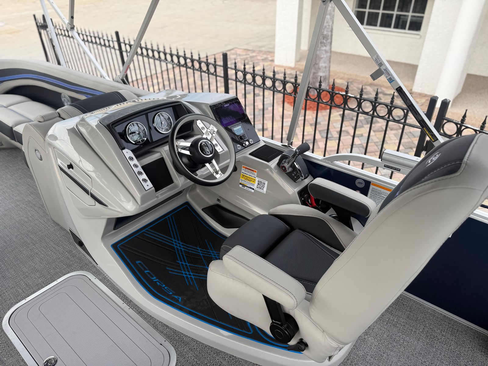 The Barletta Corsa 25UC is designed with practicality in mind, offering features that make ownership easy and enjoyable. The double bimini system provides flexible shade options, allowing you to adapt to changing weather conditions and keep your guests comfortable. The onboard battery charger and dual batteries ensure that your boat is always ready to go, minimizing downtime and maximizing your time on the water.Docking and maneuvering are a breeze thanks to the hydraulic and power assist steering, while the durable flooring and furniture stand up to the rigors of regular use. The digital gauges and Vessel Link connectivity make it simple to monitor your boat’s performance and stay on top of maintenance needs. With its spacious layout and thoughtful design, this pontoon boat is perfect for storing gear, refreshments, and water toys, so you’re always prepared for a day of fun.