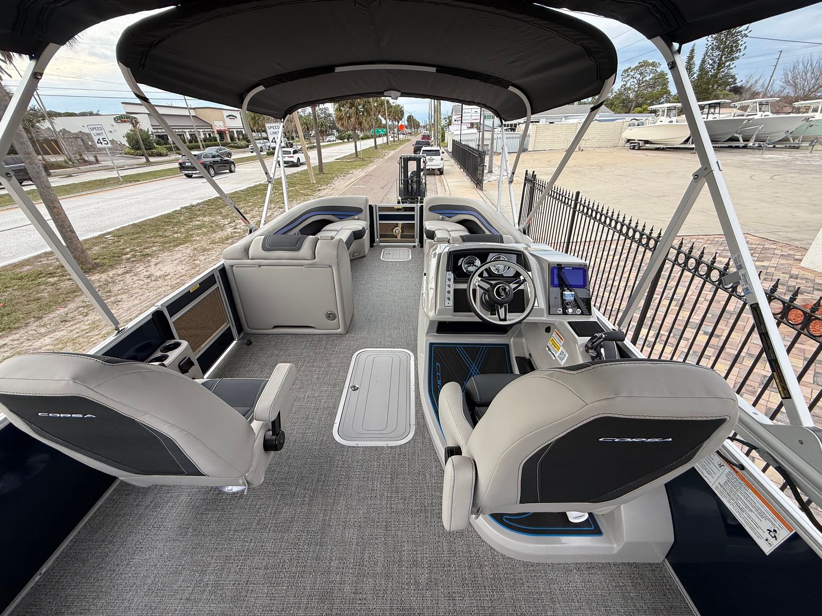 The 2026 Barletta Corsa 25UC is a 27-foot pontoon boat that exudes modern elegance and superior craftsmanship. Built for the discerning boater, this model combines Barletta’s renowned engineering with a fresh, sporty aesthetic. The Blue Sapphire Railskin color, accented by Winter White, creates a striking visual presence on the water, while the Soft Touch Marquesan Gray furniture with Blue Accent adds a touch of sophistication and comfort to every outing. The Amore Gray flooring is both stylish and practical, providing a durable surface that’s easy to maintain and pleasing to the eye.As part of the exclusive Coastal Edition Corsa lineup, this pontoon is designed to handle a variety of water conditions, making it perfect for coastal cruising, lakeside adventures, and everything in between. Whether you’re hosting a lively gathering or enjoying a peaceful sunset cruise, the Barletta Corsa 25UC offers the versatility and luxury you desire.