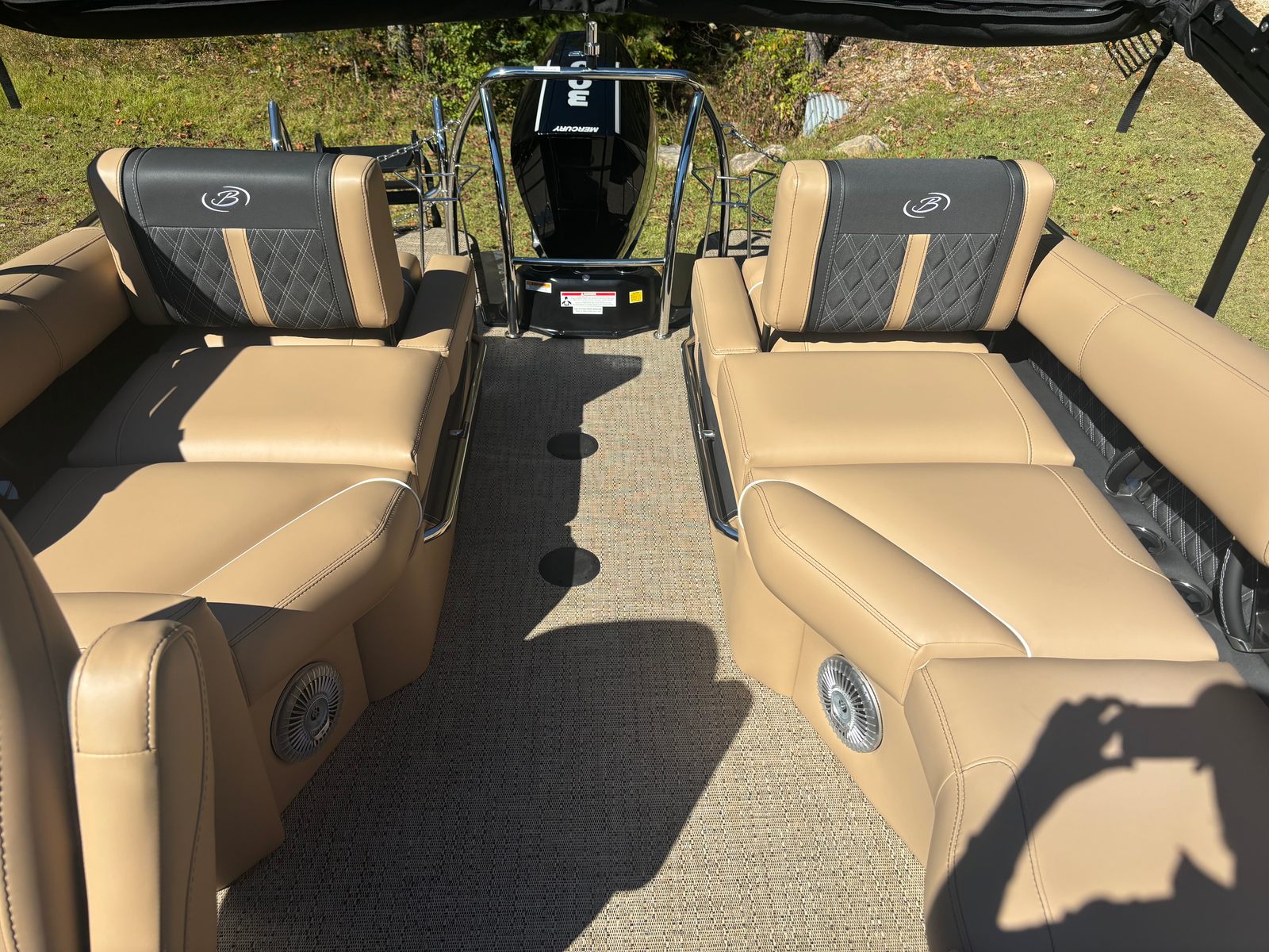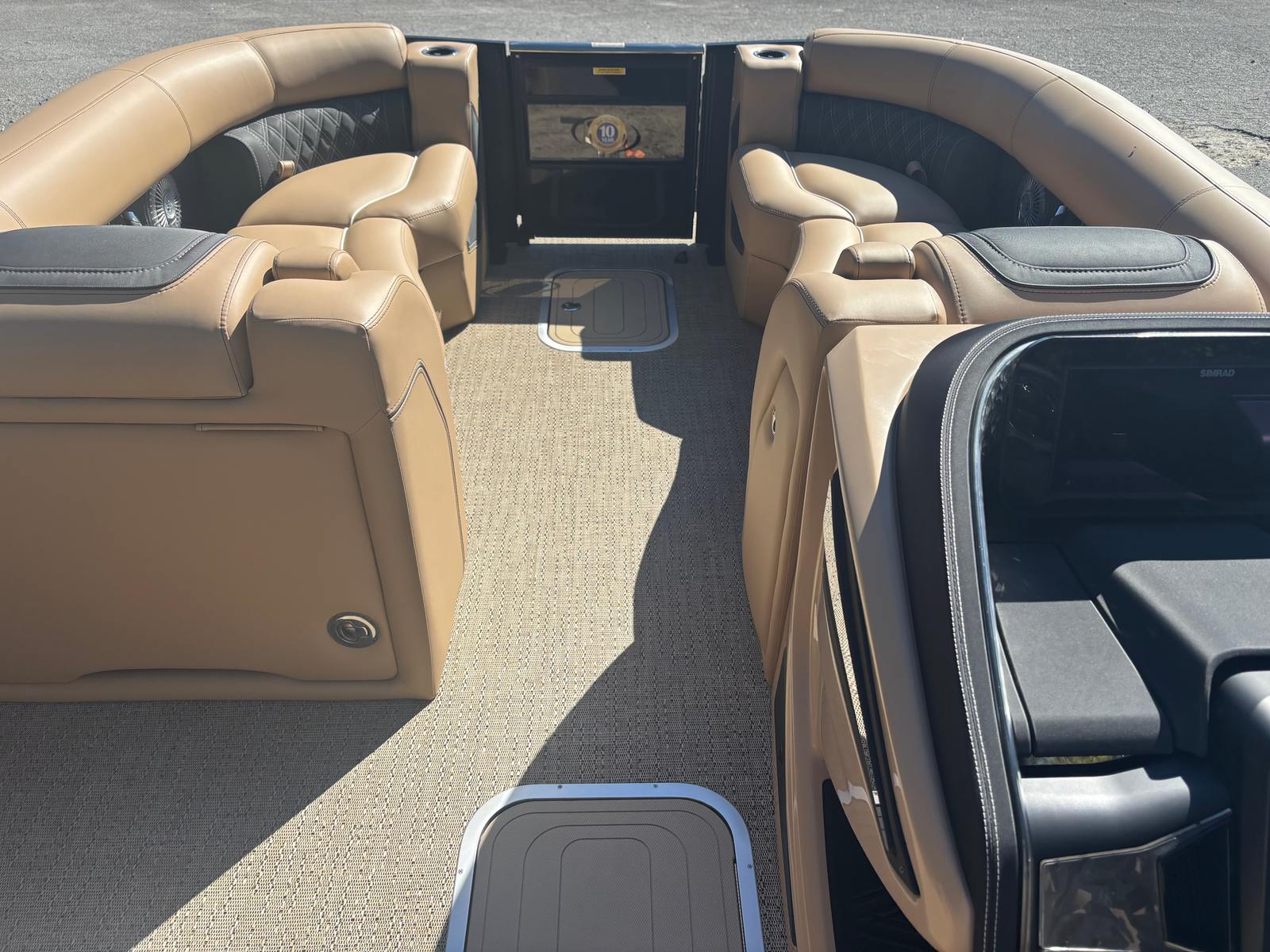 Step aboard and discover a world of luxury and convenience. The Lusso L23M features a striking Champagne accent color and Amore Tan flooring, creating a warm and inviting environment. The Carmella Tan furniture with Onyx accents adds a touch of elegance, while the Blackout Package Lusso railskin and Black Diamond sweep color give the exterior a bold, modern look. Exterior lighting, including white underdeck and underwater illumination, enhances both safety and ambiance during evening cruises. The 2-bank battery charger ensures your electrical systems are always ready, and the digital gauges keep you informed at a glance. Every detail has been thoughtfully designed to enhance your boating experience.