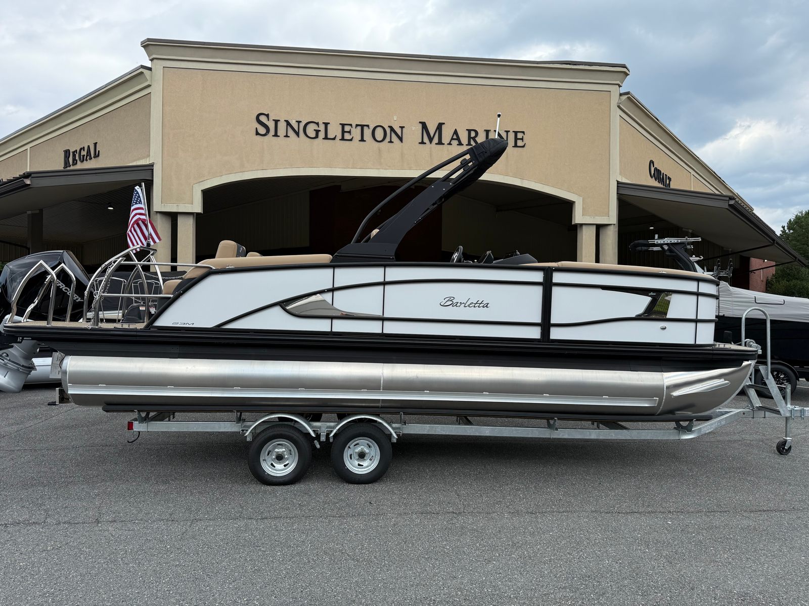 The 2026 Barletta Lusso L23M is loaded with premium features that set it apart from other pontoon boats for sale. The exterior boasts a striking Sweep Color in Winter White, complemented by the Blackout Package Lusso railskin, creating a bold and sophisticated look. The flooring is finished in Amore Tan, providing both durability and a touch of elegance underfoot. The furniture, upholstered in Carmella Tan with Onyx accents, offers plush comfort and a refined aesthetic, ensuring that every seat is the best in the house.For those who appreciate shade and protection from the elements, the Lusso L23M comes equipped with a Sport Bimini (installed in place of the standard Bimini), allowing you to enjoy the sun or seek shelter as needed. Digital gauges provide clear and accurate information at a glance, while the rigging includes a stainless steel prop for optimal performance and longevity. Every detail, from the accent color in Winter White to the thoughtfully designed seating arrangements, reflects Barletta’s commitment to quality and innovation.
