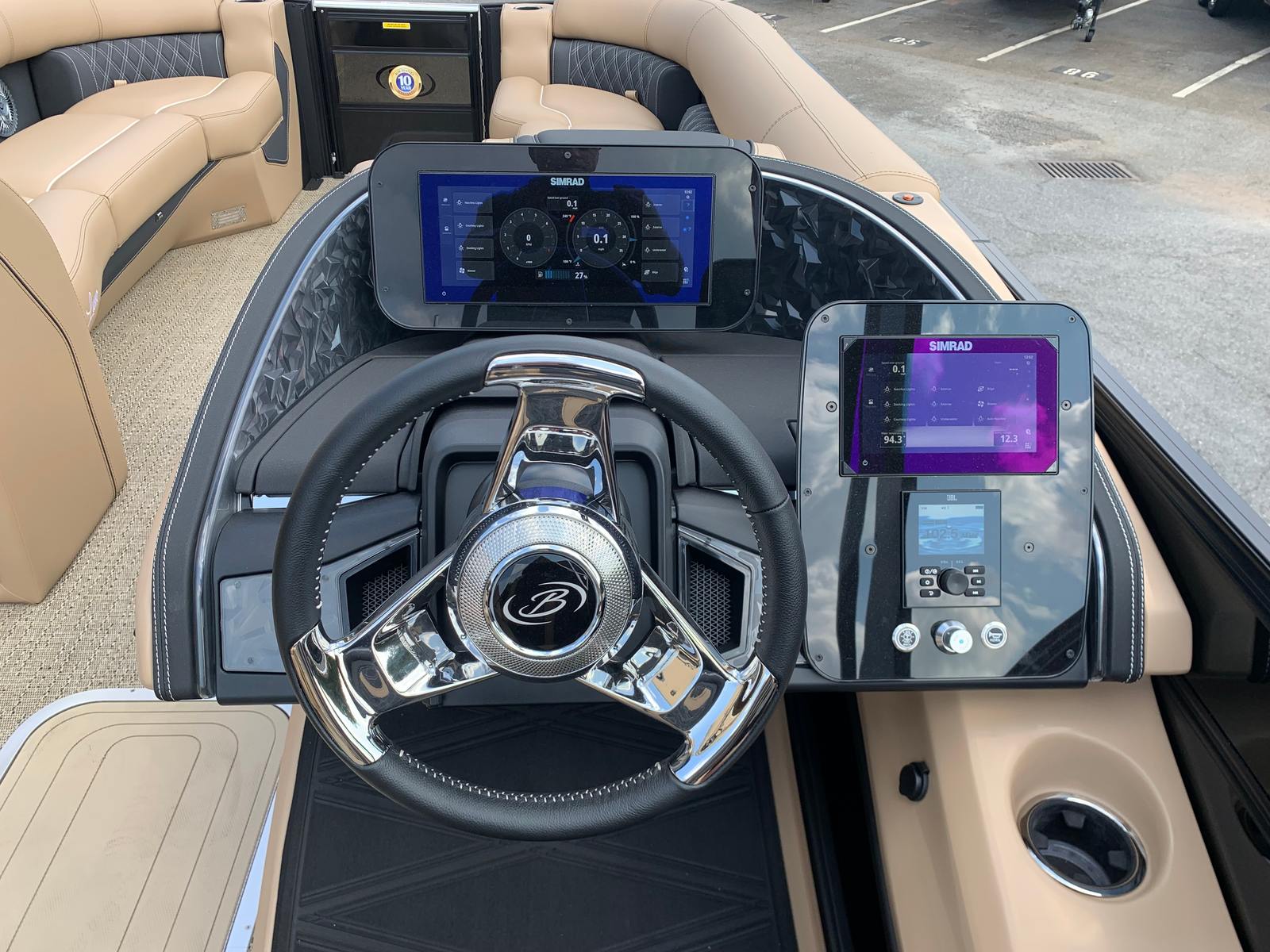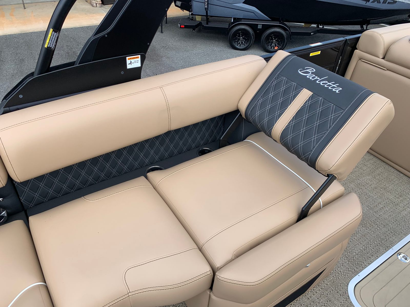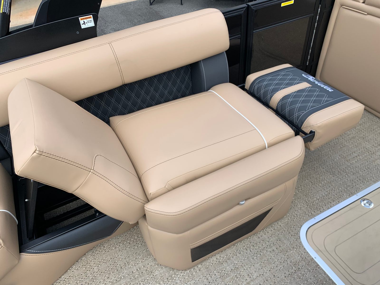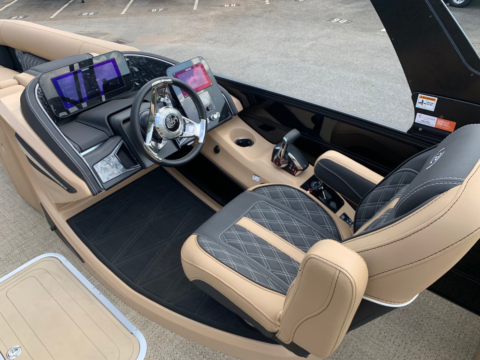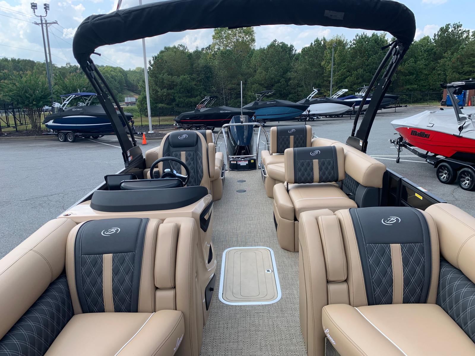 Step aboard the Lusso L25M and you’ll immediately notice the attention to detail in every aspect of its design. The Carmella Tan furniture with Onyx accents creates a warm, inviting atmosphere, perfectly complemented by the Amore Tan flooring. These premium materials not only enhance the boat’s aesthetic appeal but also provide lasting durability and comfort for all your guests.The Lusso L25M is equipped with a Sport Bimini canvas, installed in place of the standard bimini, offering superior shade and protection from the sun while maintaining a sporty, streamlined look. Exterior lighting, including white underdeck and underwater lights, adds a touch of elegance and ensures visibility during evening cruises or nighttime gatherings. The 2-bank battery charger keeps your electrical systems powered and ready for action, so you can focus on enjoying your time on the water.
