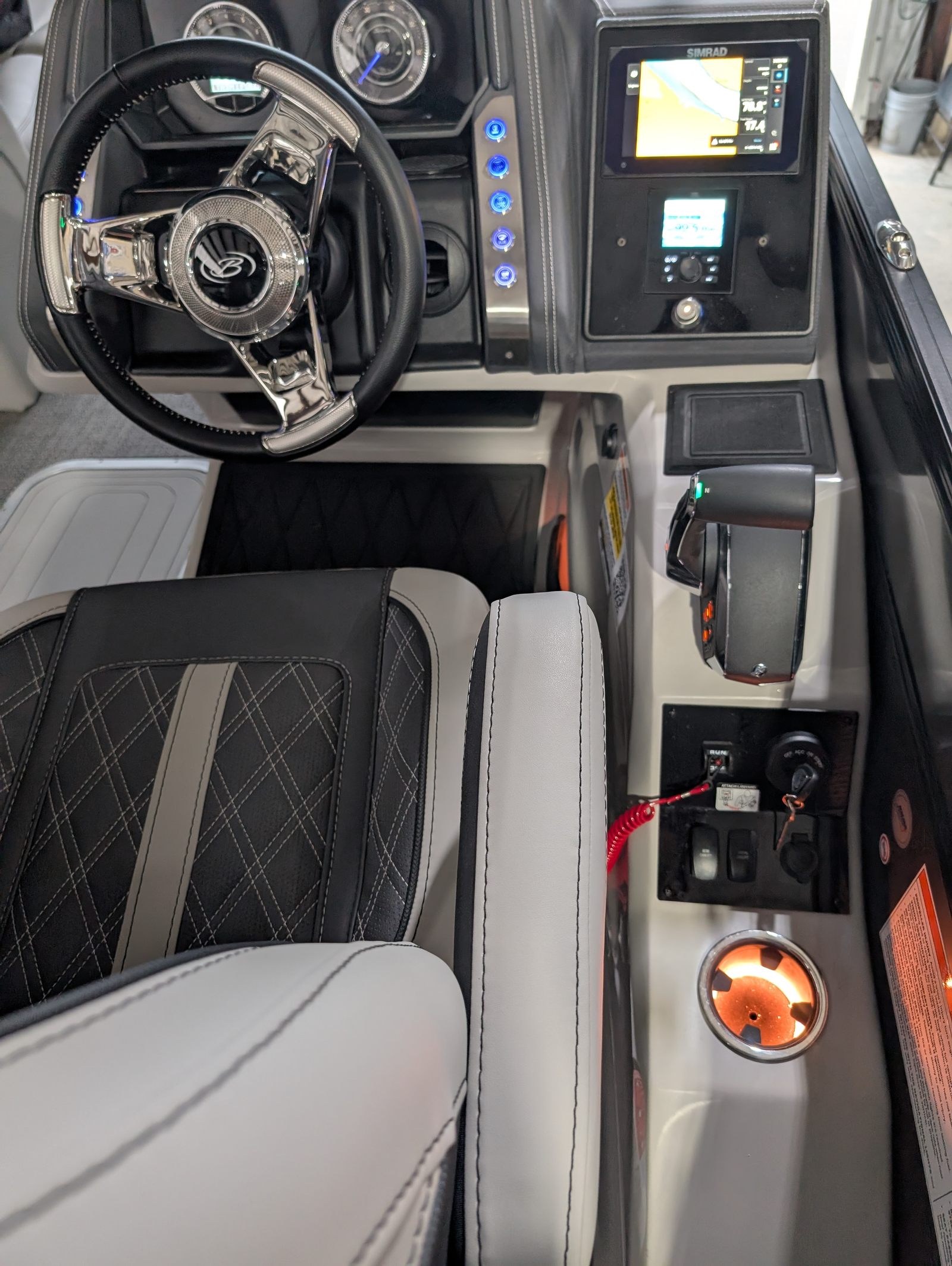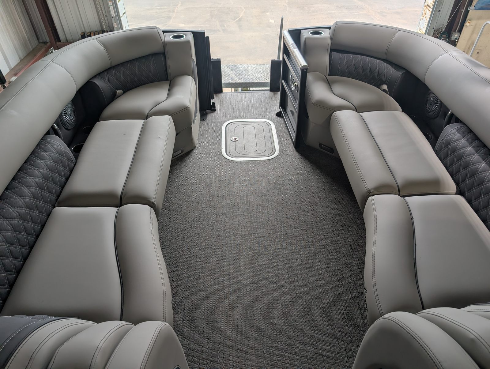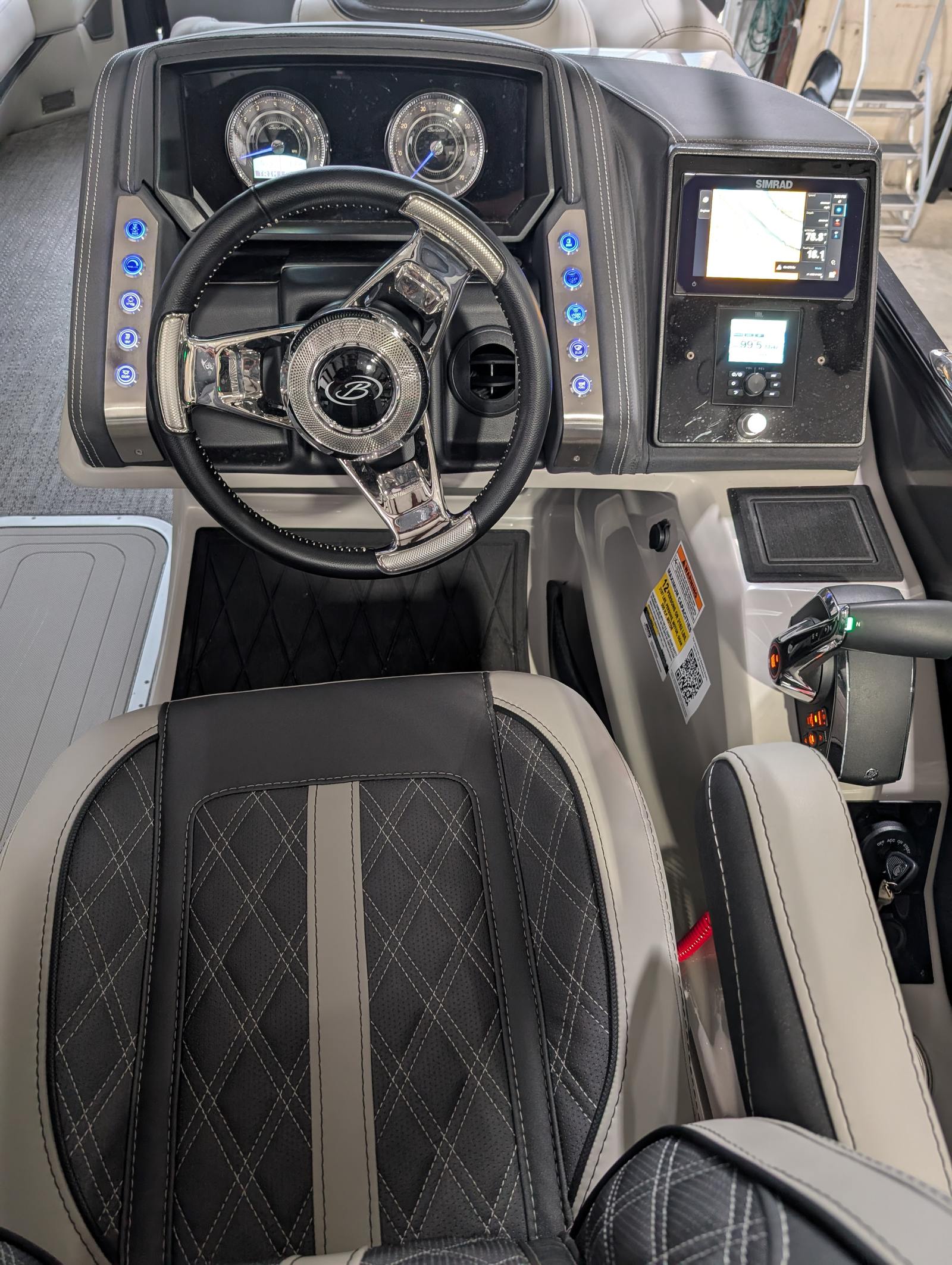 The Barletta Lusso L25M is packed with premium features that set it apart from other pontoon boats for sale. Step aboard and you’ll immediately notice the Amore Gray flooring, which provides a sophisticated foundation for the entire vessel. The interior is equally impressive, featuring Marquesan Gray furniture with Charcoal accents and a Matte Black accent color for a modern, upscale look.The captain’s chair at the helm is equipped with an adjustable pedestal, ensuring optimal comfort and visibility for the driver. Entertaining guests is a breeze thanks to the interior table, pedestal, and base, complete with Yeti-ready cupholders for your favorite beverages. Exterior lighting, including white underdeck and underwater lights, adds a dramatic flair for evening cruises and enhances safety after sunset.The Lusso L25M’s sweep color in Gray Moonstone complements its overall aesthetic, while the rigging and pre-rigging for the Mercury V10 engine ensure seamless integration and reliable performance. Every detail has been thoughtfully designed to maximize comfort, convenience, and enjoyment on the water.
