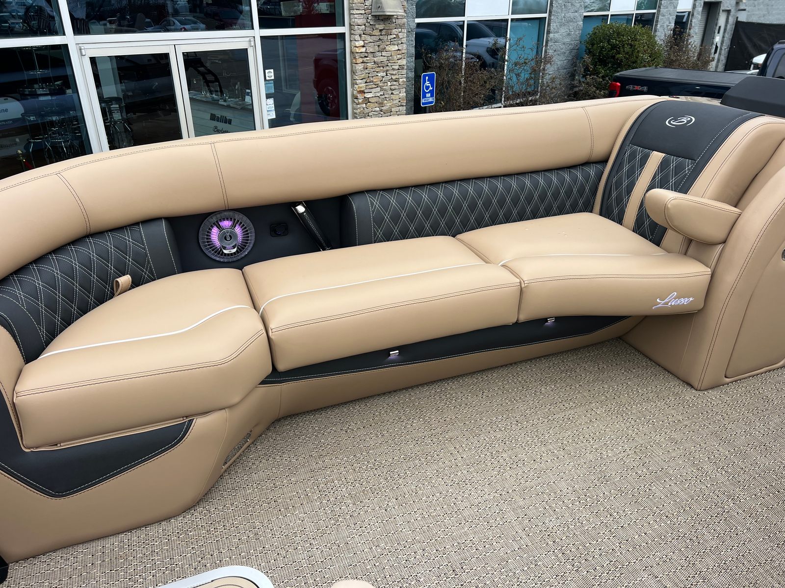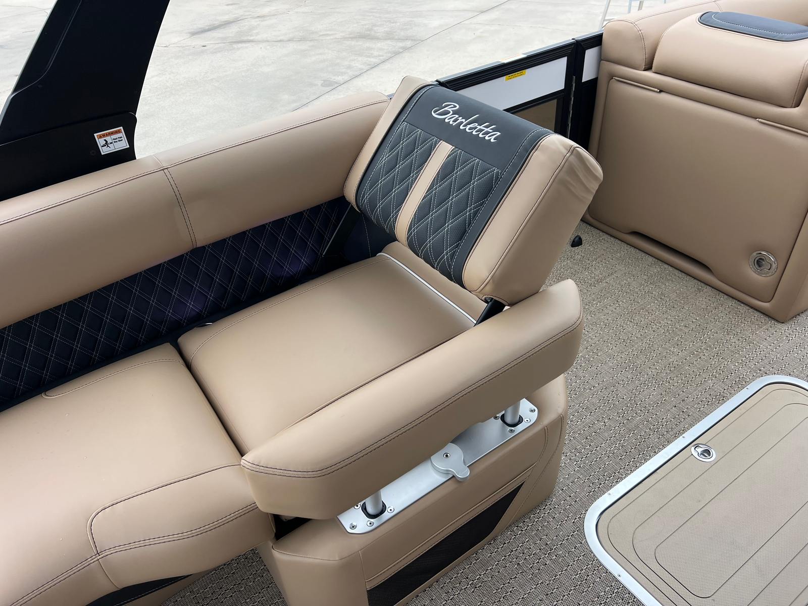 The Barletta Lusso L25M is packed with premium features designed to elevate your boating experience. The striking Winter White sweep color and Black Diamond accents create a modern, eye-catching look, while the Blackout Package Lusso railskin adds a touch of sophistication. The Carmella Tan with Onyx furniture provides plush, supportive seating, and the Amore Tan flooring is both stylish and easy to maintain. The Sport Bimini, installed in place of the standard bimini, offers superior shade and protection from the sun, allowing you to relax in comfort during long days on the water. The on-board battery charger with two batteries ensures you have reliable power for all your adventures, while the Mercury Digital DTS Pre-Rig for VERADO and stainless steel prop deliver optimal performance and control.