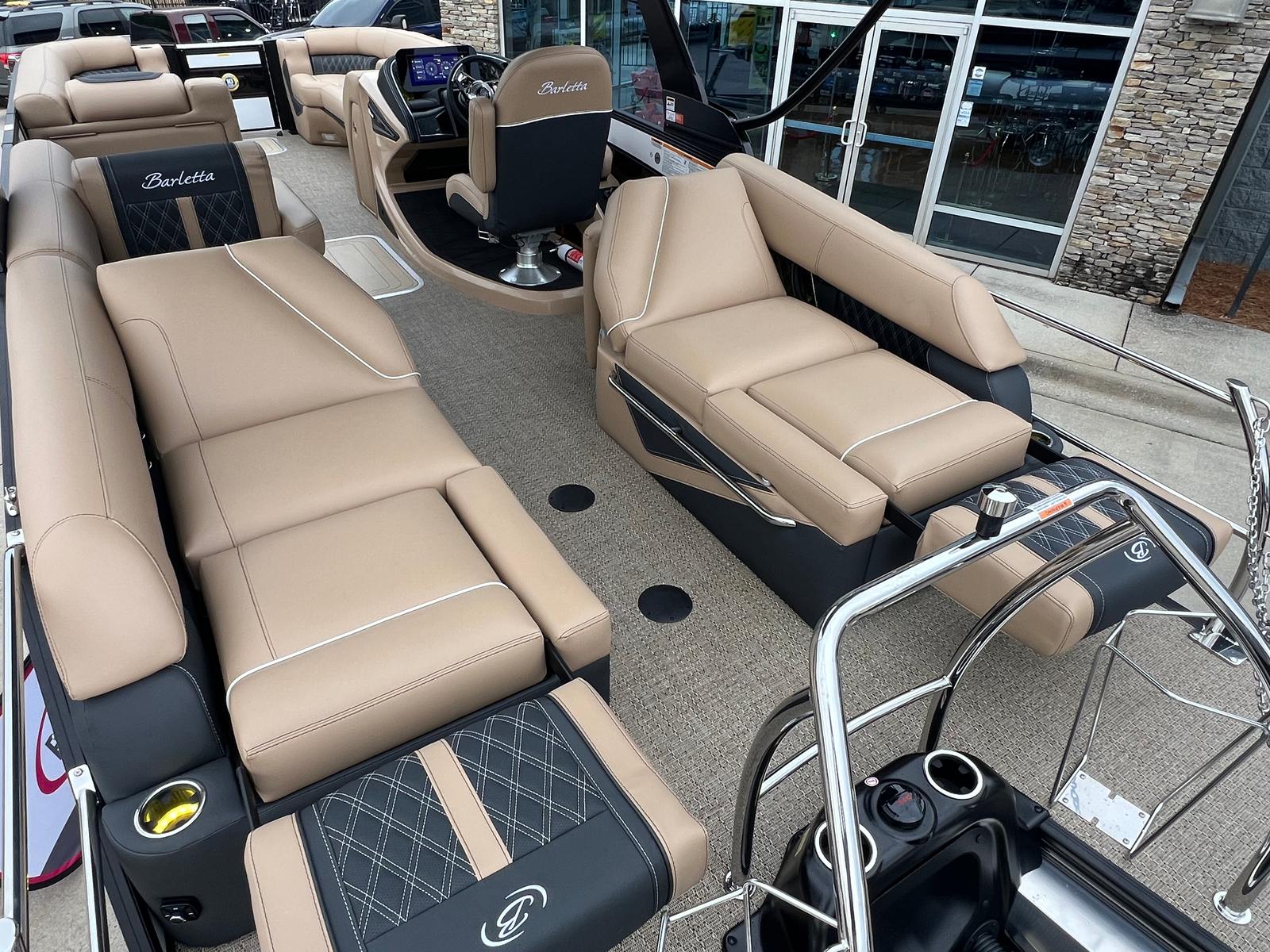 The 2026 Barletta Lusso L25M is a new pontoon boat that measures an impressive 27.5 feet in length, offering ample space for family, friends, and all your favorite activities. Barletta is renowned for its commitment to quality and innovation, and the Lusso L25M is no exception. This model showcases a sophisticated exterior with a sweep color of Winter White, complemented by an accent color of Black Diamond. The Blackout Package Lusso railskin adds a bold, modern touch, ensuring you turn heads wherever you go. Inside, the Carmella Tan with Onyx furniture and Amore Tan flooring create a warm, inviting atmosphere that exudes comfort and elegance.