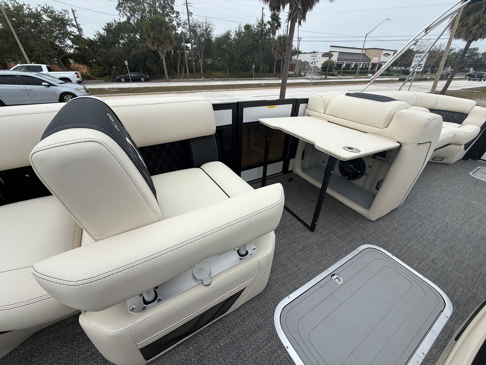 The Barletta Lusso L25MA is designed with practicality in mind, making ownership a breeze. Its generous length offers ample storage space for gear, water toys, and personal items, keeping the deck clutter-free and organized. The intuitive layout simplifies docking and maneuvering, even for those new to boating. Fuel efficiency is enhanced by the advanced Mercury V10 engine, allowing you to spend more time on the water and less at the pump.The durable flooring and high-quality upholstery are easy to clean and maintain, ensuring your boat stays looking its best season after season. The Double Bimini Arch Models provide flexible shade options, so you can adapt to changing weather conditions and keep everyone comfortable. Whether you’re planning a day trip or an extended adventure, this pontoon boat is equipped to handle your needs with ease.