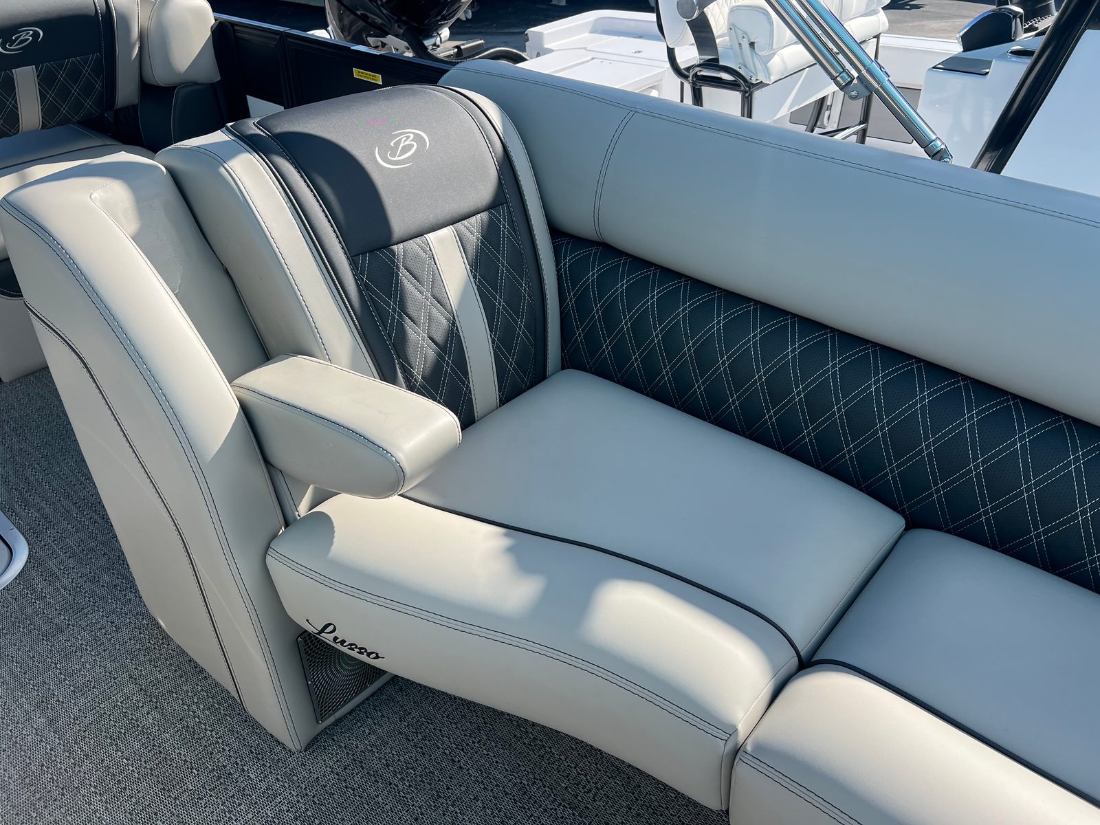 The Barletta Lusso L25MAT is packed with premium features designed to elevate your boating experience. As part of the Coastal Edition Lusso, this pontoon is built to withstand the rigors of coastal environments while maintaining its luxurious feel. The double bimini arch models provide versatile shade options, allowing you to enjoy sunny days without compromising on comfort. Exterior lighting, including white underdeck and underwater illumination, creates a captivating ambiance for evening cruises and dockside gatherings. The thoughtfully selected Marquesan Gray/Onyx furniture and Amore Gray flooring offer both durability and elegance, ensuring your pontoon remains inviting and stylish season after season.
