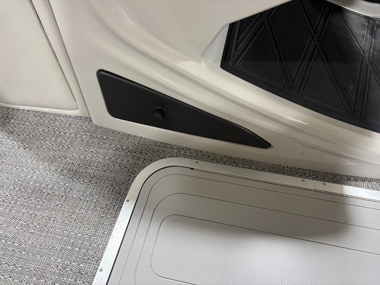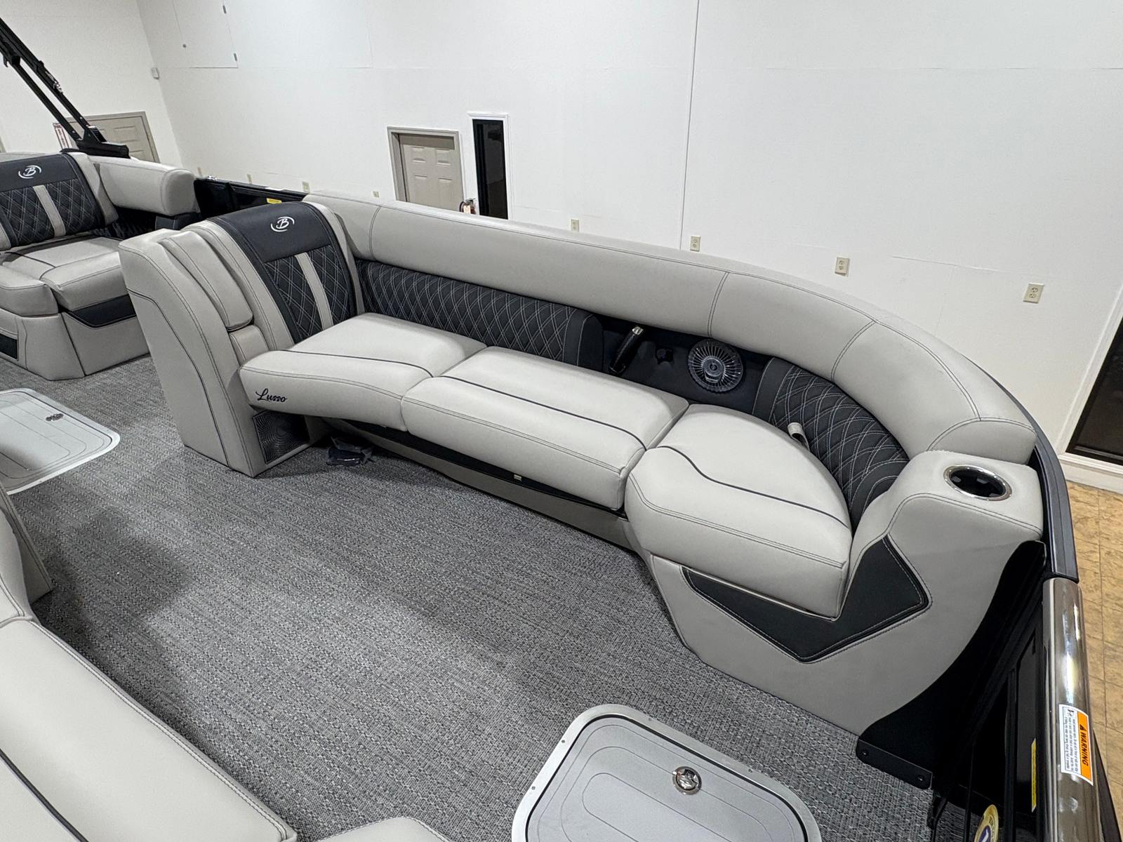 The Lusso L25U is packed with premium features that set it apart from other pontoon boats for sale. The Black Diamond sweep and accent colors, paired with the blackout package, create a striking visual impact. The Marquesan Gray with Onyx furniture offers plush seating and a sophisticated look, while the Amore Gray flooring provides both comfort and durability underfoot. Digital gauges keep you informed of all essential metrics, and the Mercury Digital DTS Pre-Rig ensures optimal engine performance. Exterior lighting, including white underdeck and underwater lights, adds a touch of elegance and enhances visibility during evening cruises. Hydraulic and power assist steering, along with digital controls, make operation smooth and intuitive, while the rigged engine with a stainless steel prop guarantees lasting reliability.