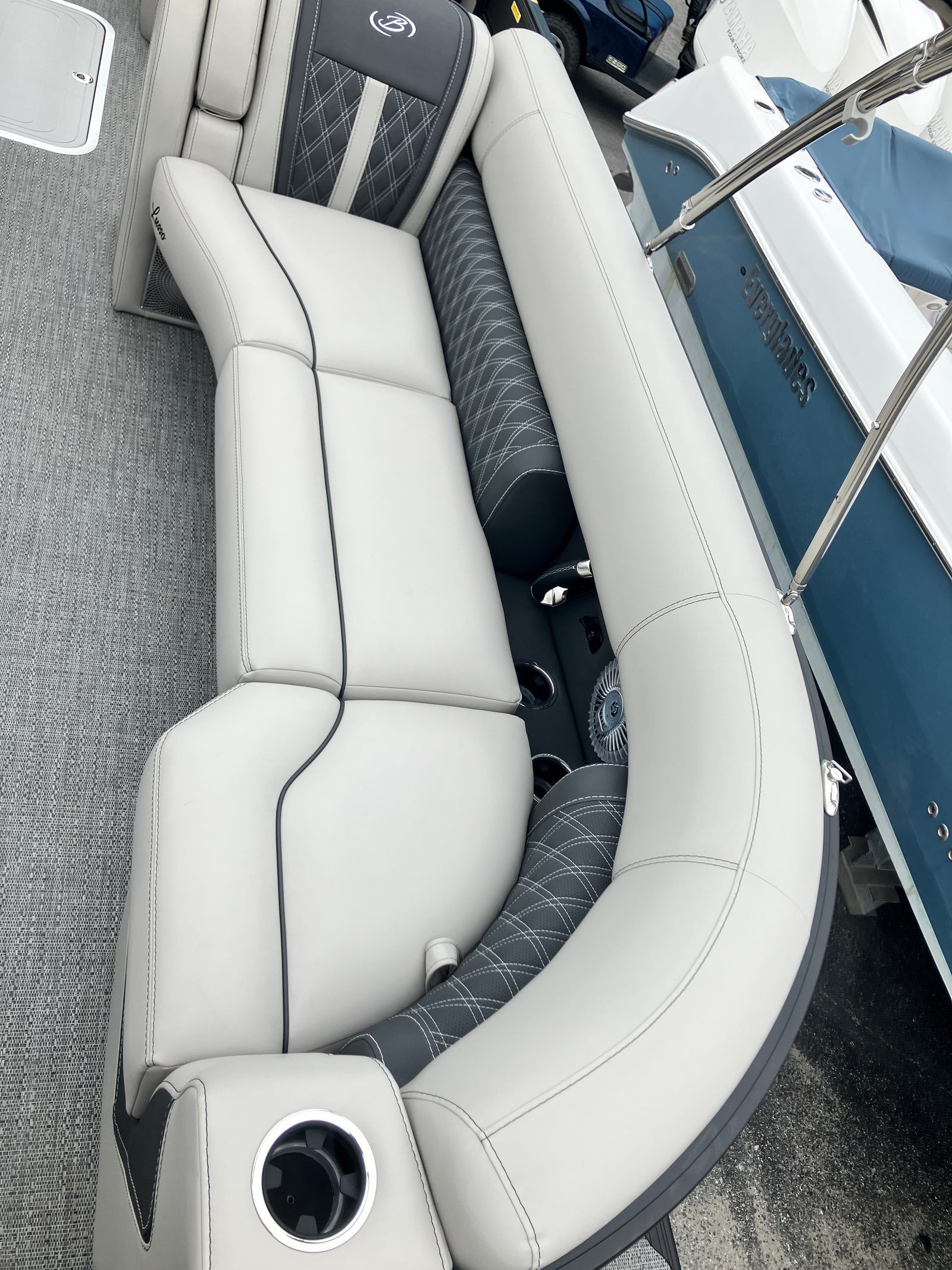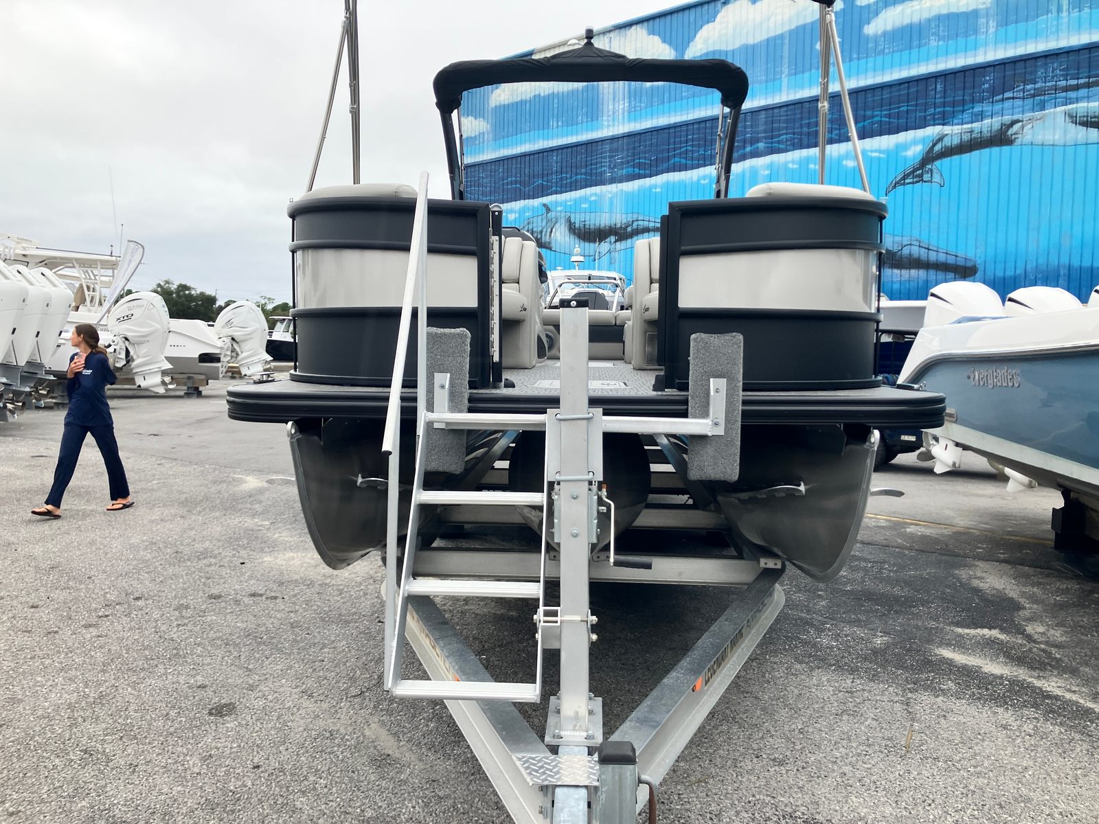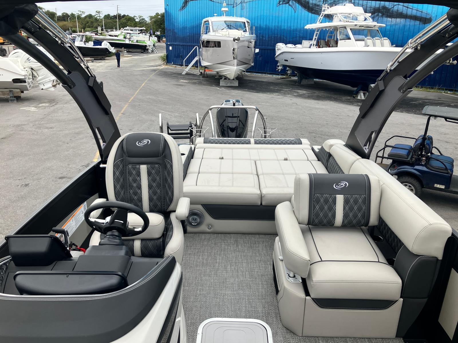 The 2026 Barletta Lusso L25UA is packed with features designed to enhance your boating experience. The Coastal Edition Lusso package is tailored for those who appreciate both style and substance, offering durability and elegance in equal measure. The Double Bimini Arch Models provide generous shade and a striking silhouette, making long days on the water more comfortable and enjoyable. The combination of Marquesan Gray with Onyx furniture and Amore Gray flooring creates a refined, contemporary interior that invites relaxation and socializing. The Blackout Package Lusso railskin and Matte Black sweep color with Champagne accents ensure that your pontoon boat stands out in any marina or on any lake.