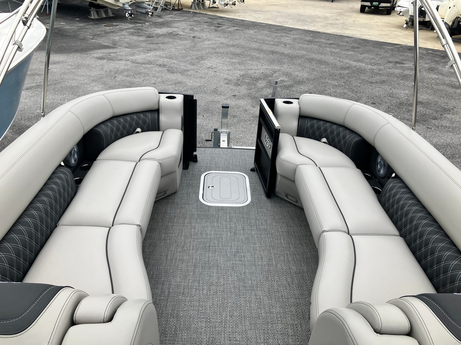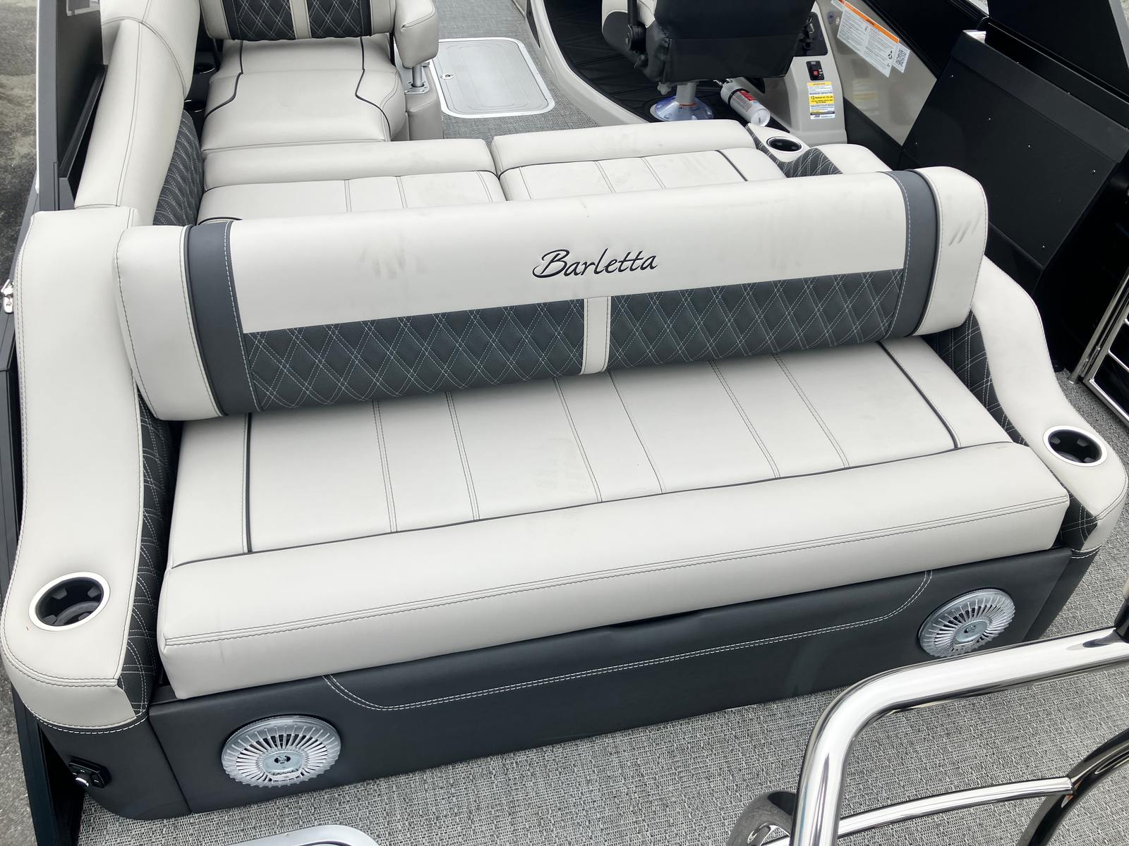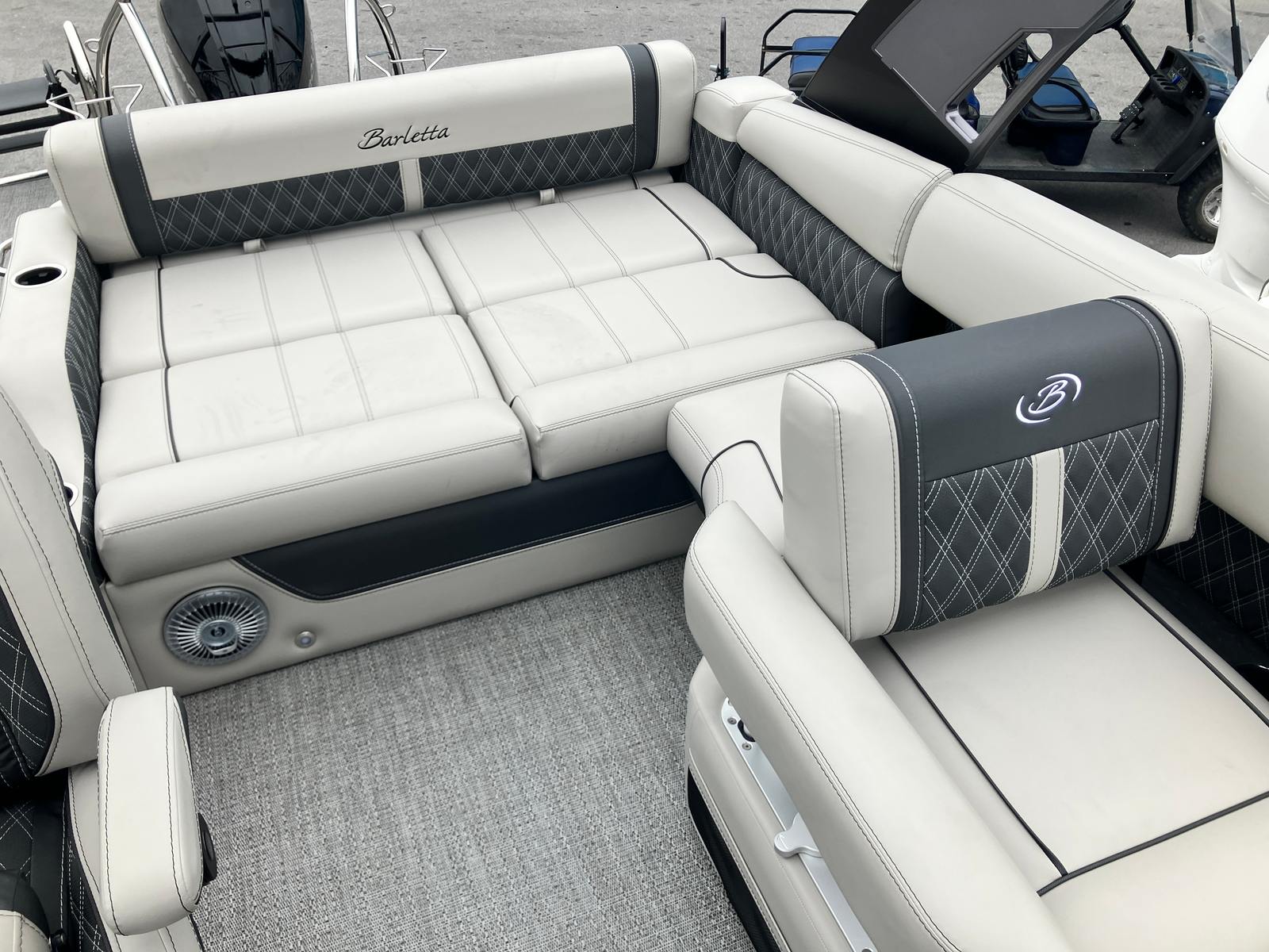 The 2026 Barletta Lusso L25UA is a testament to Barletta’s commitment to quality, innovation, and luxury. Measuring an impressive 27.5 feet in length, this pontoon boat offers ample space for entertaining, relaxing, and enjoying the open water. The Lusso L25UA’s sleek Matte Black sweep color, accented by a sophisticated Champagne hue, ensures that this boat turns heads wherever it goes. The Blackout Package Lusso railskin adds a bold, modern touch, while the Marquesan Gray with Onyx furniture and Amore Gray flooring create an inviting and upscale atmosphere onboard. As a new pontoon boat for sale, the Lusso L25UA is ready to deliver years of memorable adventures.