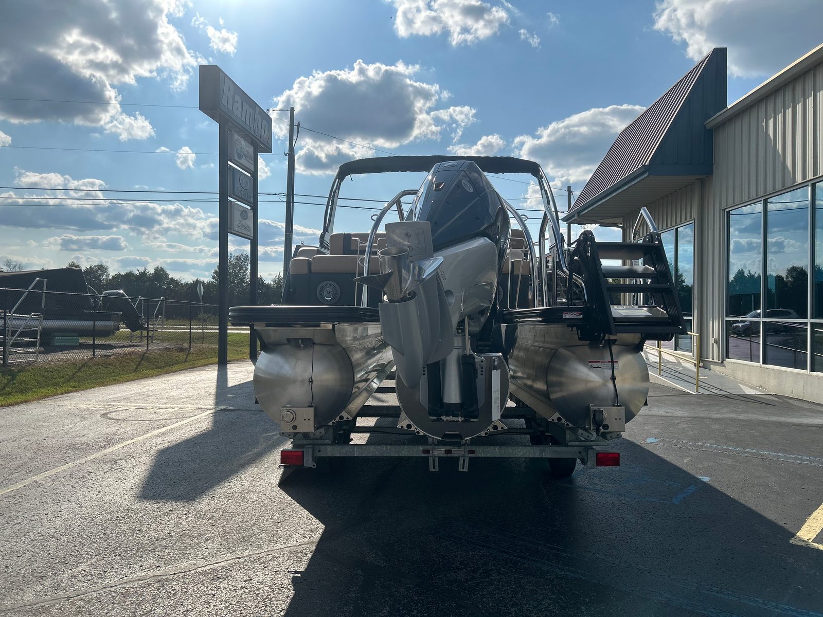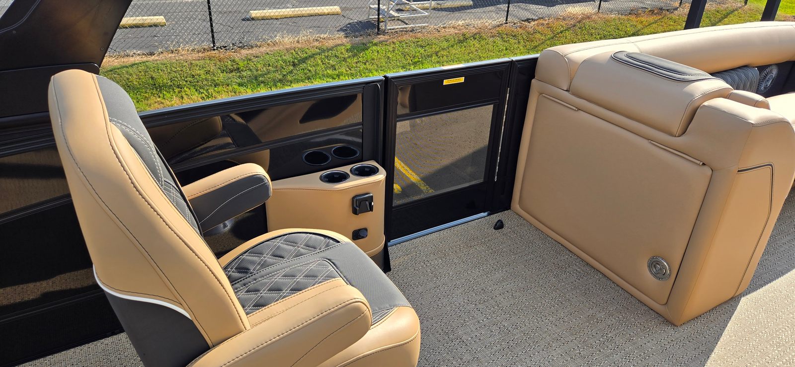 The 2026 Barletta Lusso L25UC is a showcase of premium features and sophisticated design. The exterior boasts a striking Black Diamond sweep color and accent color, complemented by the Blackout Package Lusso railskin, giving this pontoon a bold, modern look that turns heads at every marina. Step aboard and you’ll be greeted by Carmella Tan with Onyx furniture, offering plush comfort and a refined aesthetic. The Amore Tan flooring adds a touch of warmth and elegance, making every moment on deck feel like a luxury retreat.For those who love to entertain or relax in style, the Sport Bimini (installed in place of the standard bimini) provides ample shade and protection from the sun, allowing you to enjoy long days on the water in comfort. The white underdeck and underwater exterior lighting create a captivating ambiance for evening cruises, making every sunset and starlit night even more magical.