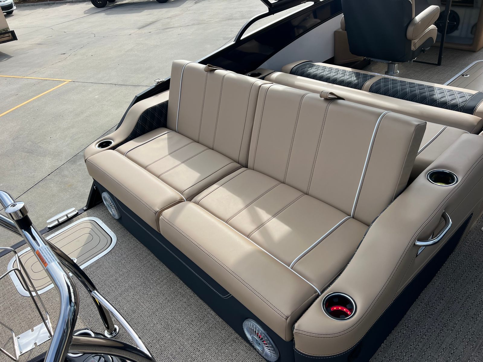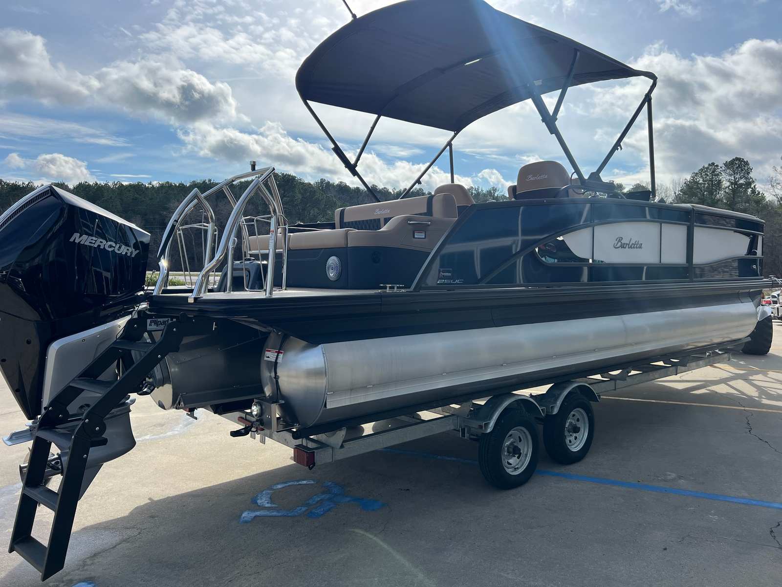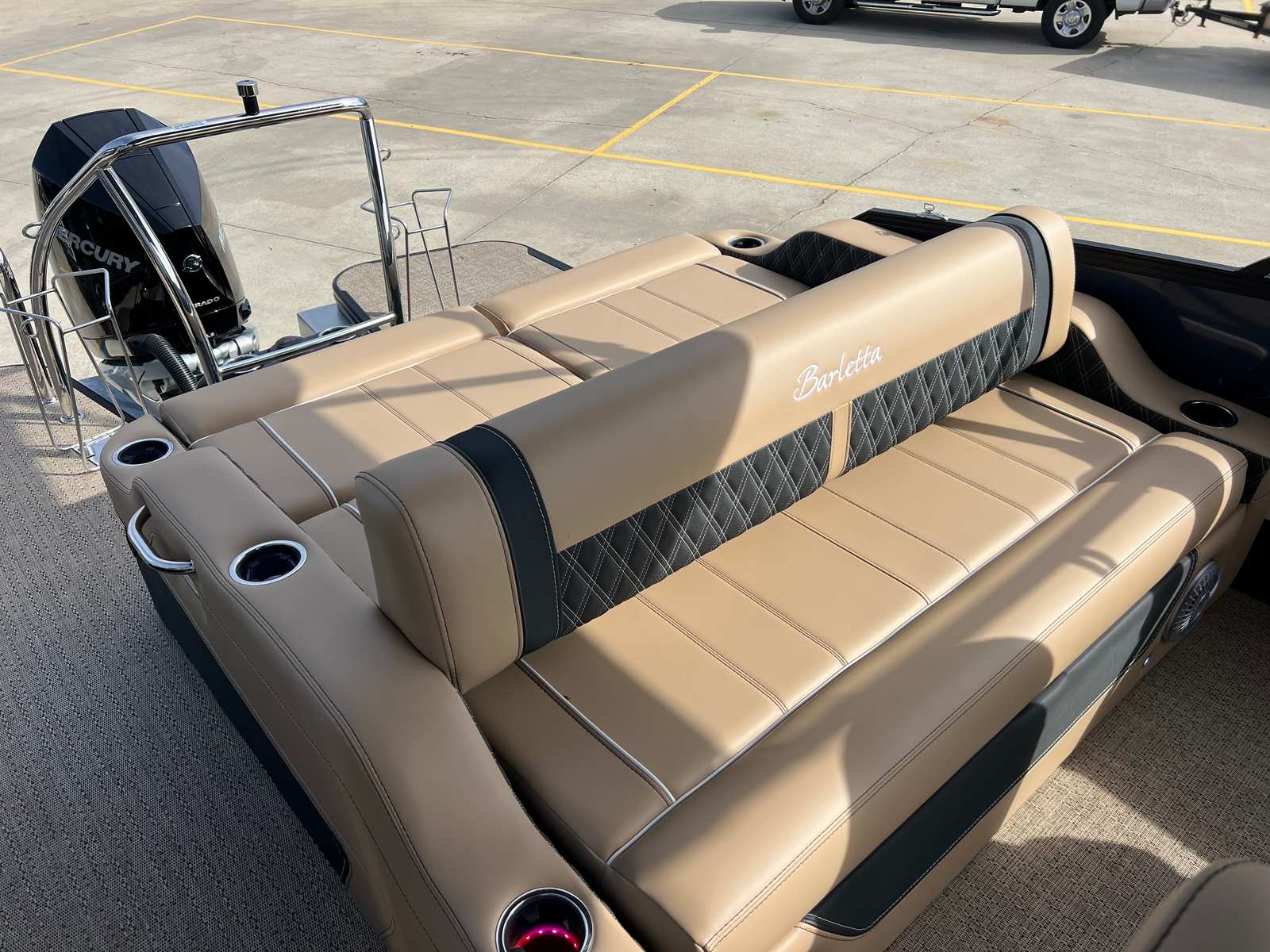 The 2026 Barletta Lusso L25UC is loaded with premium features designed to elevate your time on the water. The Blackout Package Lusso railskin adds a touch of modern sophistication, while the Blue Sapphire and Winter White color scheme ensures you stand out from the crowd. The Carmella Tan with Onyx furniture offers plush seating and ergonomic support, perfect for long days of relaxation or lively gatherings. Amore Tan flooring provides a soft, slip-resistant surface that is both stylish and practical.This pontoon boat is equipped with Mercury Digital DTS Pre-Rig for VERADO engines with Vessel Link, ensuring seamless integration and control of your engine systems. Hydraulic and power assist steering make handling effortless, while digital gauges provide real-time information at a glance. The rigged engine with a stainless steel prop ensures optimal performance and durability. For added convenience, the boat is pre-wired for an additional bimini, allowing you to customize your shade and comfort options. The onboard battery charger with two batteries ensures you have reliable power for all your electronic needs throughout the day.