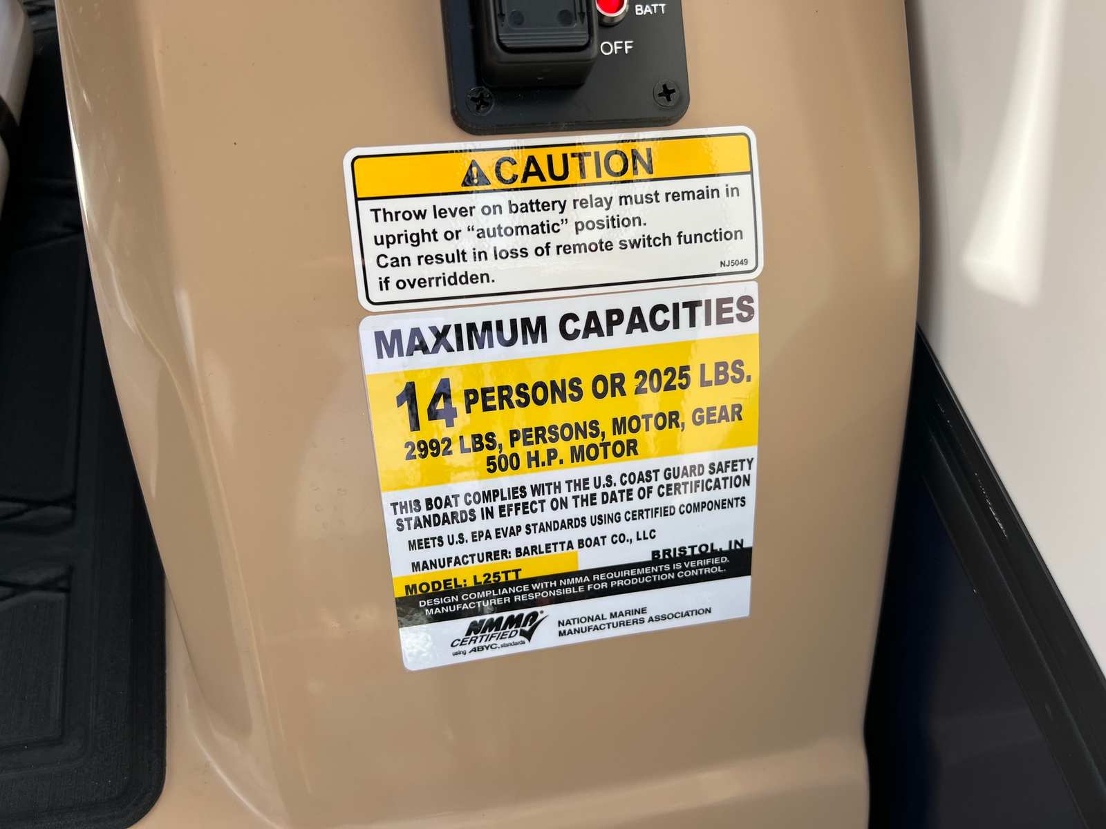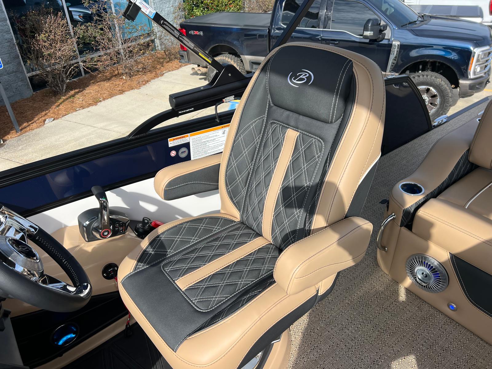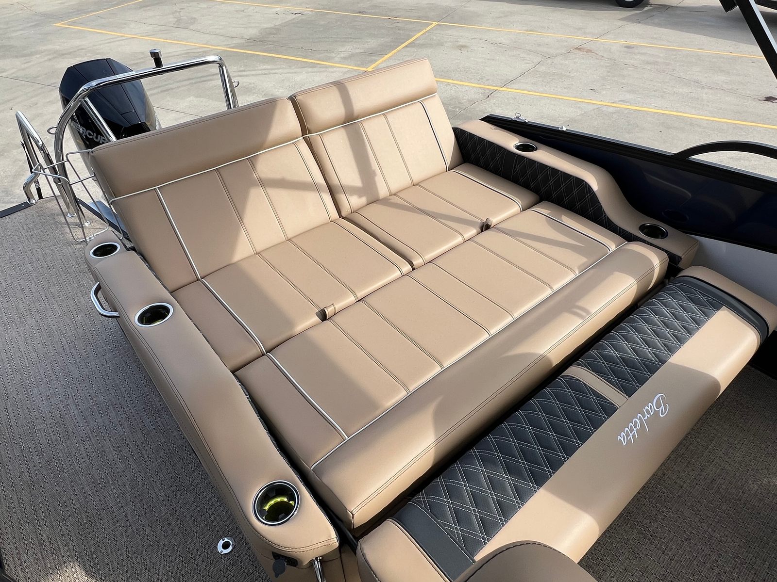 The 2026 Barletta Lusso L25UC is loaded with premium features designed to elevate your time on the water. The Blackout Package Lusso railskin adds a touch of modern sophistication, while the Blue Sapphire and Winter White color scheme ensures you stand out from the crowd. The Carmella Tan with Onyx furniture offers plush seating and ergonomic support, perfect for long days of relaxation or lively gatherings. Amore Tan flooring provides a soft, slip-resistant surface that is both stylish and practical.This pontoon boat is equipped with Mercury Digital DTS Pre-Rig for VERADO engines with Vessel Link, ensuring seamless integration and control of your engine systems. Hydraulic and power assist steering make handling effortless, while digital gauges provide real-time information at a glance. The rigged engine with a stainless steel prop ensures optimal performance and durability. For added convenience, the boat is pre-wired for an additional bimini, allowing you to customize your shade and comfort options. The onboard battery charger with two batteries ensures you have reliable power for all your electronic needs throughout the day.