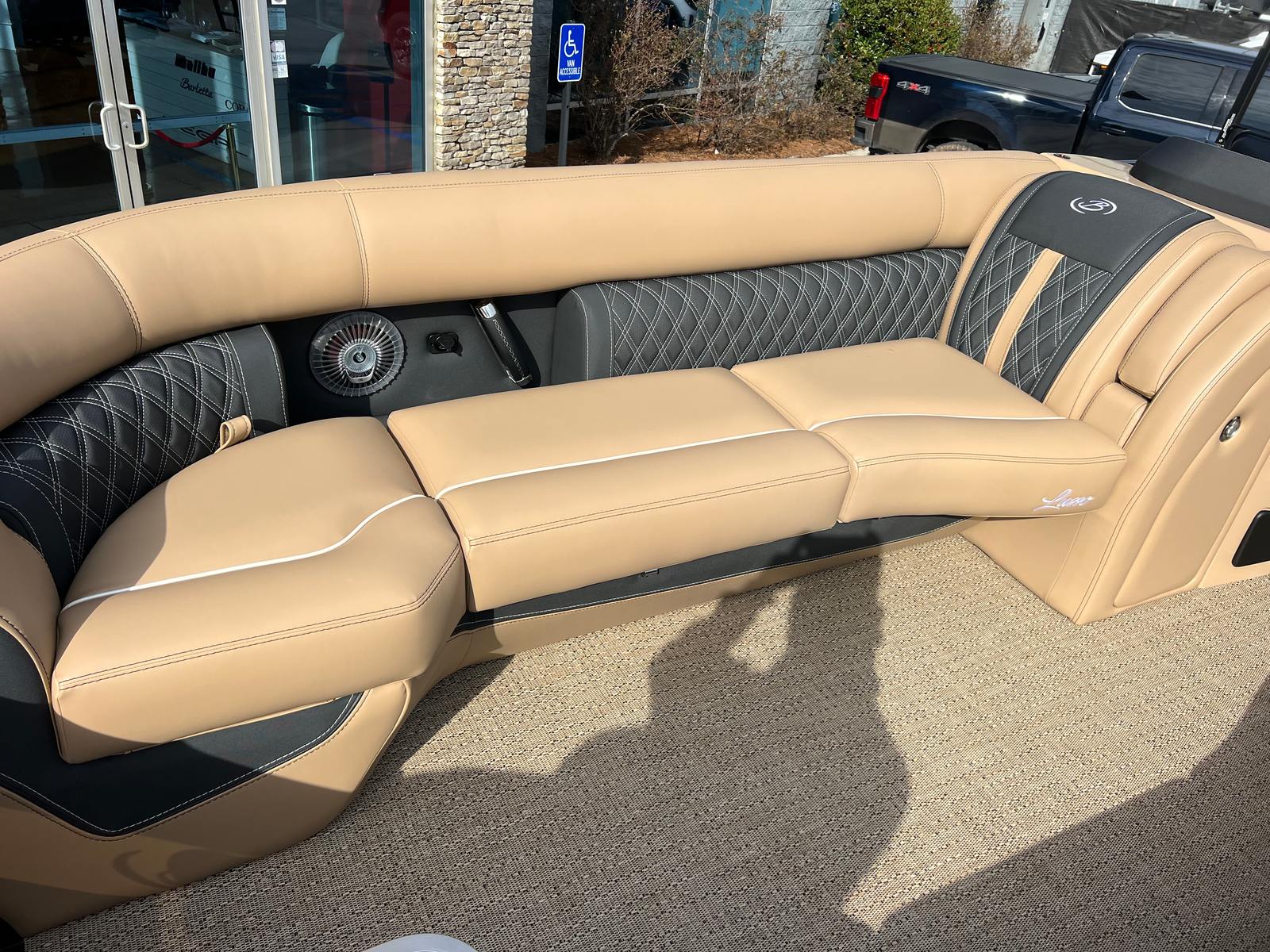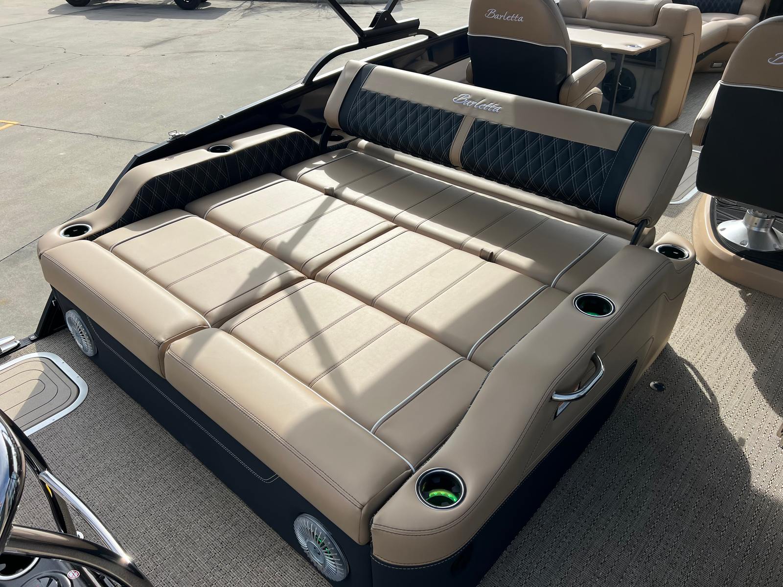 The 2026 Barletta Lusso L25UC stands out as a premier pontoon boat, measuring an impressive 27.5 feet in length. This spacious layout provides ample room for family, friends, and all your favorite water activities. The Lusso L25UC is designed with both relaxation and entertainment in mind, making it the perfect vessel for those who appreciate the finer things in life. With its striking Blue Sapphire sweep color, complemented by a Winter White accent and the Blackout Package Lusso railskin, this pontoon commands attention wherever it goes. The Carmella Tan with Onyx furniture and Amore Tan flooring create a warm, inviting atmosphere that exudes comfort and elegance.