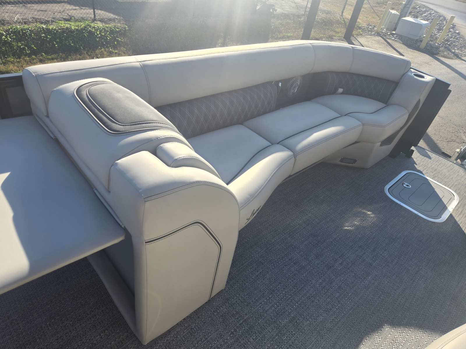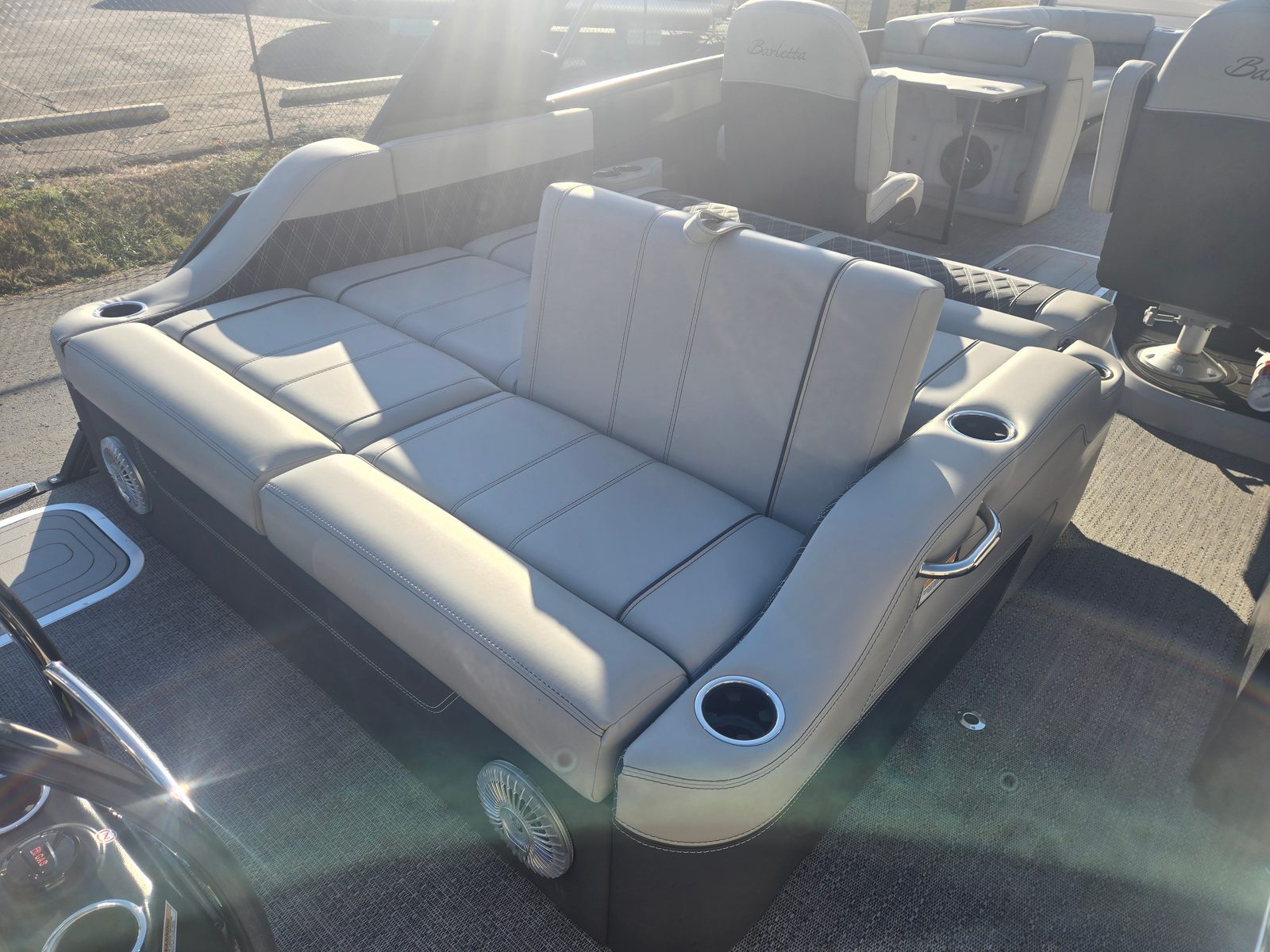 Step aboard the Lusso L25UCA and you’ll immediately notice the Marquesan Gray furniture with Onyx accents, creating a sophisticated and inviting atmosphere. The flooring features Amore Gray, offering both durability and a modern aesthetic that complements the boat’s overall design. The exterior lighting package includes white underdeck and underwater lights, adding a touch of elegance and enhancing visibility during evening outings.The Lusso L25UCA is equipped with the Blackout Package Lusso railskin, which, paired with the Gray Moonstone sweep color and Black Diamond accent color, gives the boat a striking and contemporary look. These design elements not only elevate the boat’s visual appeal but also reflect Barletta’s dedication to craftsmanship and style.