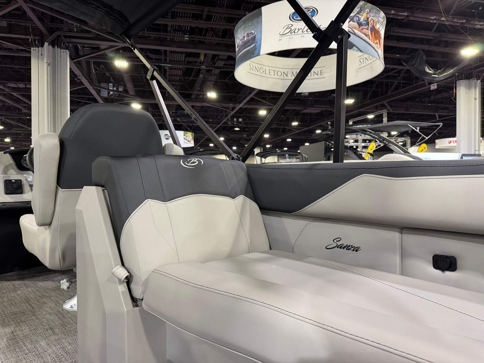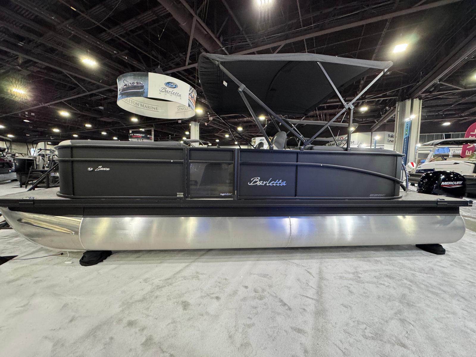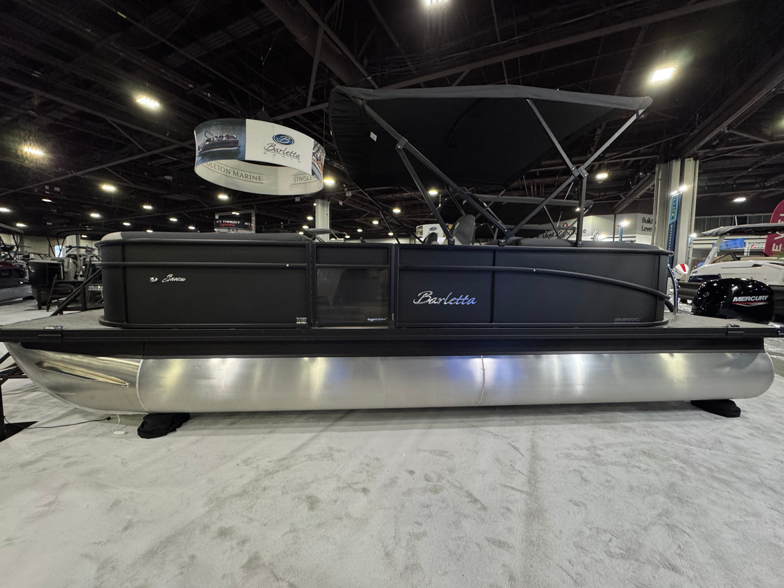 The Barletta Sanza S22QC is packed with special features that elevate your boating experience. The Matte Black Railskin color and Blackout Package Sanza provide a striking exterior look, while the Marquesan Gray with Onyx furniture offers plush seating and a contemporary vibe. The Amore Gray flooring is not only stylish but also durable and easy to maintain, ensuring your boat stays looking great season after season.One of the standout features is the Triple Toon Package Sanza, which adds an extra pontoon for enhanced stability and performance. This package also enables the inclusion of in-floor midship storage, providing ample space to stow your gear, water toys, and personal items securely and conveniently. The Mercury mechanical pre-rig and rigging with a standard prop make engine setup straightforward, so you can spend less time preparing and more time enjoying the water.