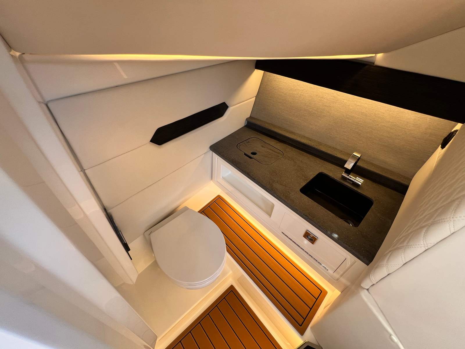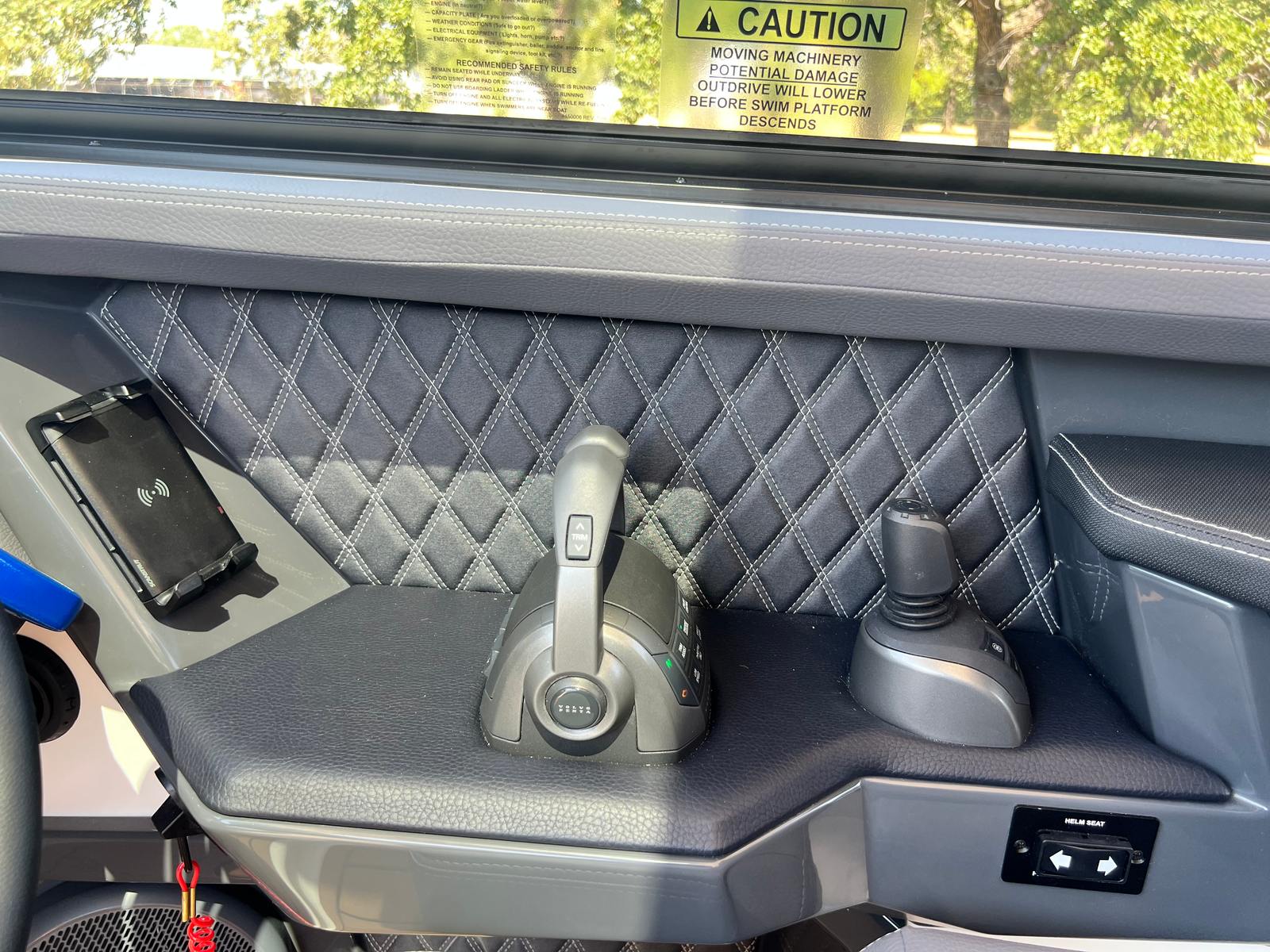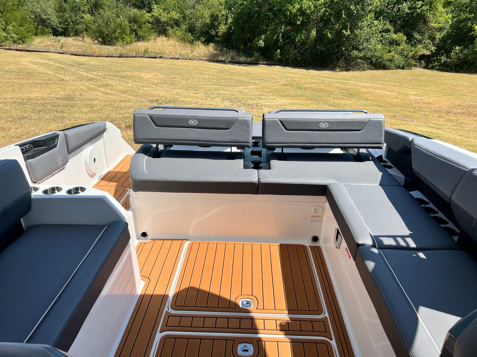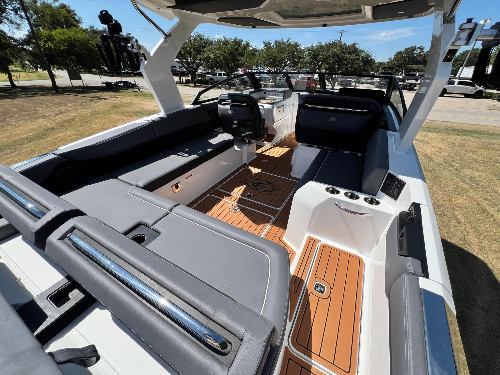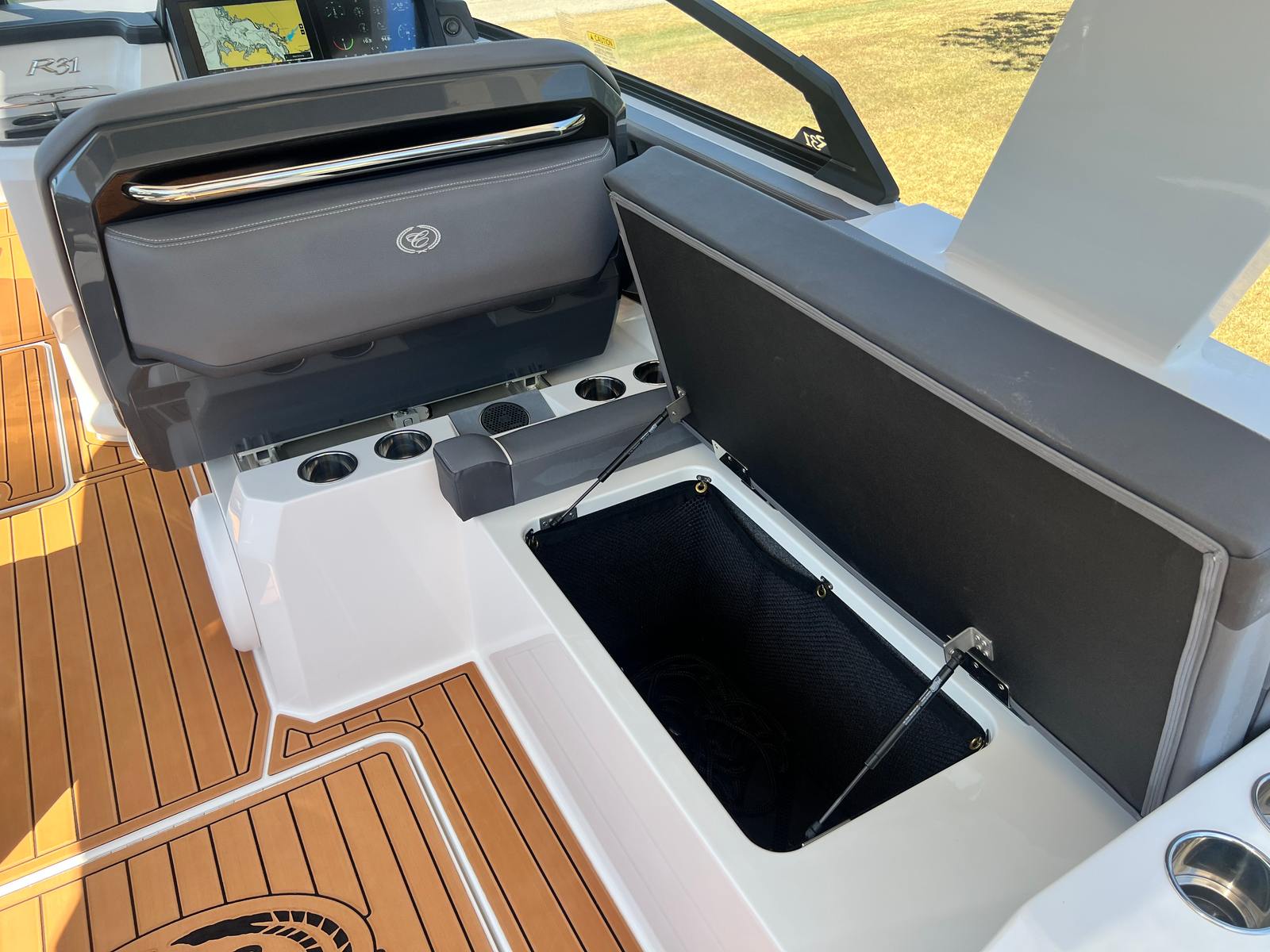The Cobalt R31 Surf is as practical as it is beautiful. Its generous storage options, including the closet-watersports compartment and storage tub for fender lines, make it easy to keep your boat organized and clutter-free. The battery maintainer/charger ensures your boat is always ready to go, minimizing downtime and maximizing your time on the water.Docking and maneuvering are simplified thanks to the twin engines and joystick control, giving you confidence in tight spaces and busy marinas. The rear-facing camera adds an extra layer of safety, making it easier to keep an eye on swimmers, wakeboarders, or obstacles behind the boat. The electric adjustable seat and spacious cockpit allow for effortless transitions between activities, whether you’re cruising, dining, or gearing up for watersports.