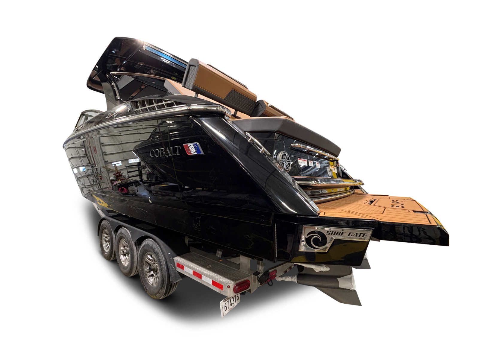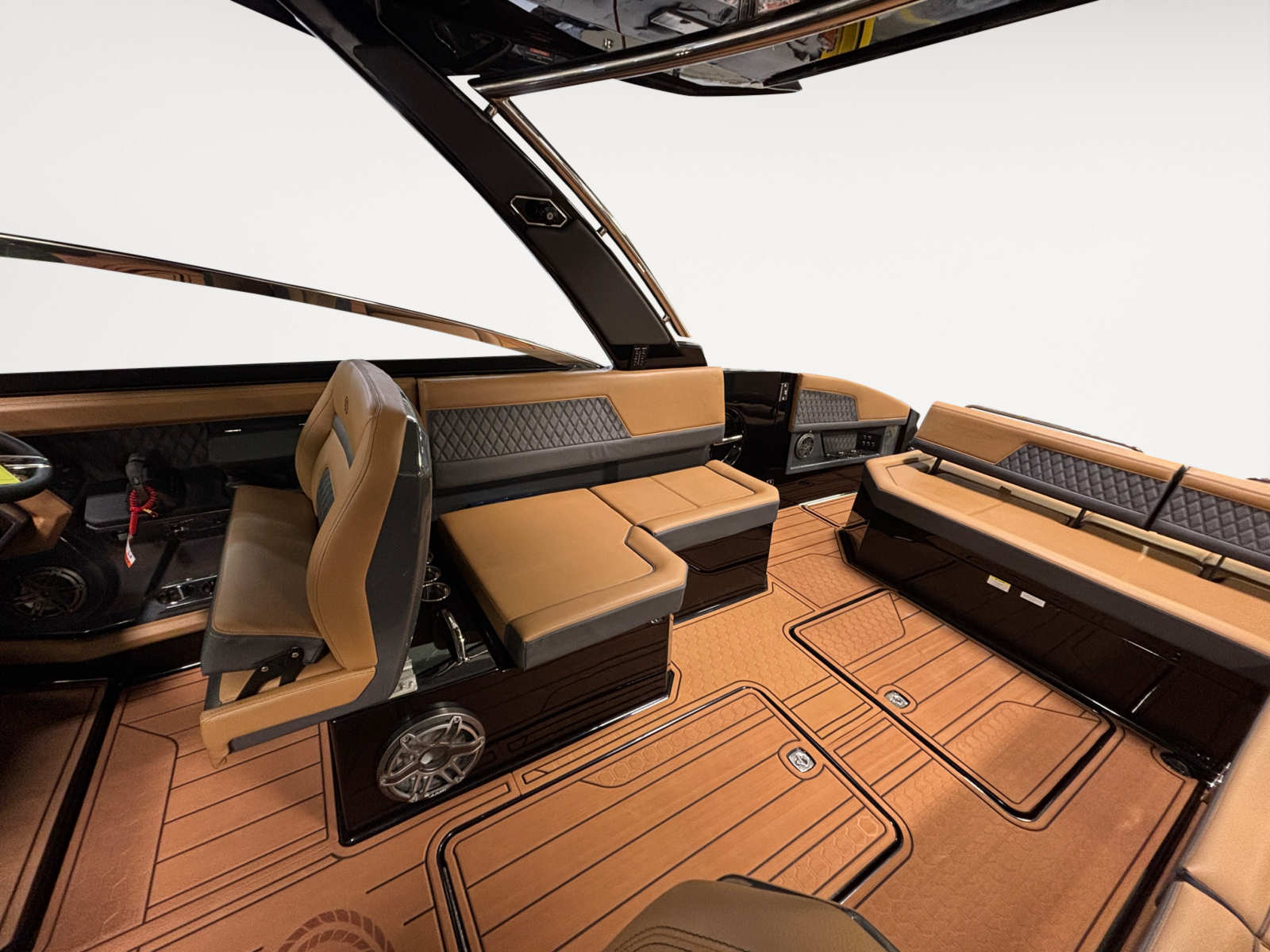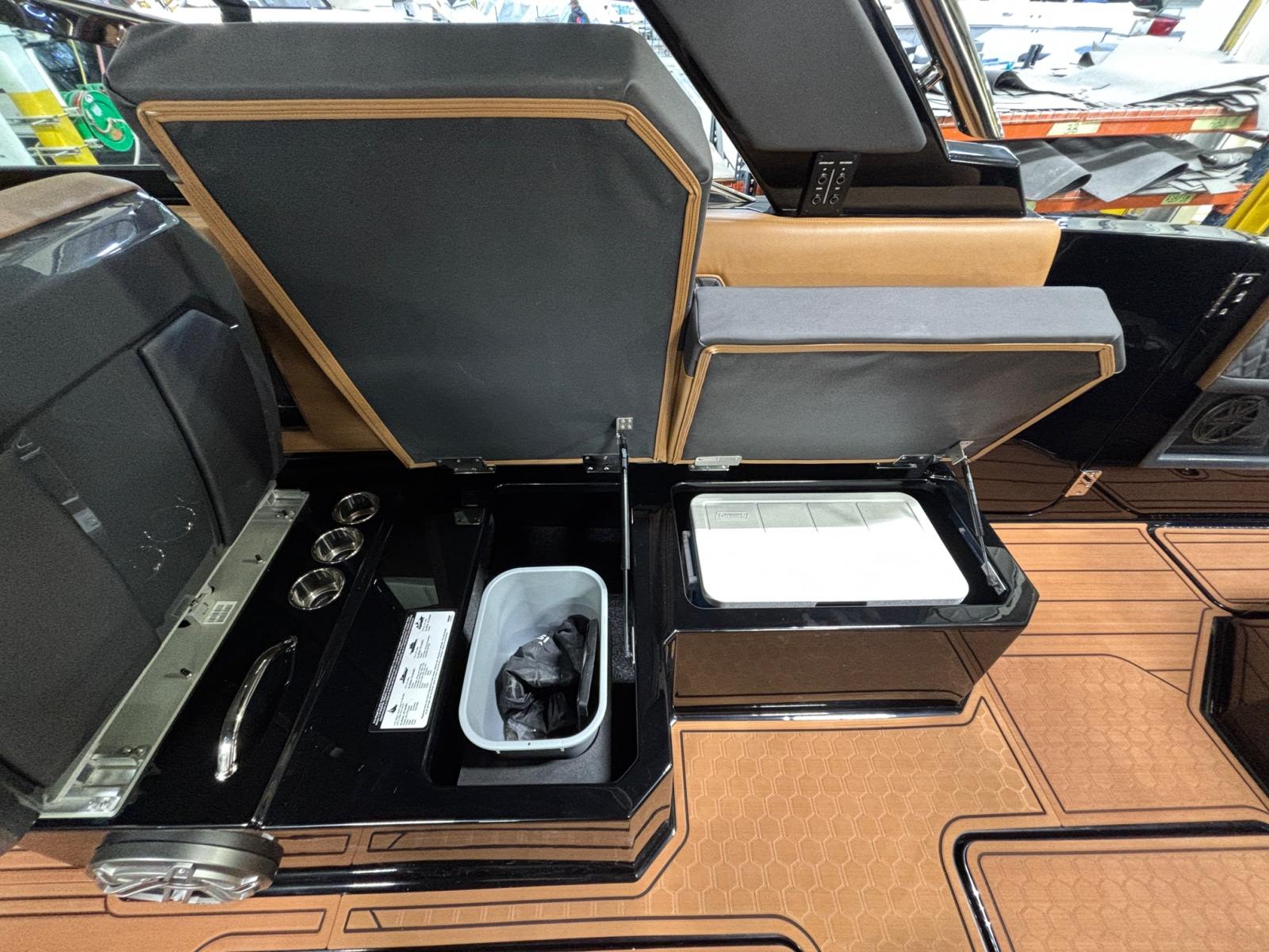 The Cobalt R33 Surf is packed with premium features that elevate your boating experience. The arch with hard top provides both style and functionality, offering shade and protection from the elements while maintaining an open and airy feel. The electric awning in sleek black extends effortlessly, creating a comfortable space for relaxation or entertaining guests. The aft walk-thru gate and boarding door make it easy to access the water or dock, enhancing safety and convenience for everyone on board.Inside, the cockpit showcases a luxurious interior finished in Caramel, Carbon, and Ebony, creating a sophisticated and inviting atmosphere. The Cobalt letters with flag emblem in black satin add a touch of elegance and brand distinction. For those cooler days on the water, the cockpit heater ensures that everyone stays warm and comfortable, extending your boating season well into the cooler months.Additional features such as the battery maintainer/charger (110V) keep your boat ready for action, while the board rack covers and PTM provide practical solutions for storing and protecting your gear. Every detail of the R33 Surf is designed with the owner’s comfort and convenience in mind.