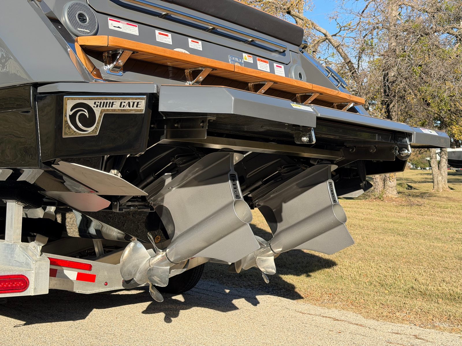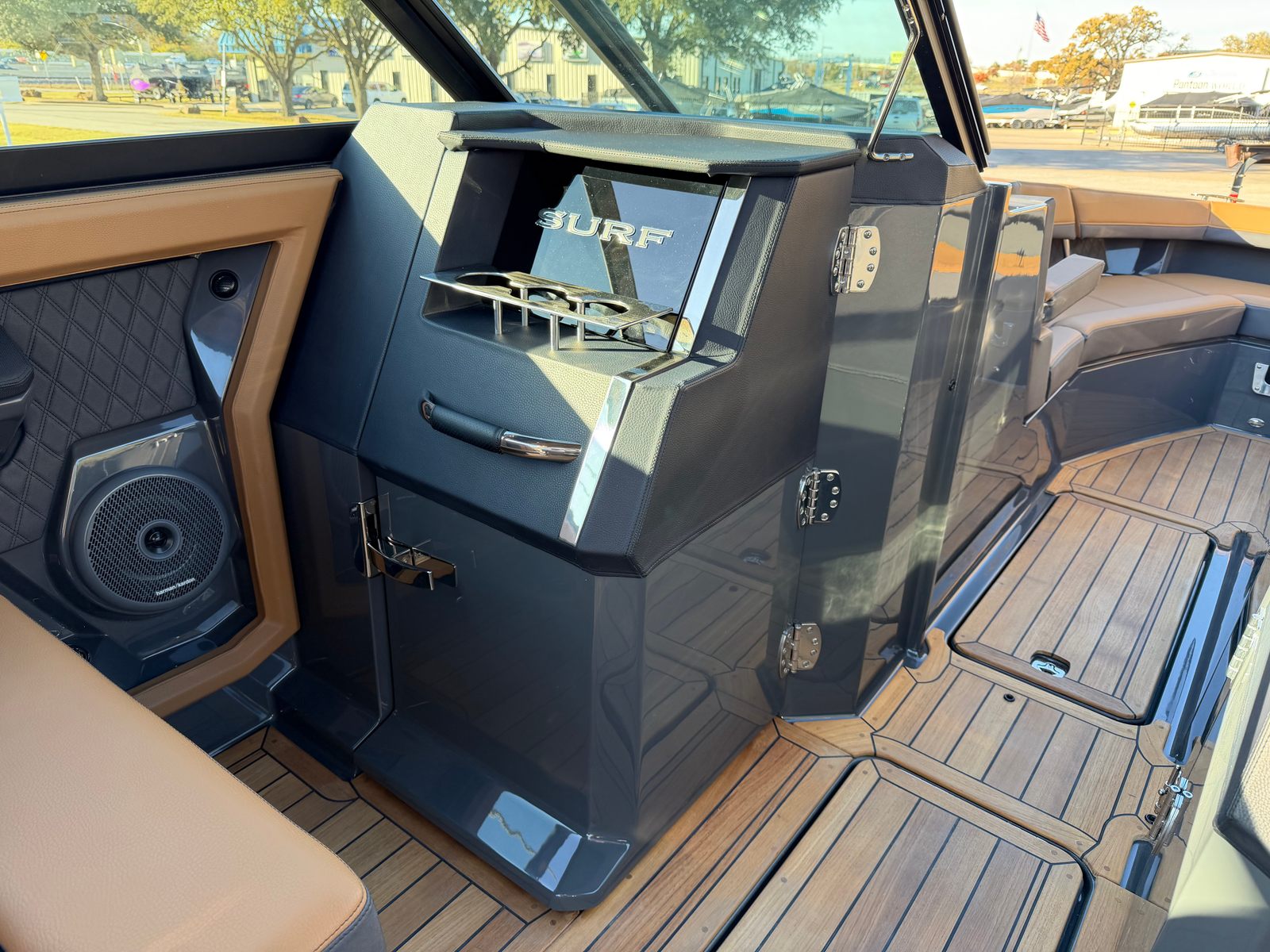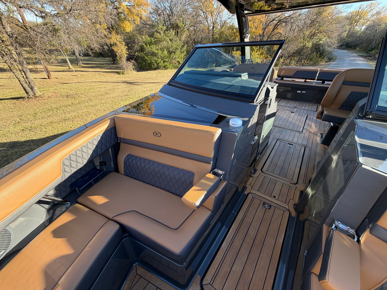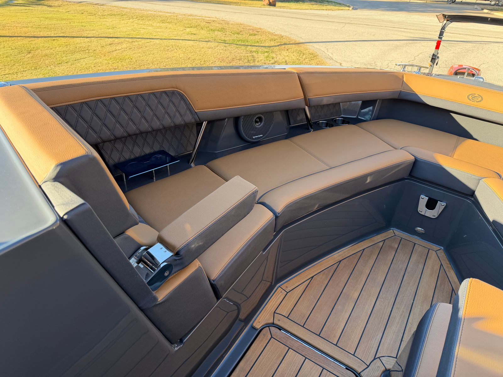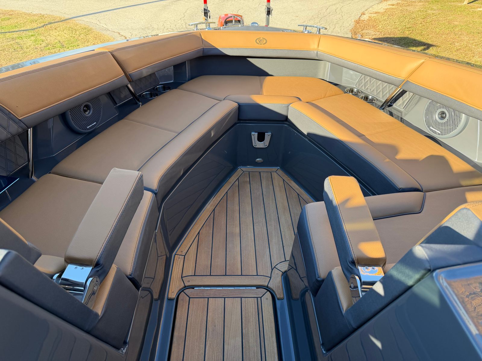 Powering the Cobalt R33 Surf are two robust engines, delivering a combined 860 horsepower for an exhilarating ride. This dual-engine setup ensures smooth acceleration, responsive handling, and the ability to tackle a variety of water conditions with ease. Whether you’re carving through waves, cruising at high speeds, or enjoying a leisurely day on the water, the R33 Surf’s performance capabilities are second to none. The advanced surf technology integrated into this Bowrider allows for customizable wave creation, making it a top choice for watersports enthusiasts who want to master wake surfing, wakeboarding, or simply enjoy the thrill of powerful propulsion.